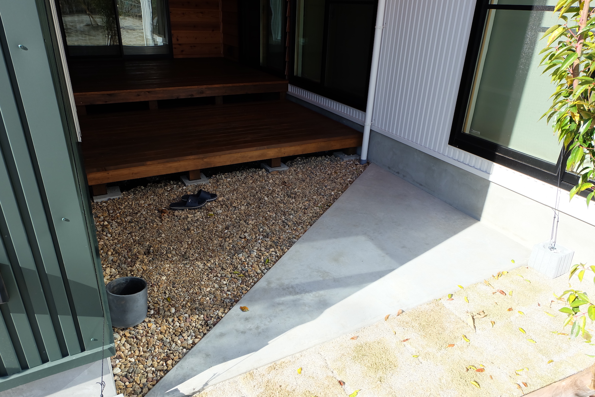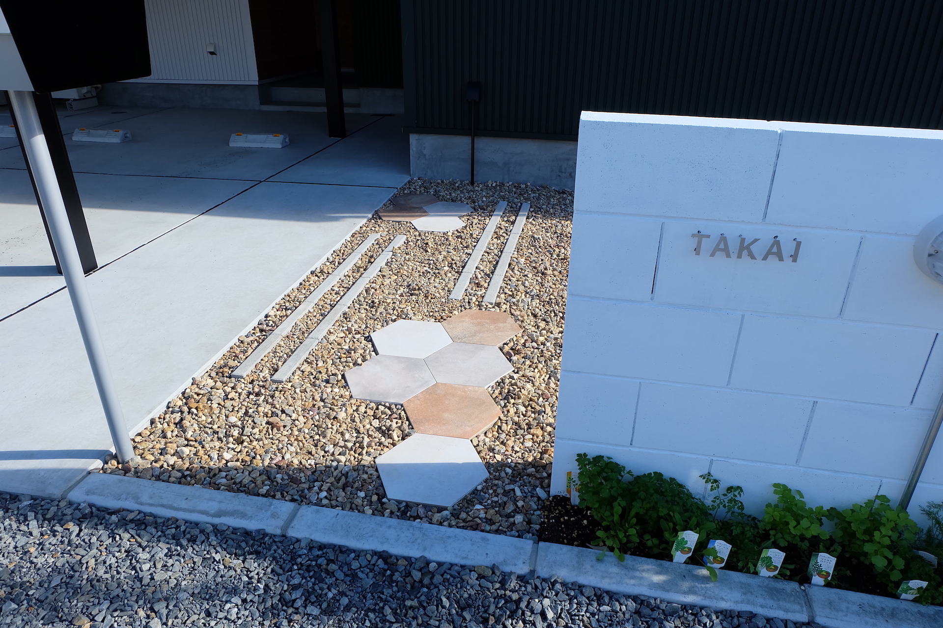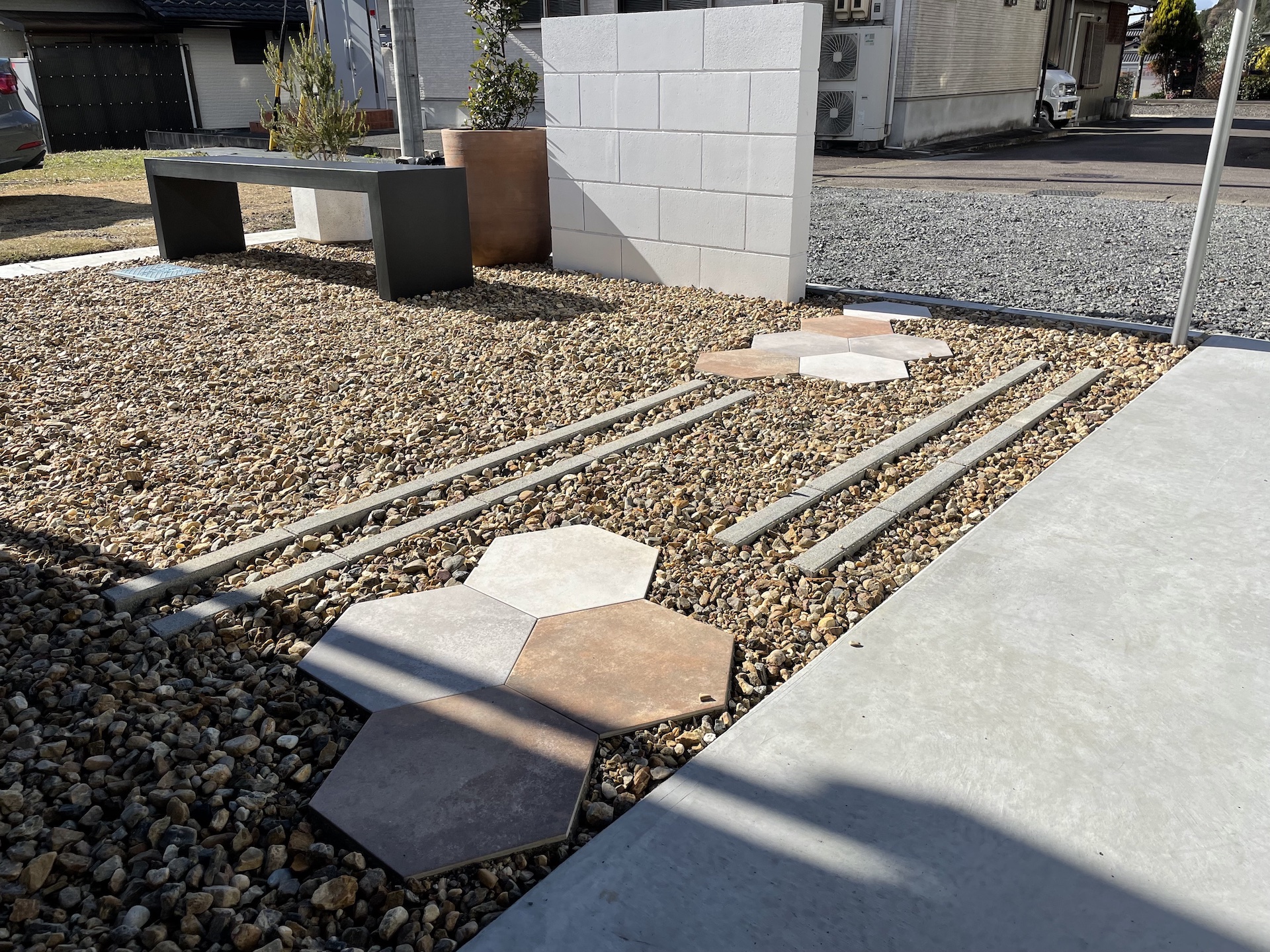 ヘキサゴンのタイルが目を引くアプローチと隣には鉢植えの植栽と