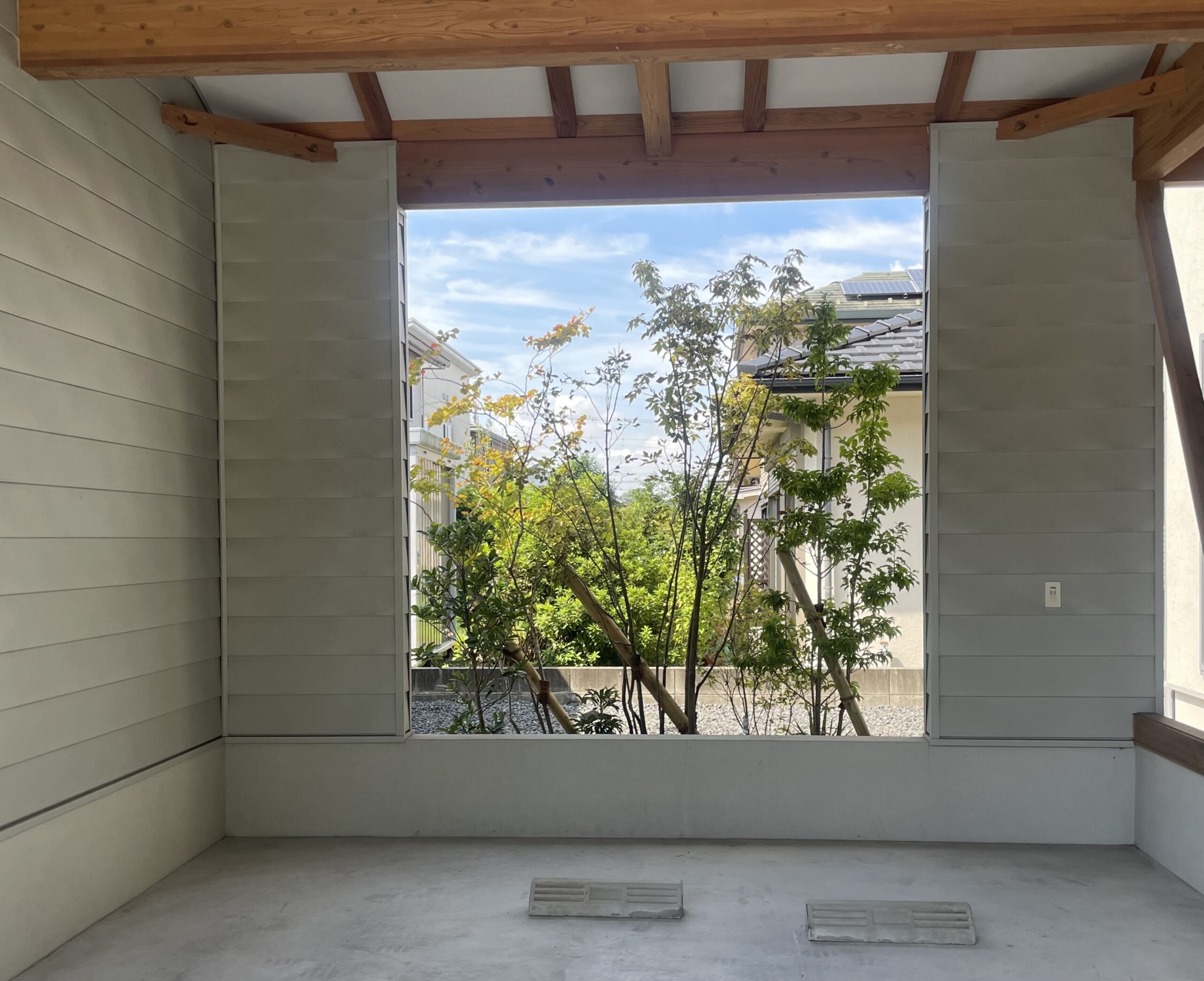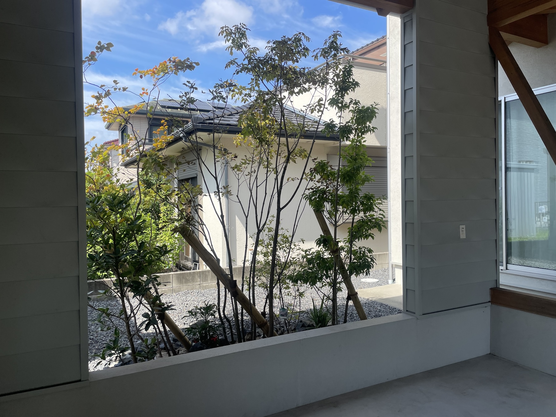 緑化ブロック/駐車場/天然木のフェンス/バイクガレージ 和モダンでガレージのある駐車場のあるお宅に合わせて 外構で使う材料の素材は天然の物にこだわり あまり主張感のないデザインにしました その代わり、ガレージから見える植物は多めに入れて ピクチャウインドウのようなイメージで植物を植え込みました 玄関前は枝流れが美しい樹木を選別植え込みしています