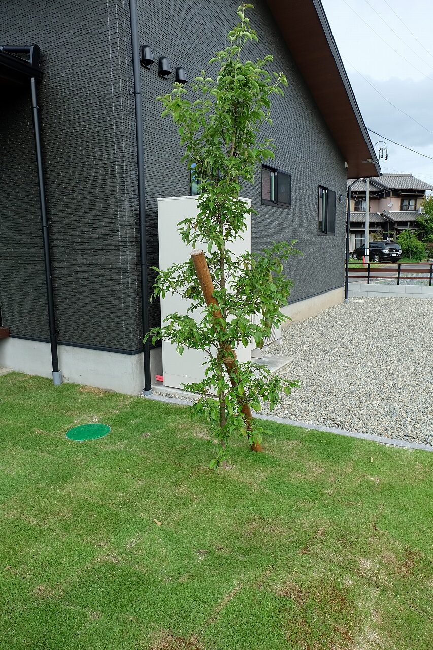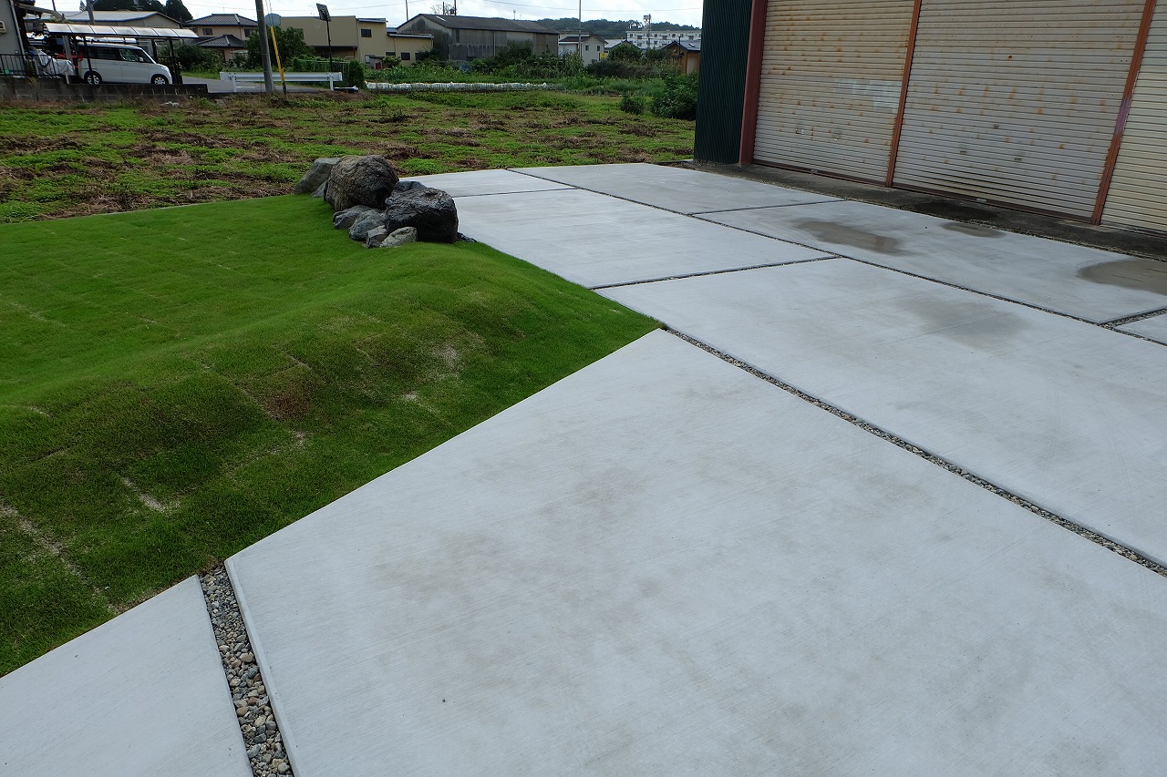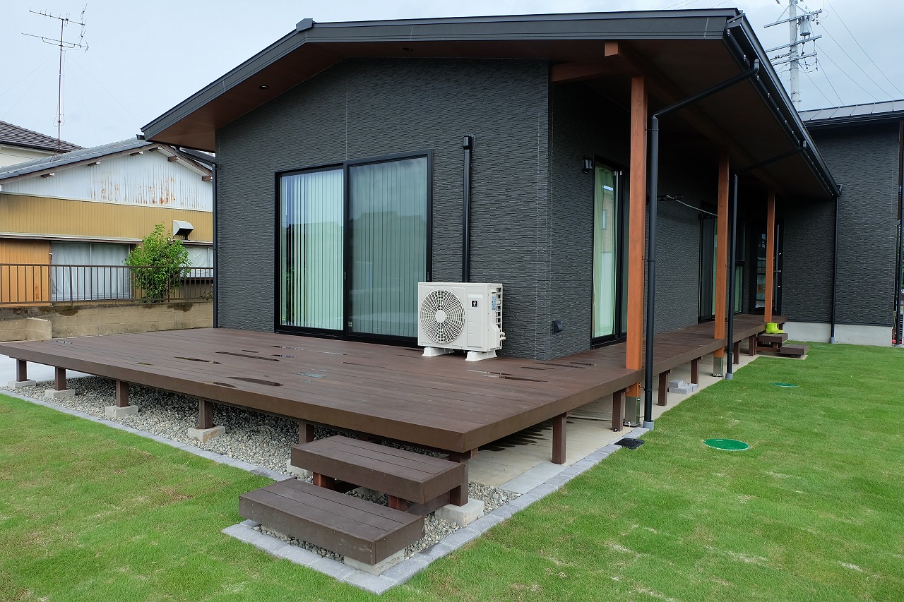 駐車場/ウッドデッキ/フェンス/門/芝生 車が面した道路から宅内へ入ると 広々とした芝生が広がります。 全てのリビング窓ガラスからウッドデッキと芝生が繋がっている為 とても開放的な空間に仕上がりました。 玄関へと続くアプローチは夜にはライトが床面を照らしている ので、とても幻想的でお洒落なデザインです。