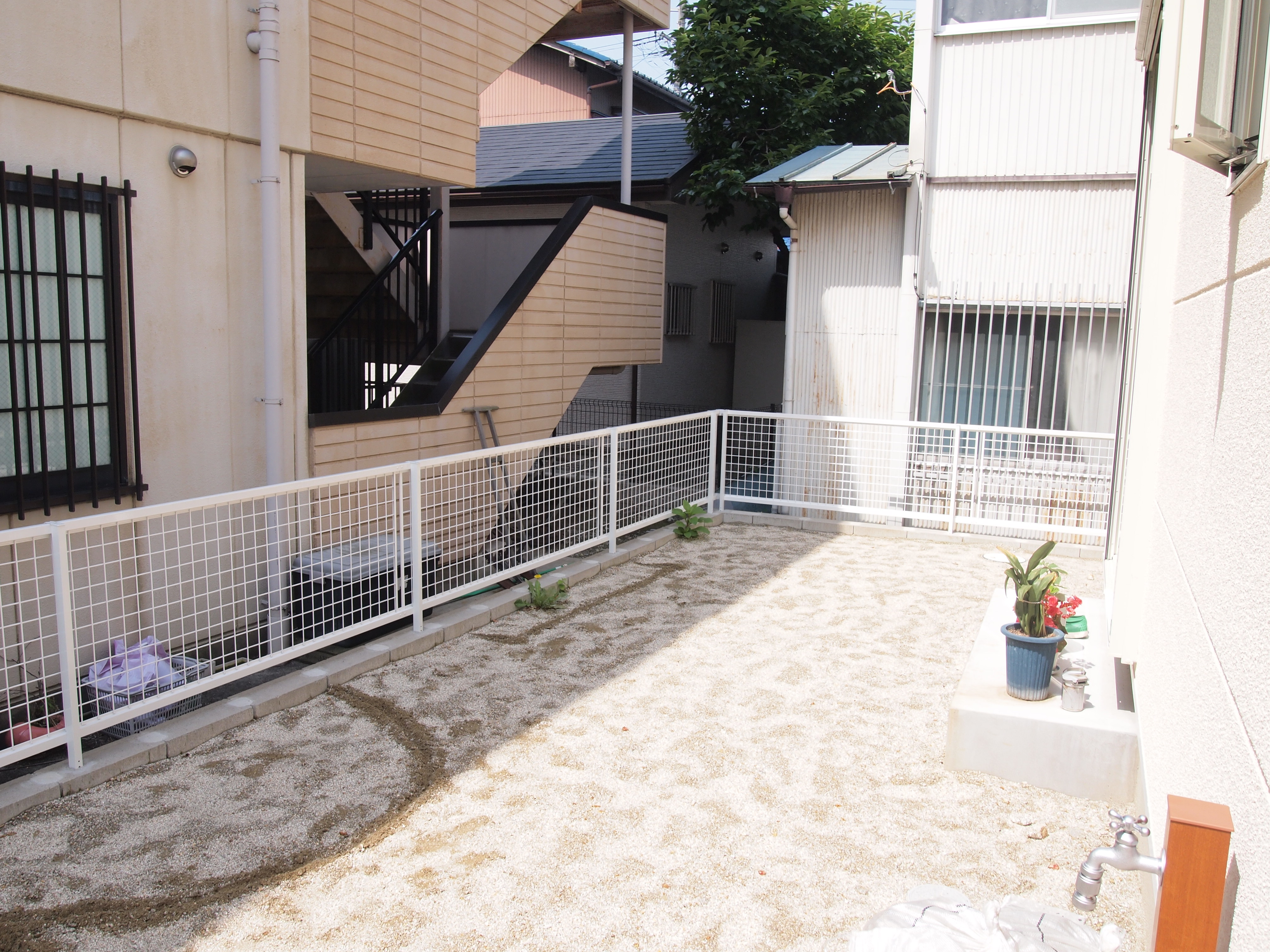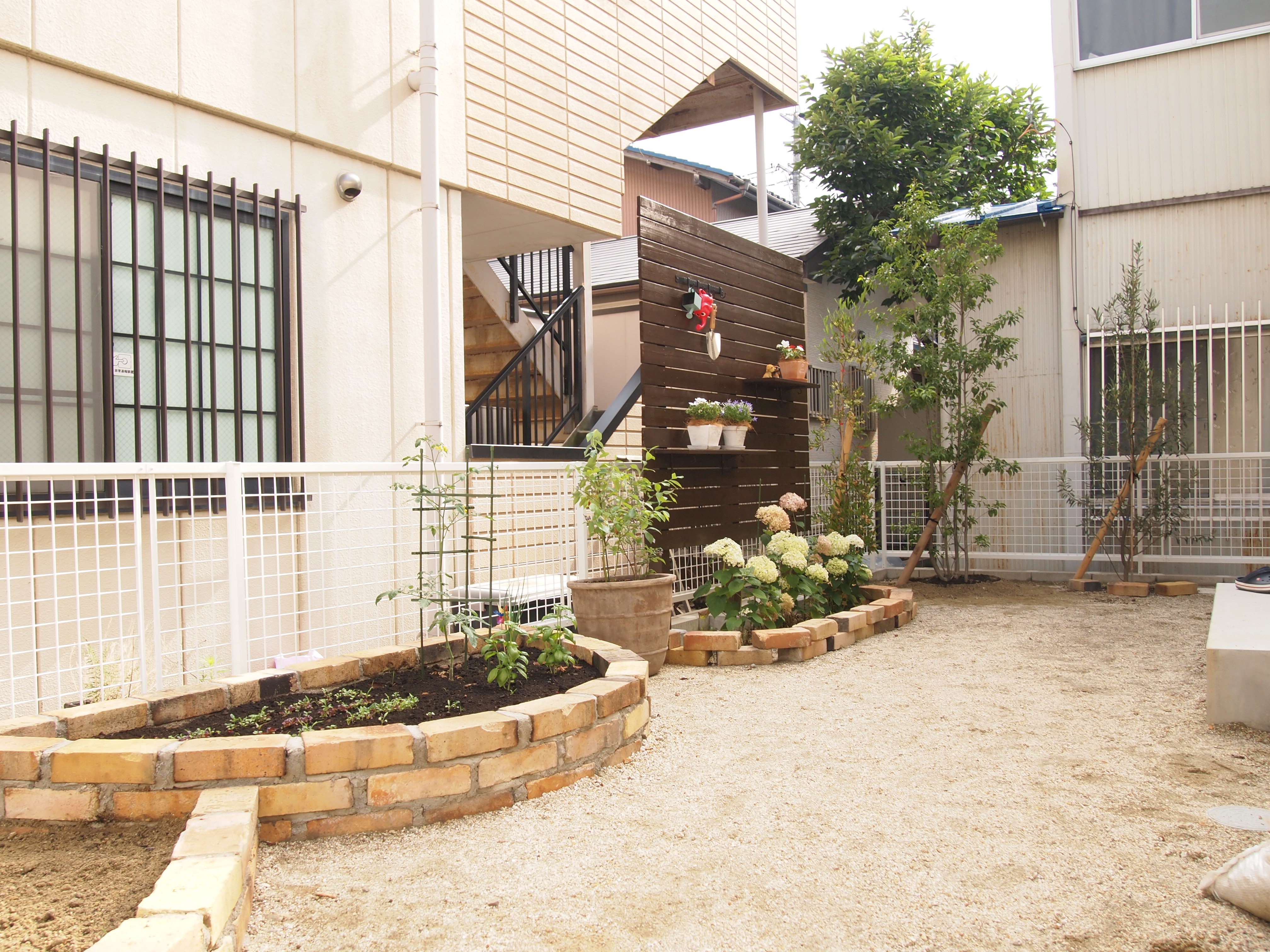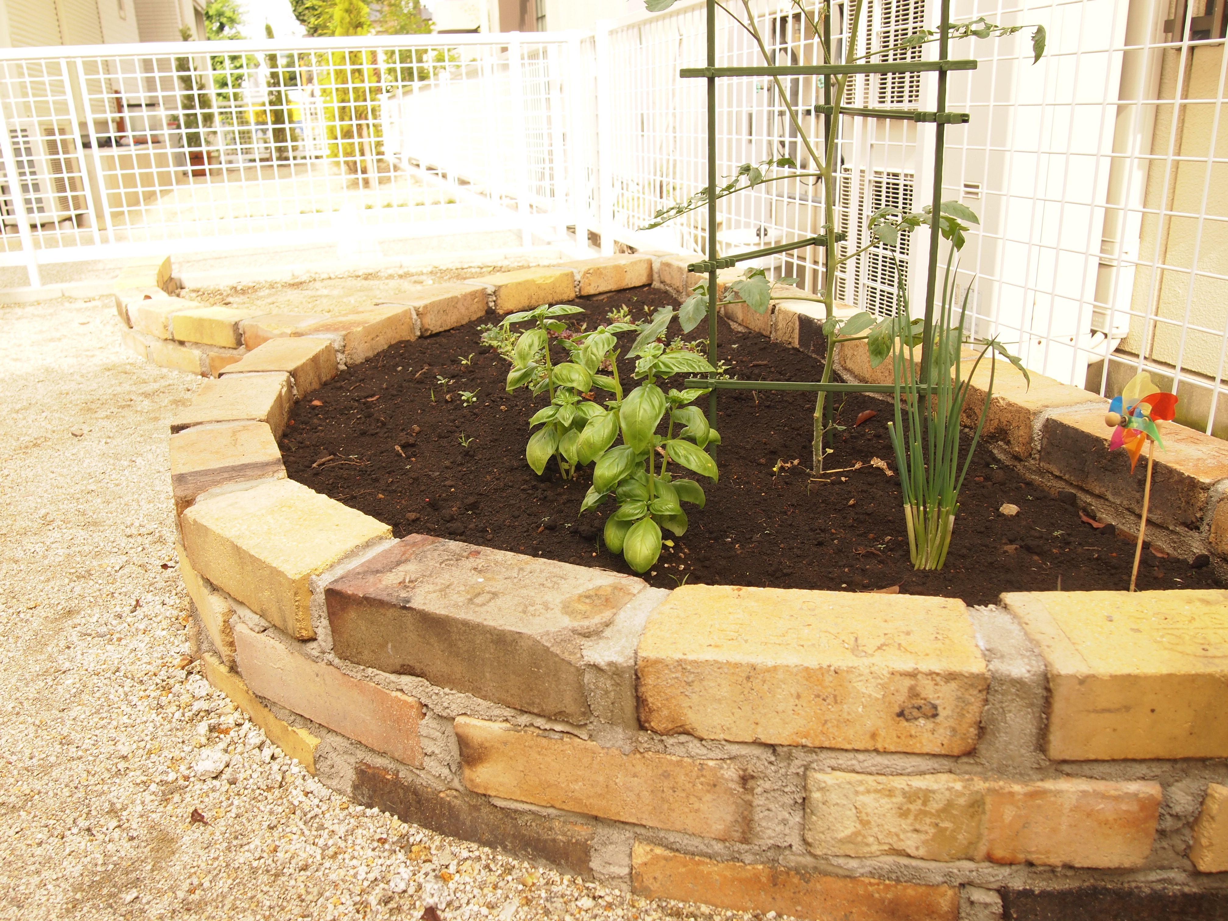お子様の遊び場兼花壇と畑もレンガを積んで見切りをつけました。