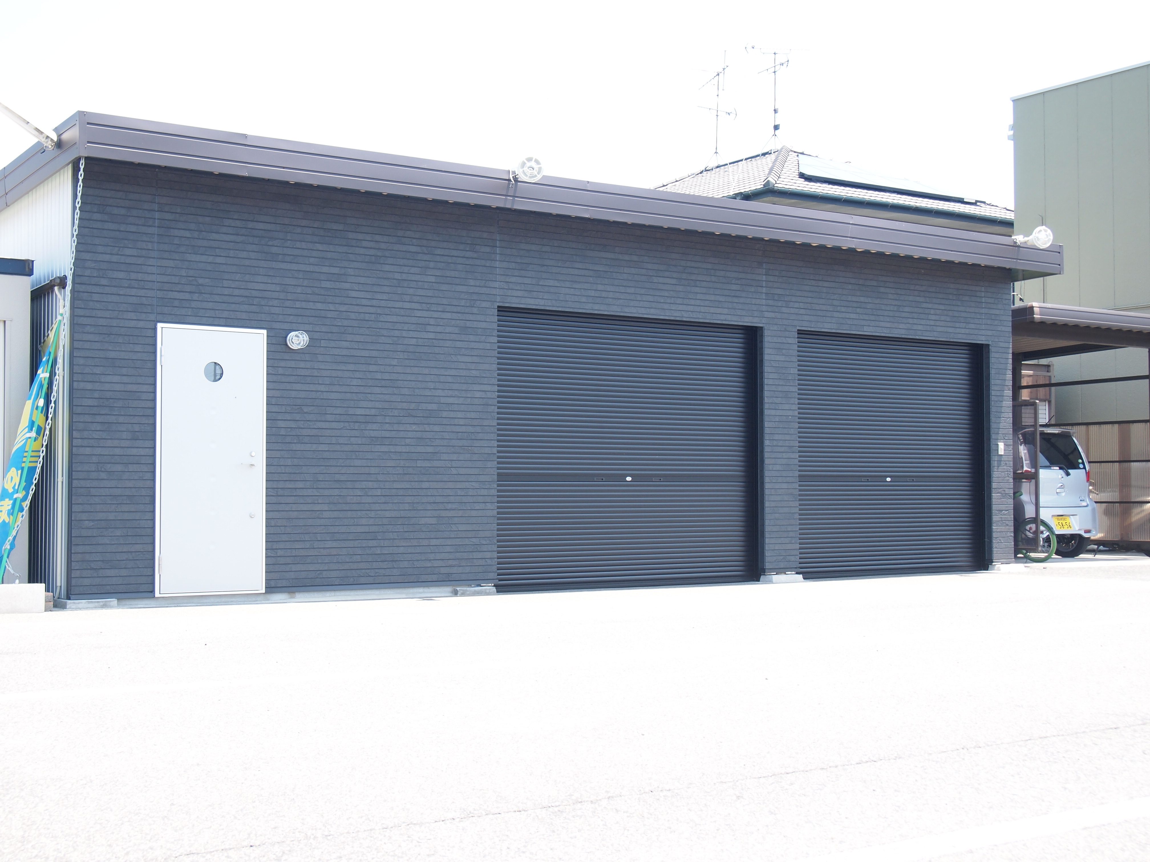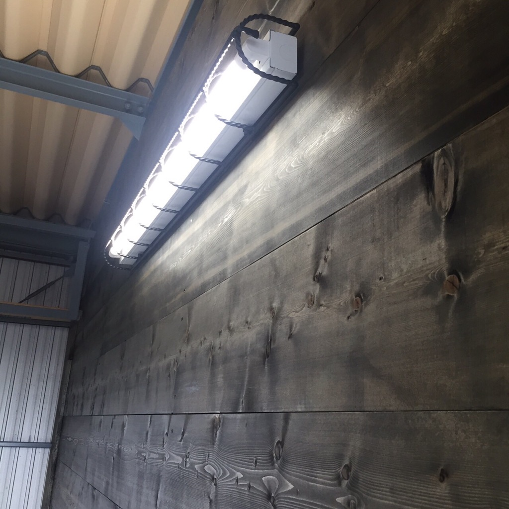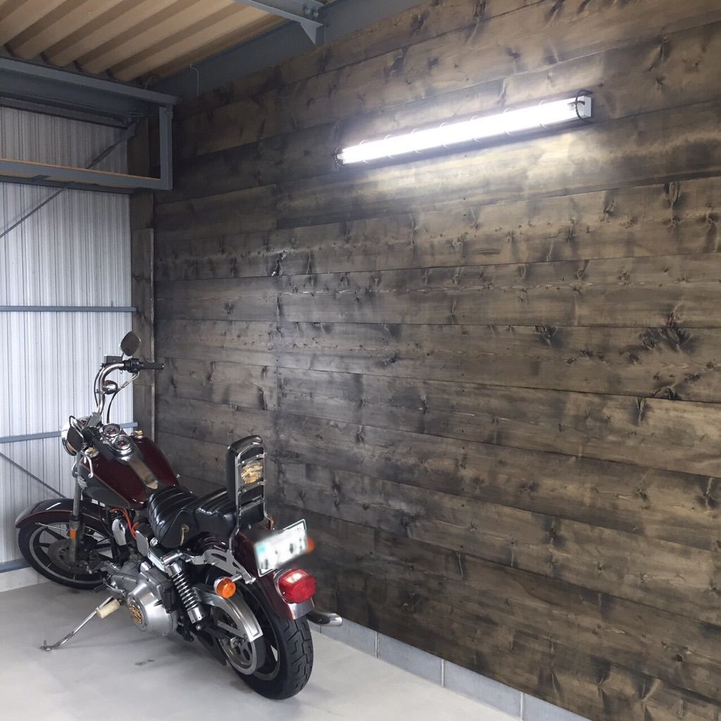 ガレージ/内装/ペンキ塗り/左官/電気工事/ とてもかっこいいバイクを所有するオーナーさんからのご依頼で、ガレージ工事が完成しました。 照明はオーダーして作ってもらったモノを取り付けました。 広いガレージ内を板塀で仕切り、塗装もvintage加工してあります。