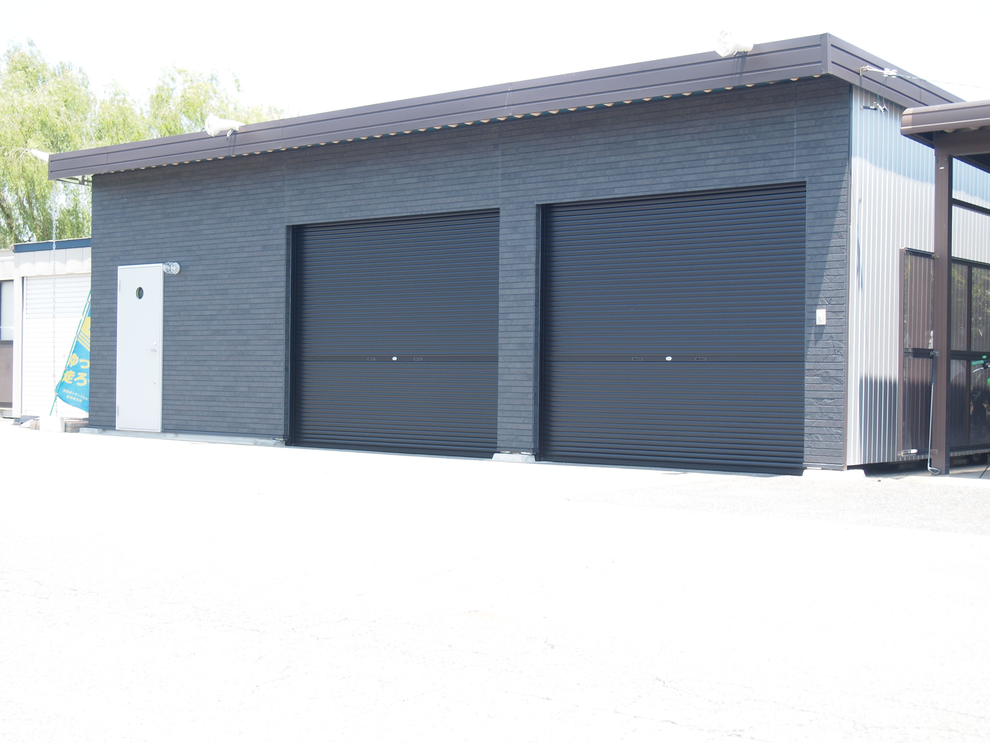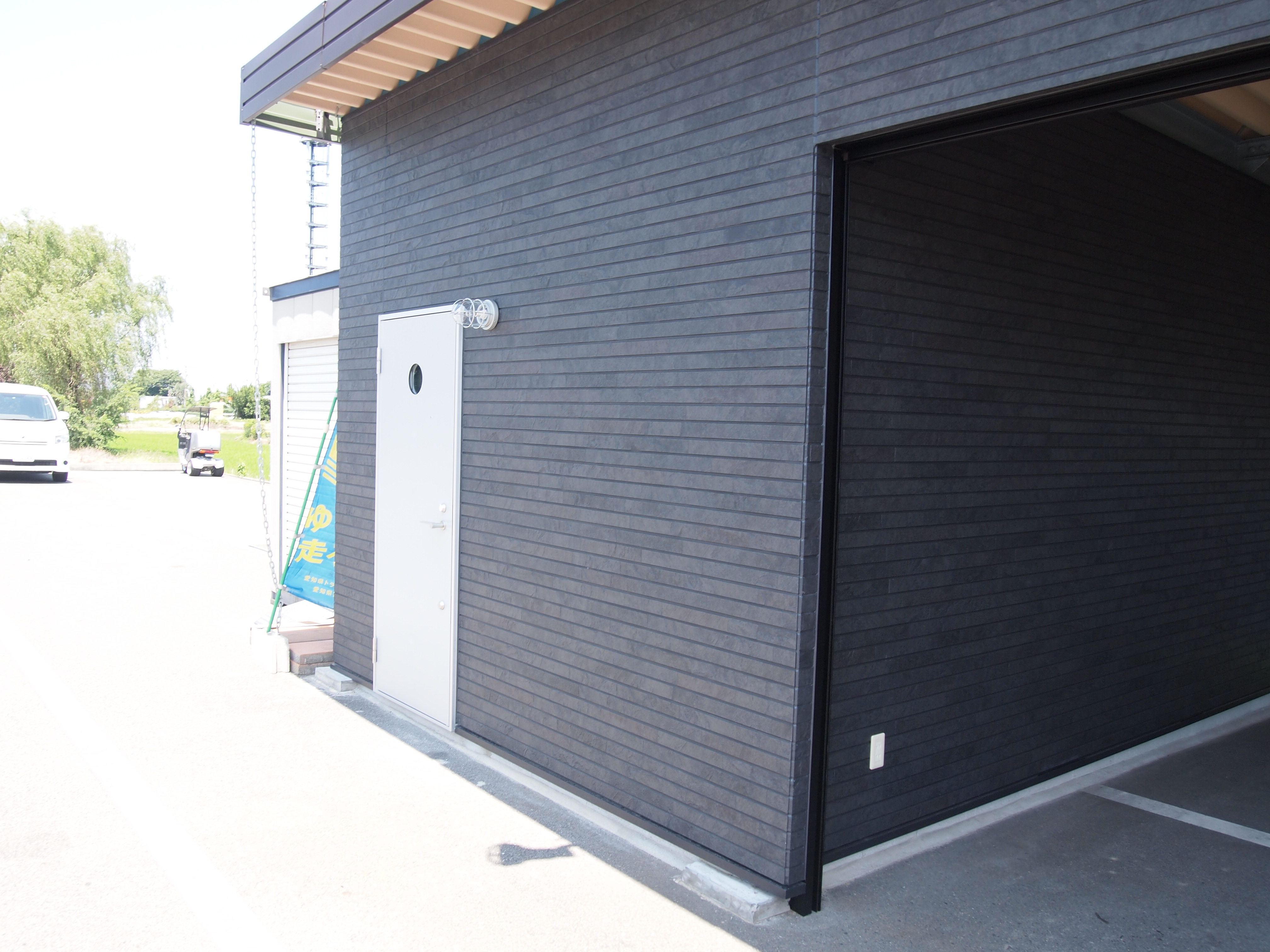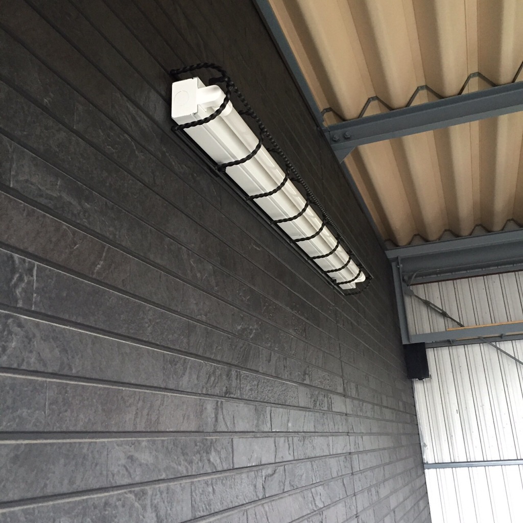 ガレージ/内装/ペンキ塗り/左官/電気工事/ とてもかっこいいバイクを所有するオーナーさんからのご依頼で、ガレージ工事が完成しました。 照明はオーダーして作ってもらったモノを取り付けました。 広いガレージ内を板塀で仕切り、塗装もvintage加工してあります。