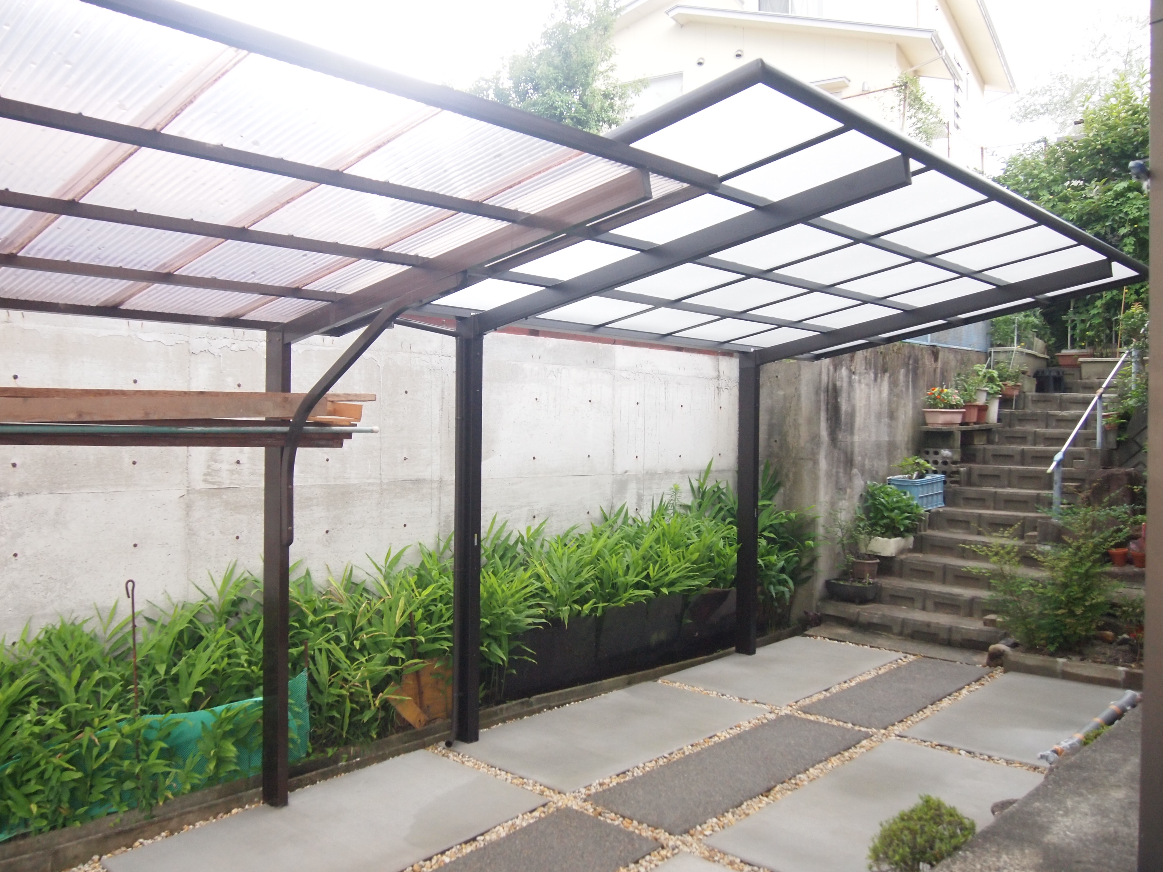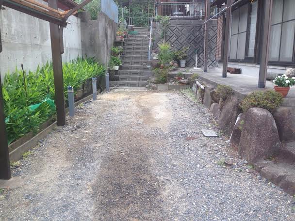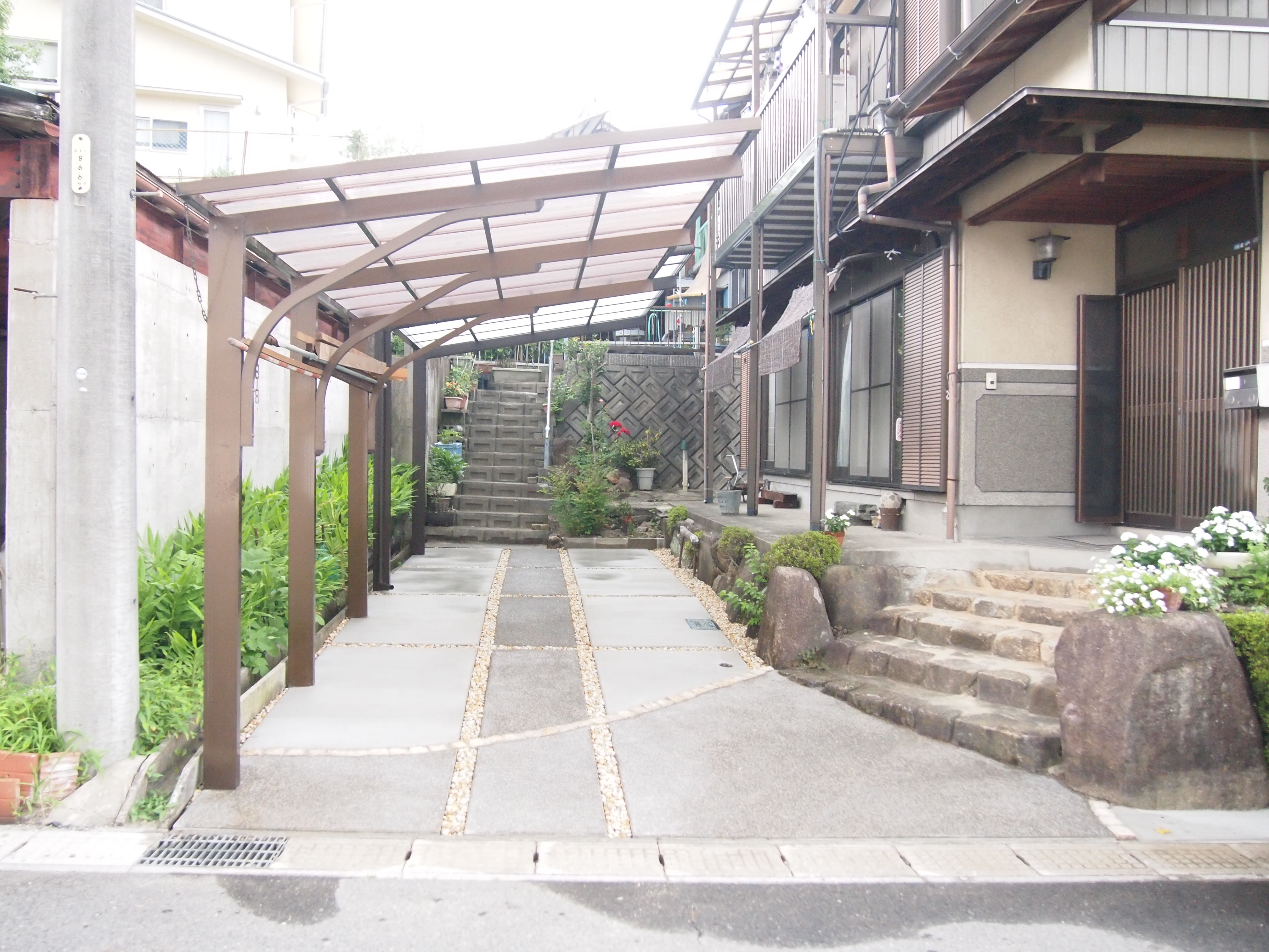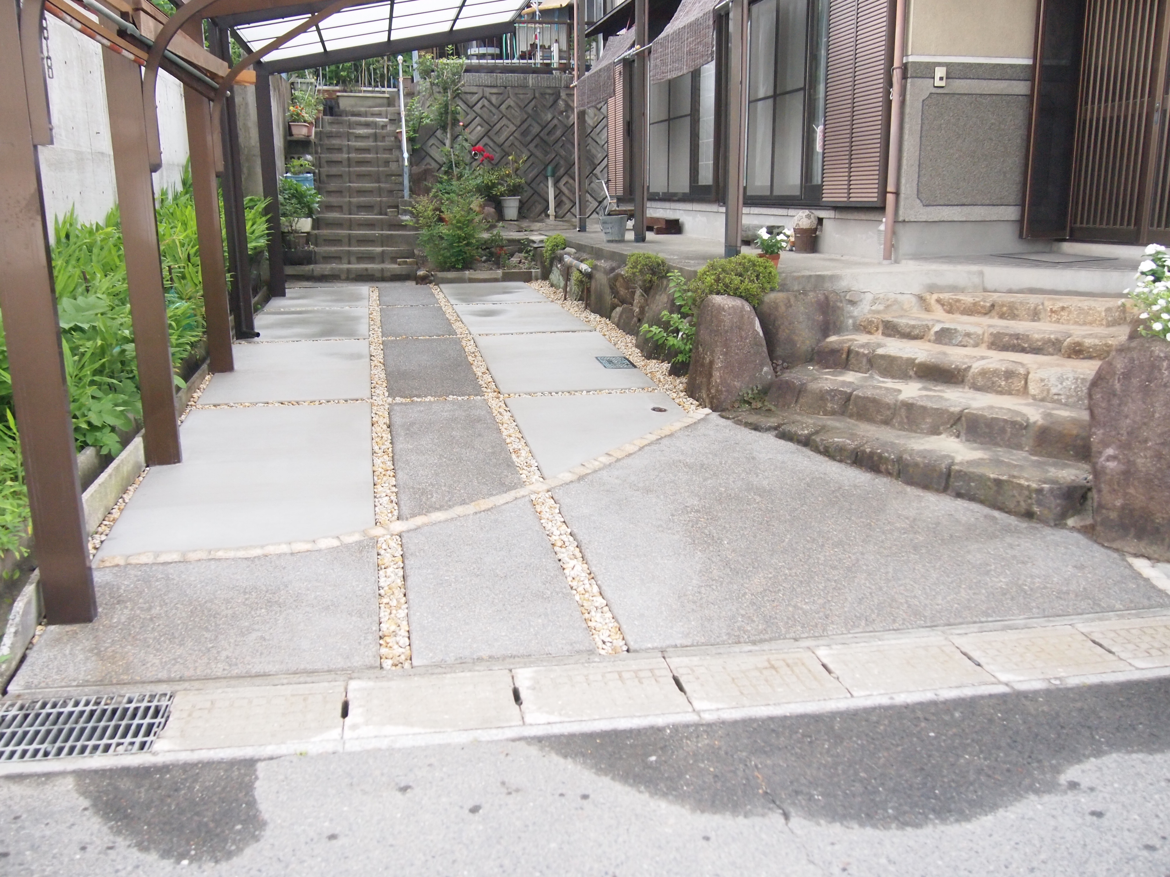 カーポート設置/コンクリート工事/ピンコロ石敷き “雨が降ると駐車場に水が溜まる”とのご相談でした 当初砂利敷きだった駐車場をコンクリートにし、見た目も良く、尚且つ雨がきちんと流れるようしました。 来客へのアプローチを作り、歩きやすくもなりました。 また、古かったカーポートを新設のカーポートに取り替えました。