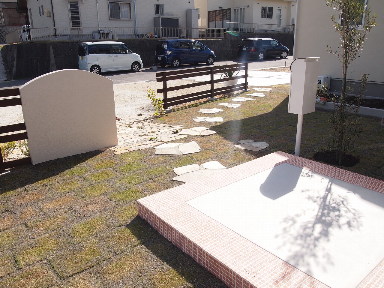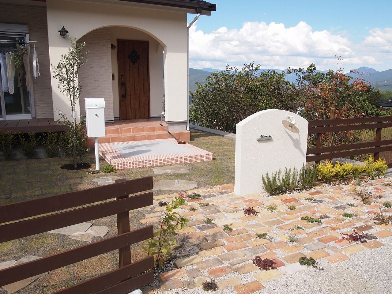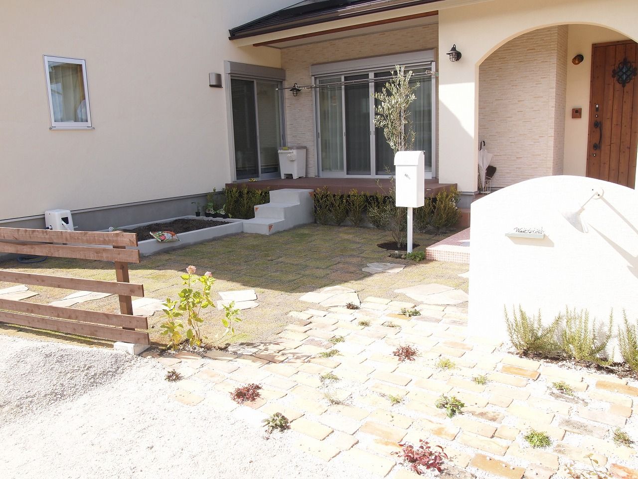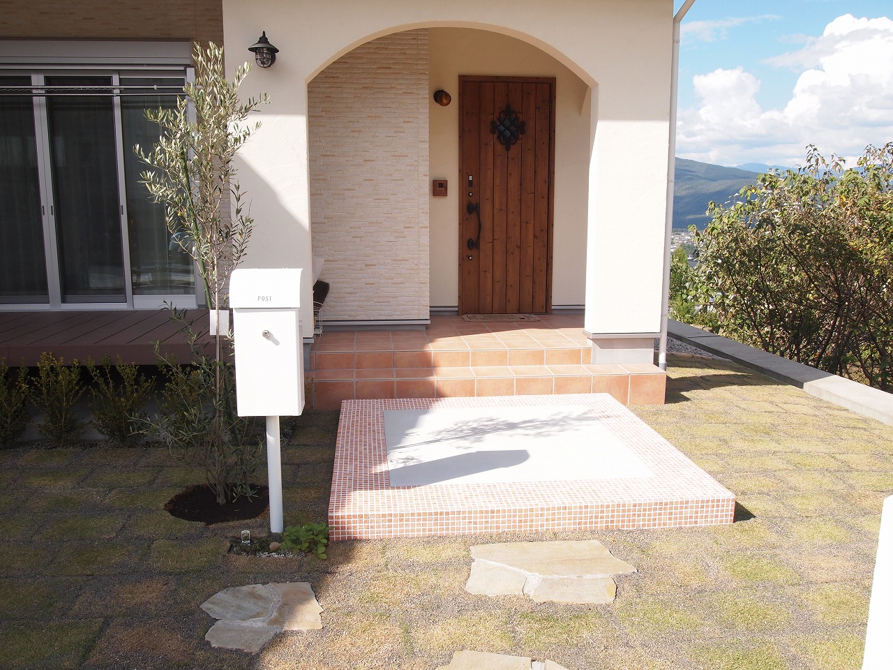 駐車場工事/門工事/アプローチ工事/芝生/植栽工事/フェンス工事 モザイクタイル貼りの大きな階段が特徴的なExterior 門廻りのコモノはグリーンとホワイトでシンプルにまとめました 芝生の効果でアプローチが引き締まり、お客様を玄関までおもてなしする 植栽達も種類豊富で楽しいお庭となりました
