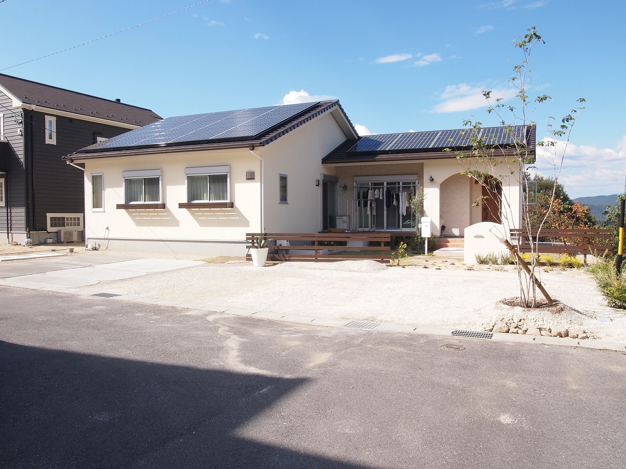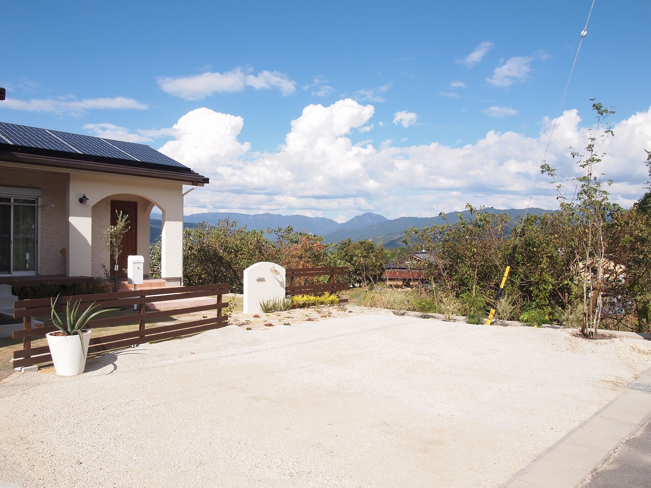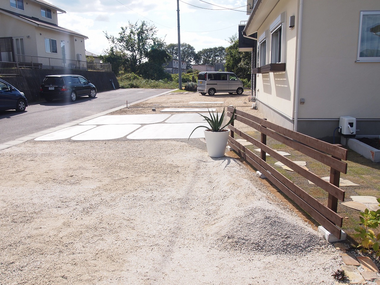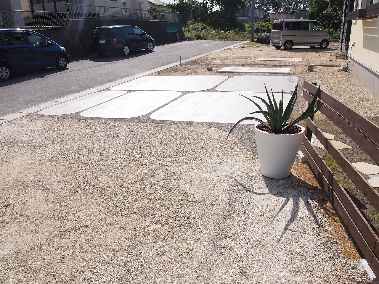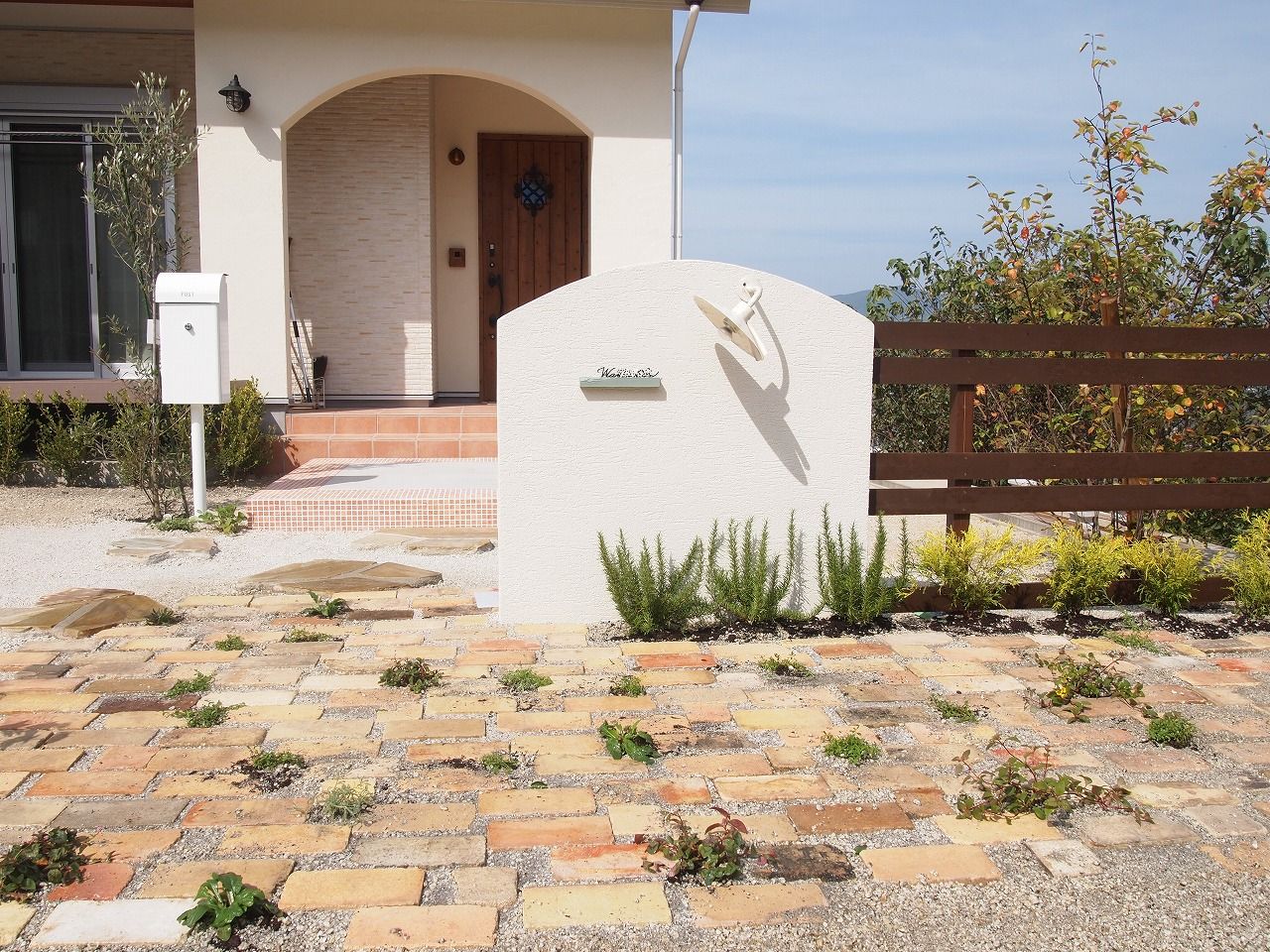 駐車場工事/門工事/アプローチ工事/芝生/植栽工事/フェンス工事 モザイクタイル貼りの大きな階段が特徴的なExterior 門廻りのコモノはグリーンとホワイトでシンプルにまとめました 芝生の効果でアプローチが引き締まり、お客様を玄関までおもてなしする 植栽達も種類豊富で楽しいお庭となりました