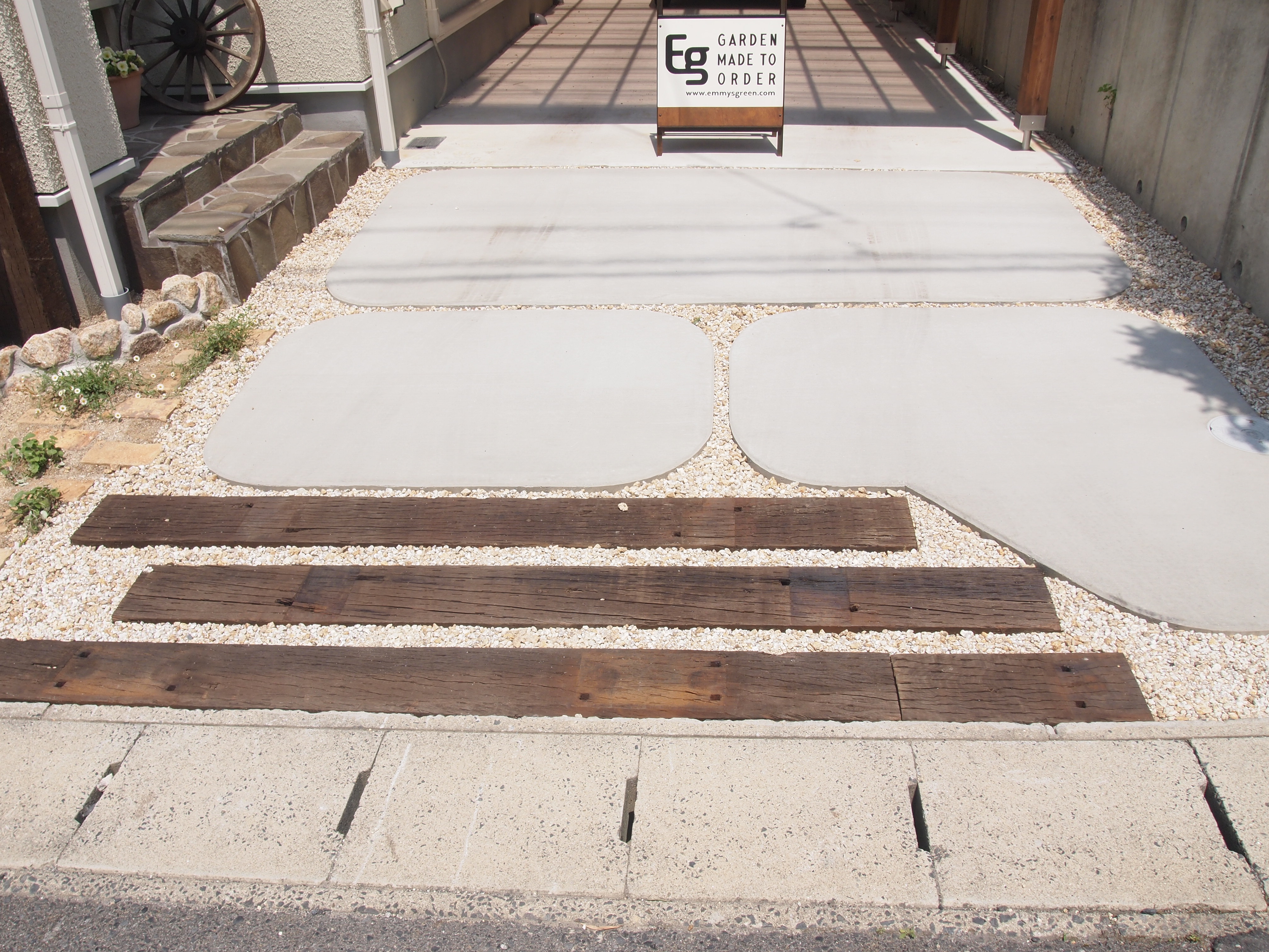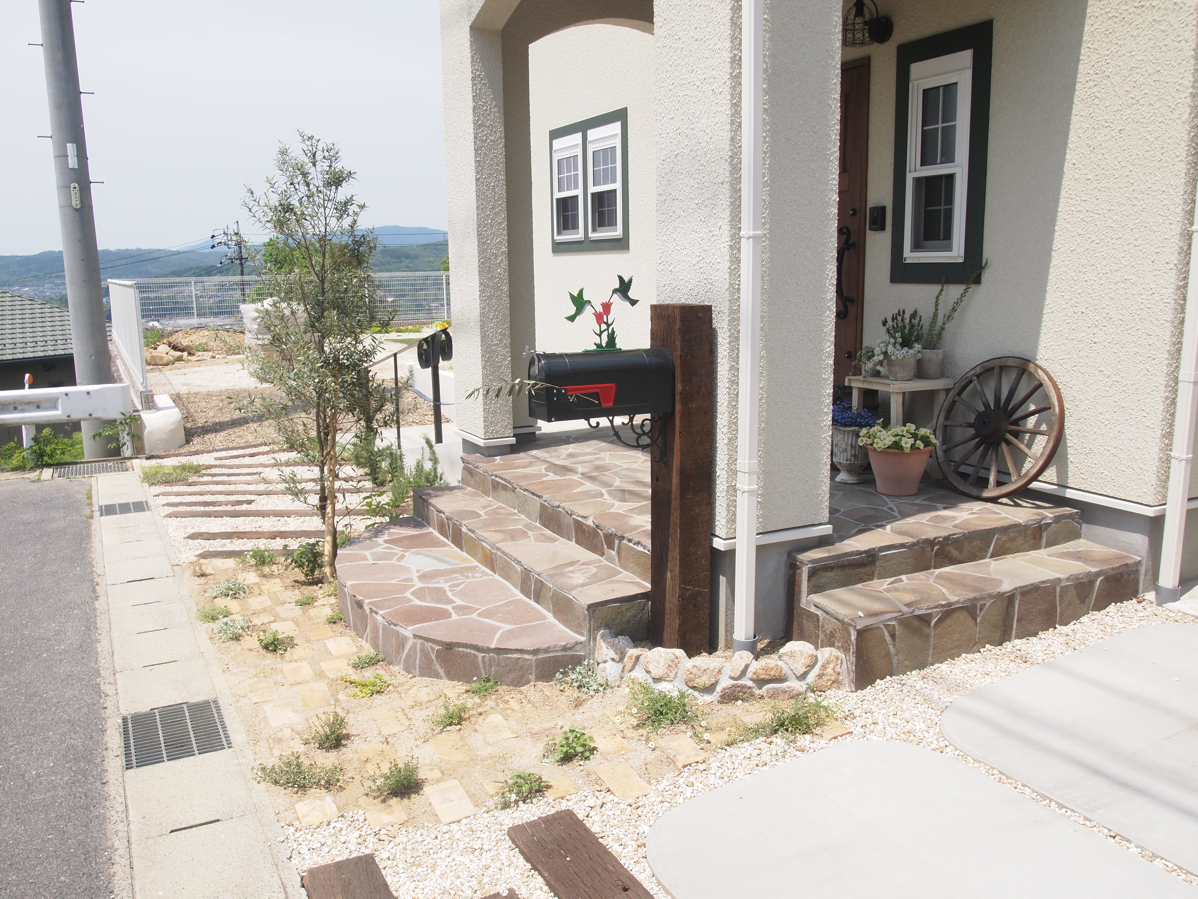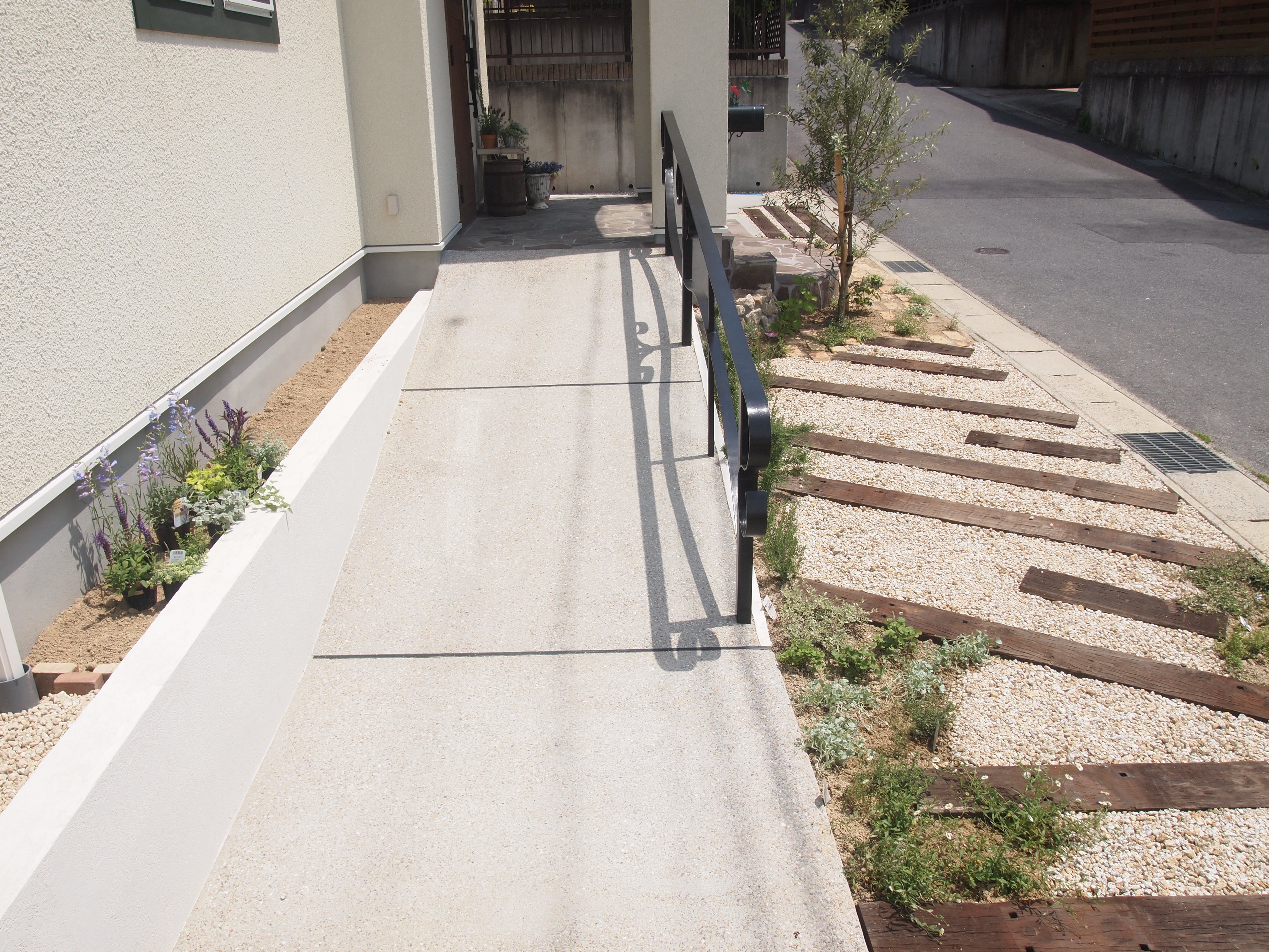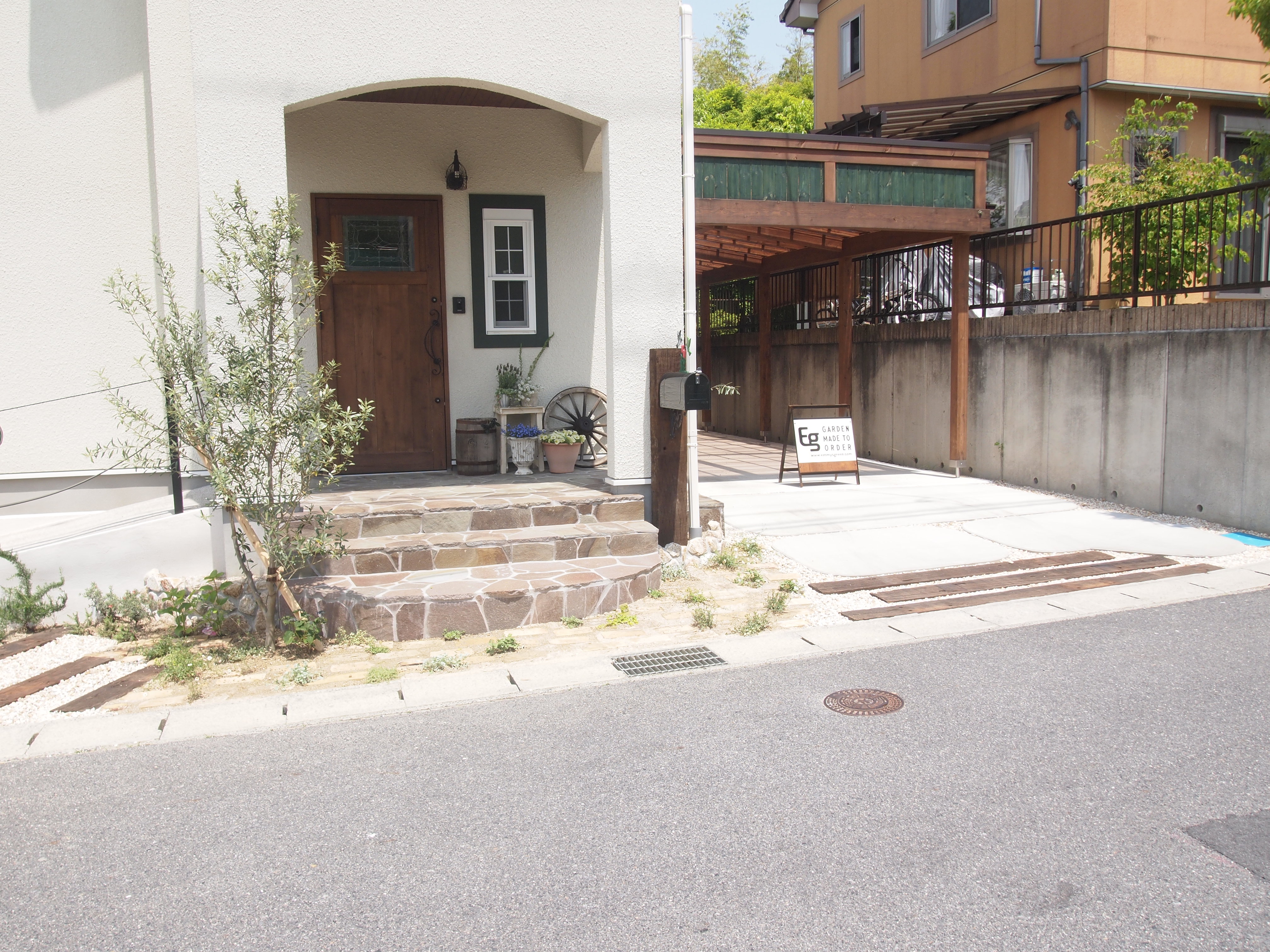 デザインアイアン手すり/駐車場/ポスト/アプローチ/植栽 デザインアイアンの手すりが目を引くナチュラルガーデンなお庭ができました。 車庫へと続くコンクリートの形状がR形状で優しい印象です。 オリーブの木が玄関のシンボルとなりました。 オリーブの木に合うよう、グランドカバーはハーブを中心としたプランツをセレクト。