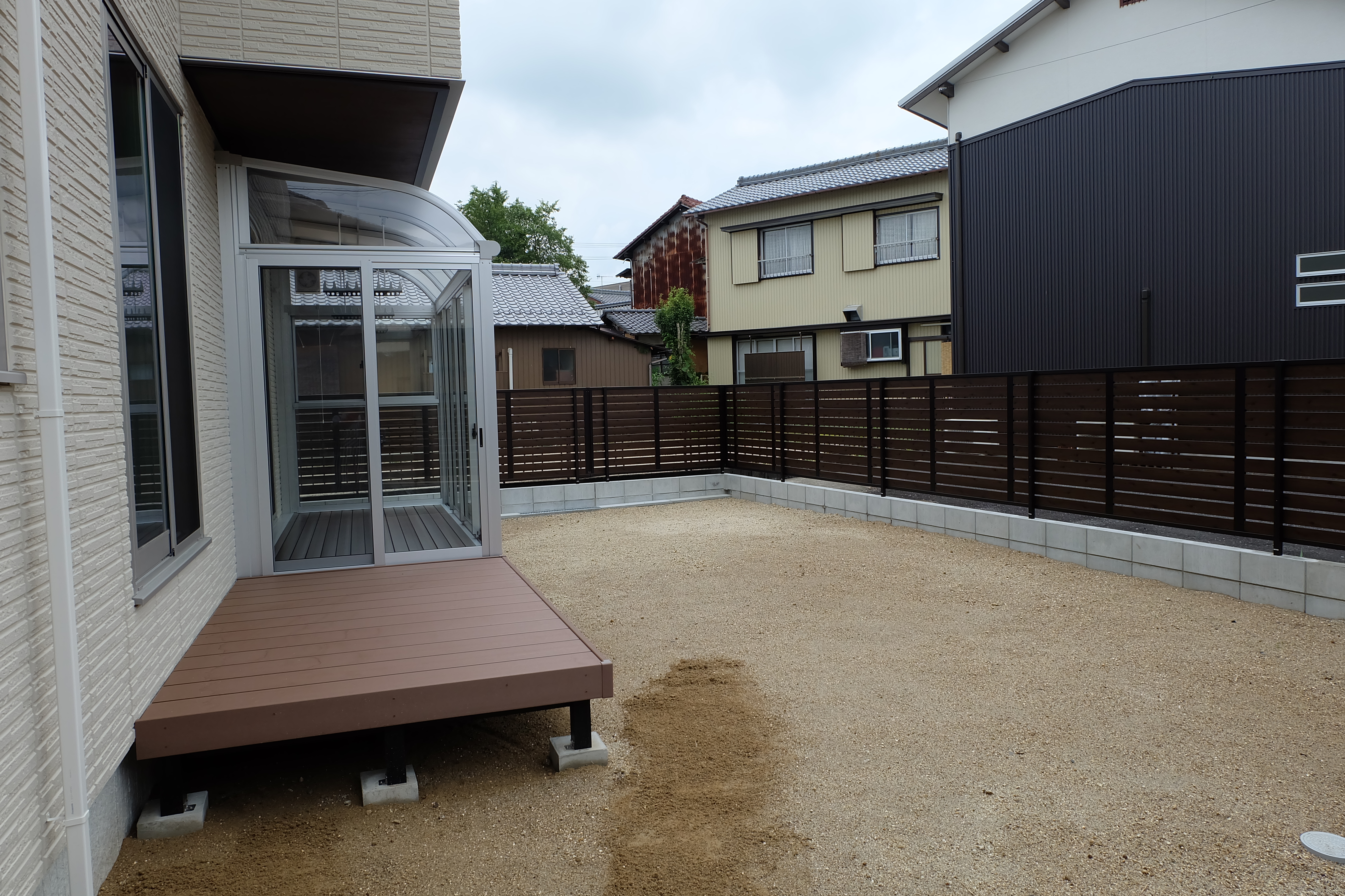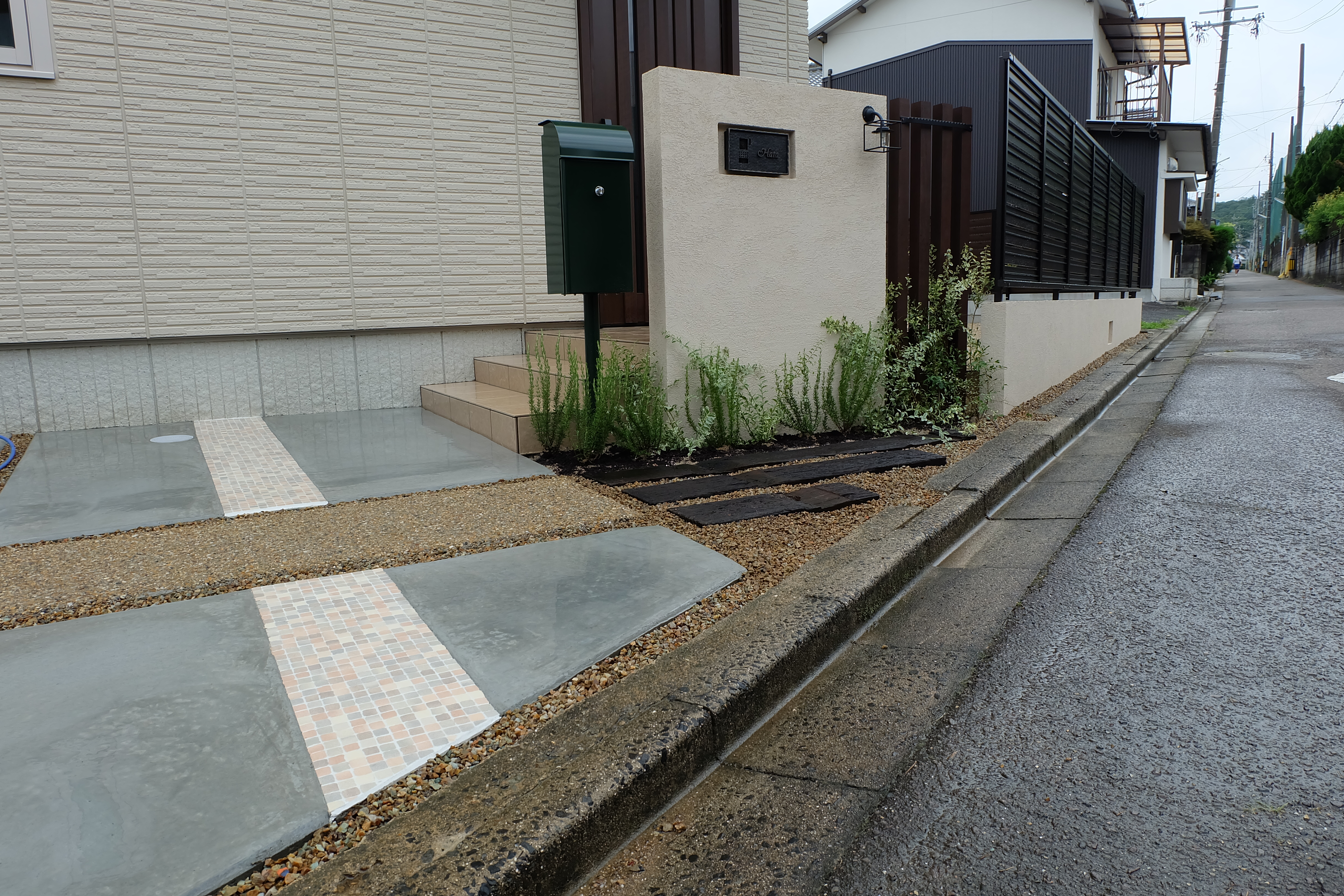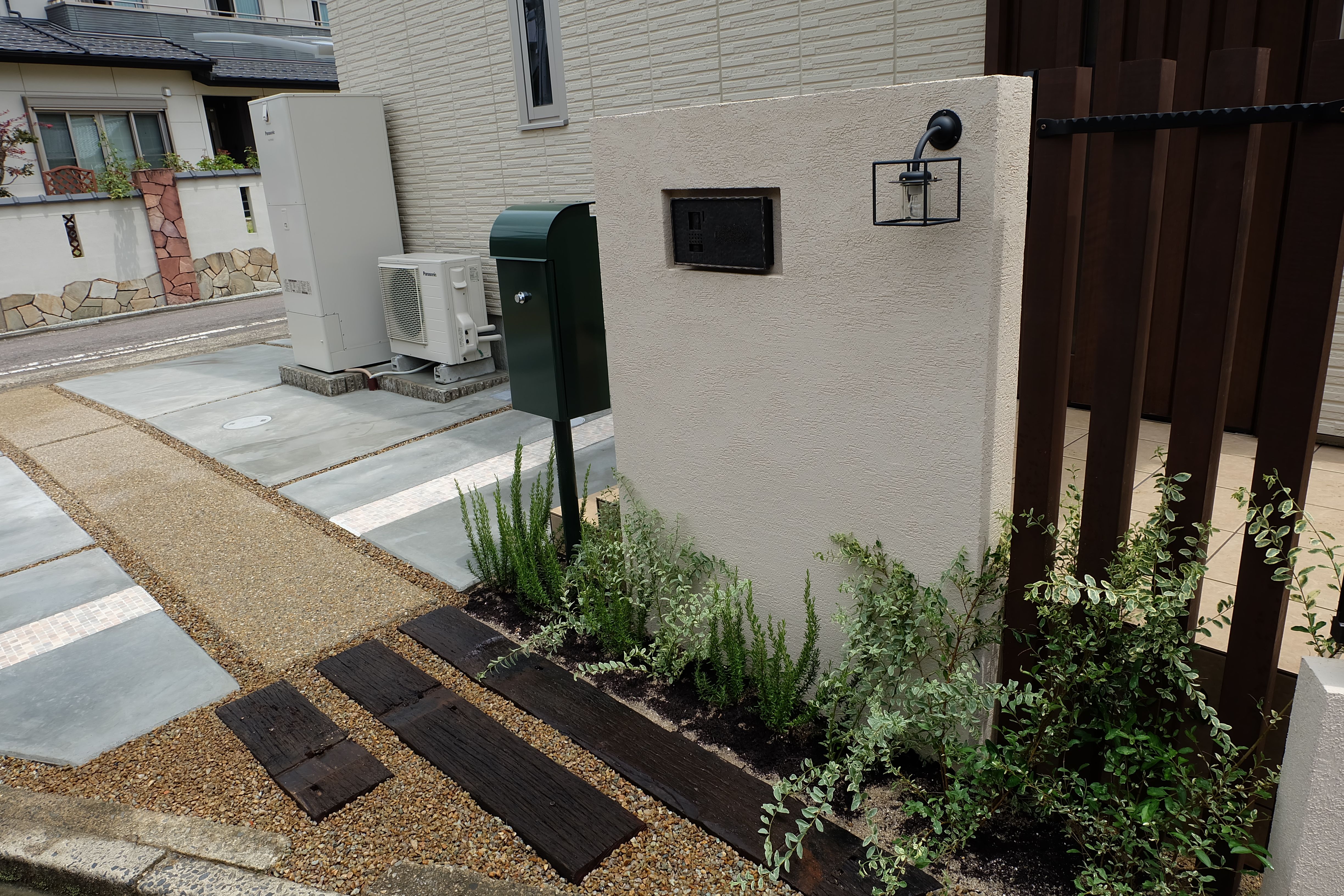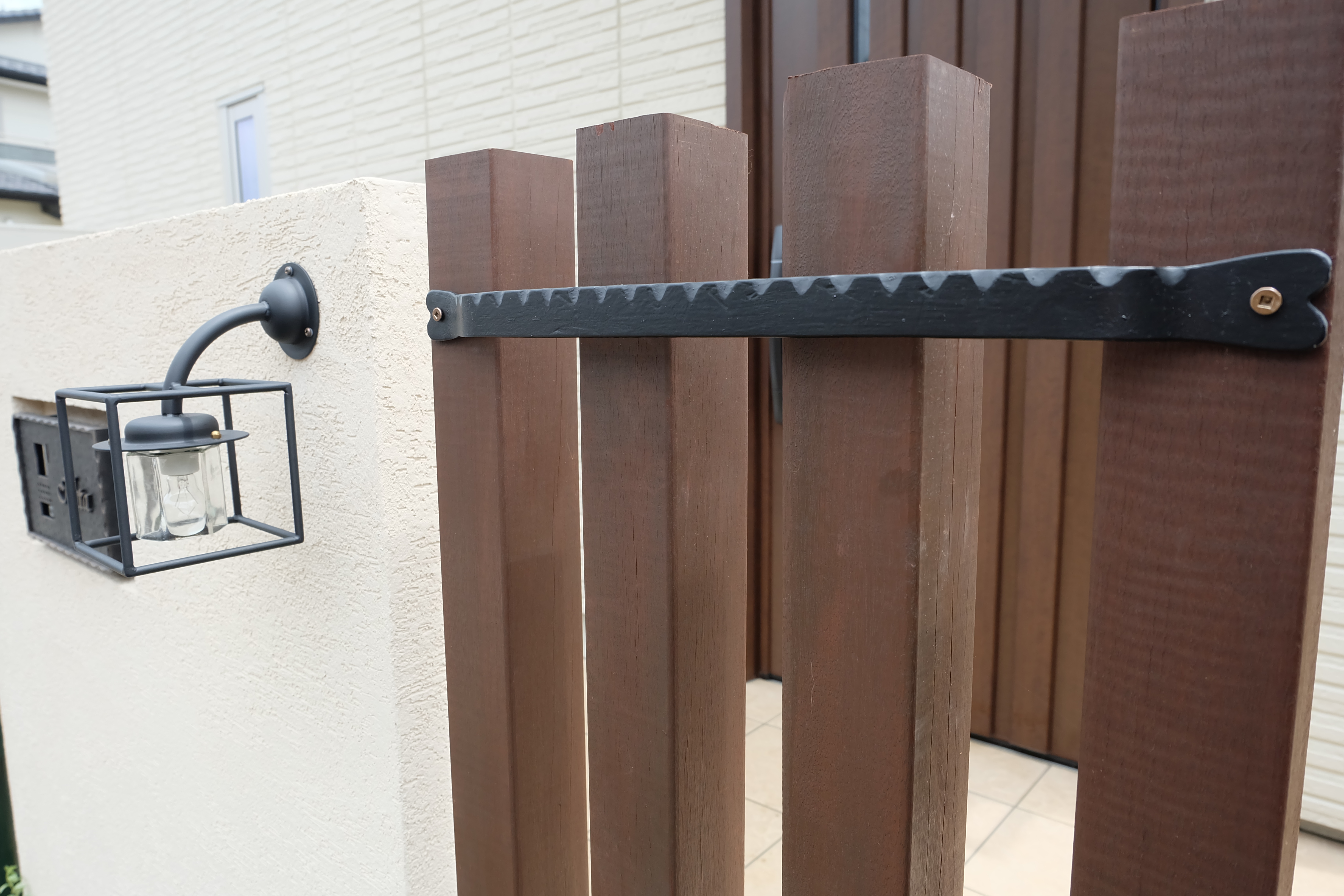 カーポート/ウッドデッキ/サンルーム/目隠しフェンス/門/植栽 門と玄関が近いからこそ、門のデザインはシンプルに仕上げました。 シンプルこそ光るコモノ使いで、表札もインターホンにポスト、門灯が壁面に散らばってカッコ悪くならない様に一つにまとめました。 門灯もなかなかないデザインで可愛らしいです。 ウリン角柱には植栽が掛けられるようアイアンバーを設置しました。シンプルながらナチュラルな雰囲気で落ち着きのあるエクステリアになりました。