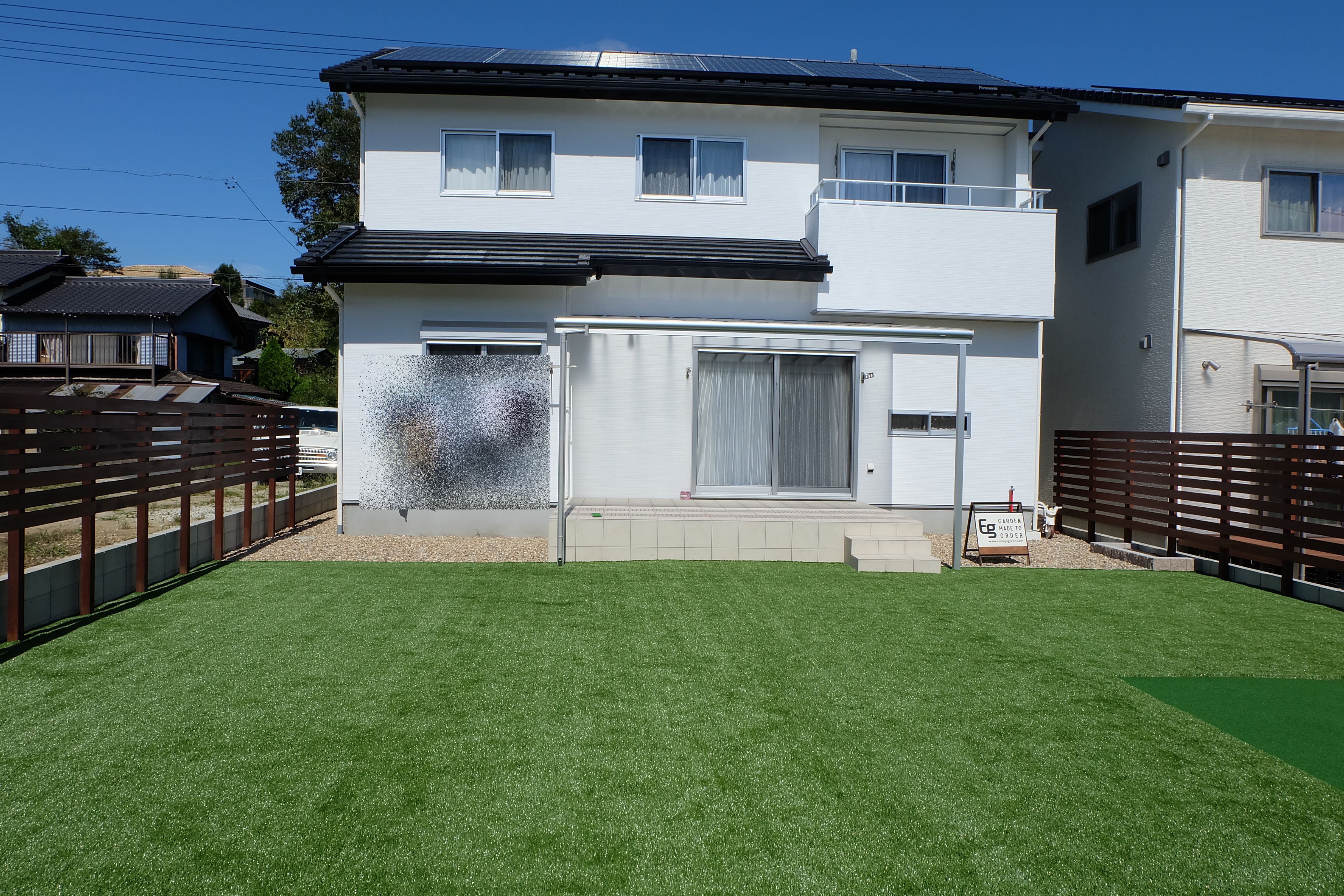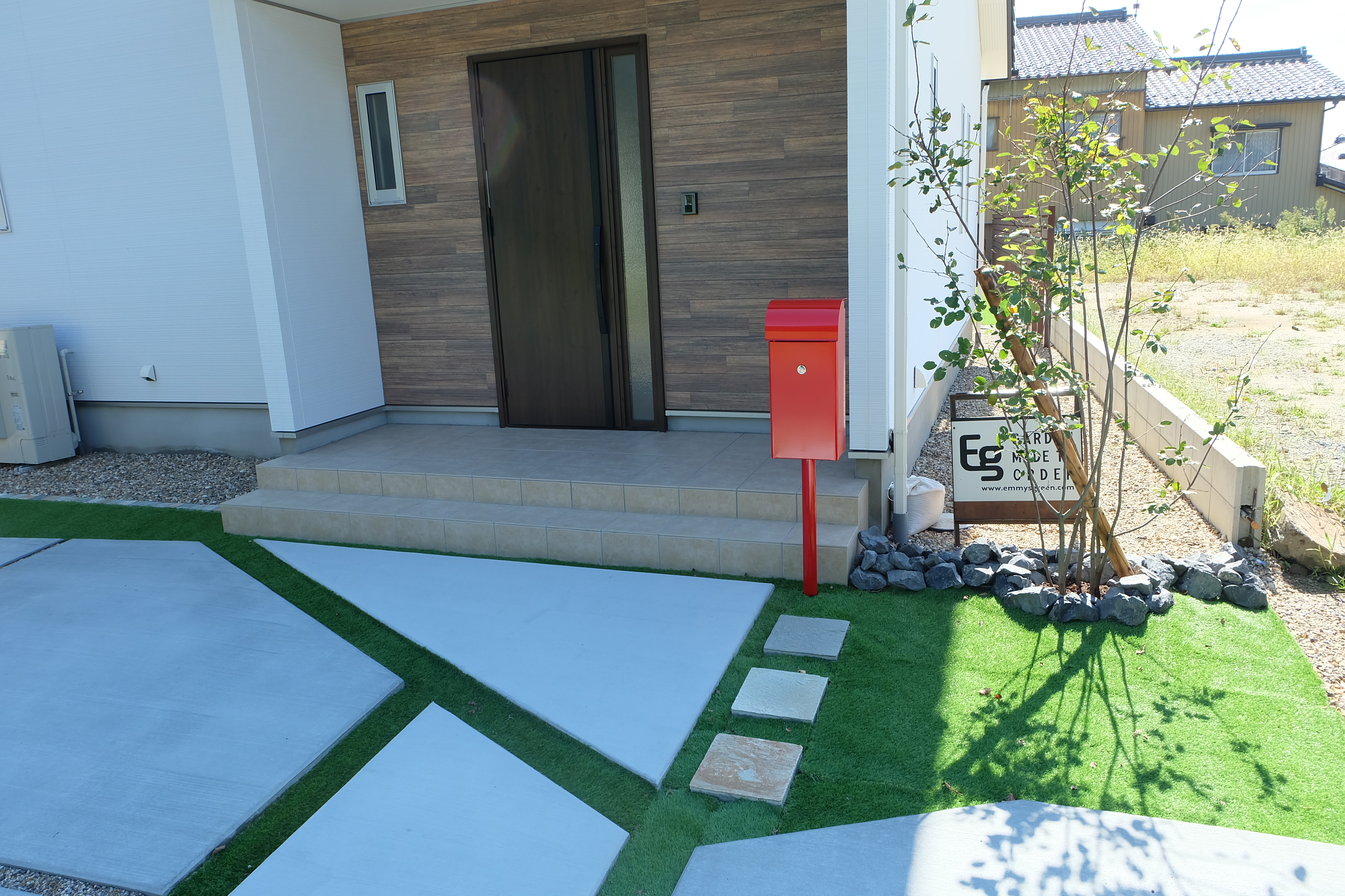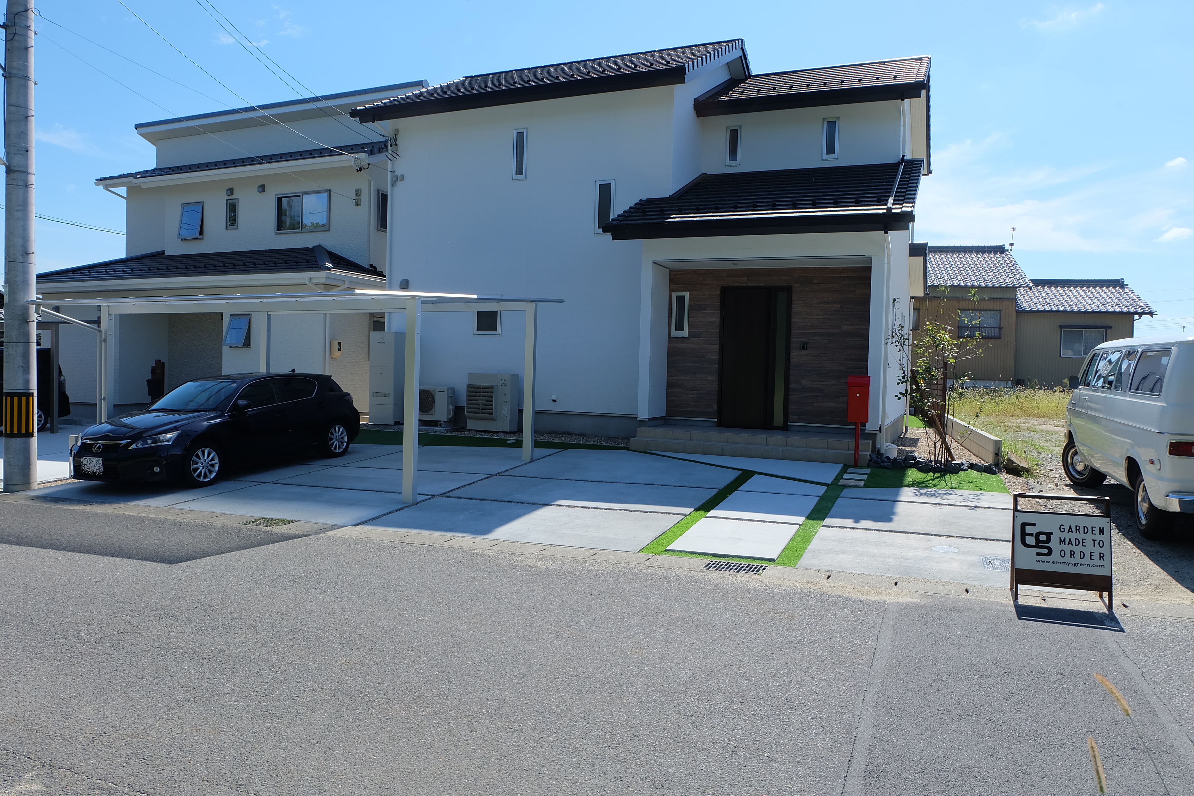 アプローチを兼ねて作った駐車スペースには人工芝で囲むように