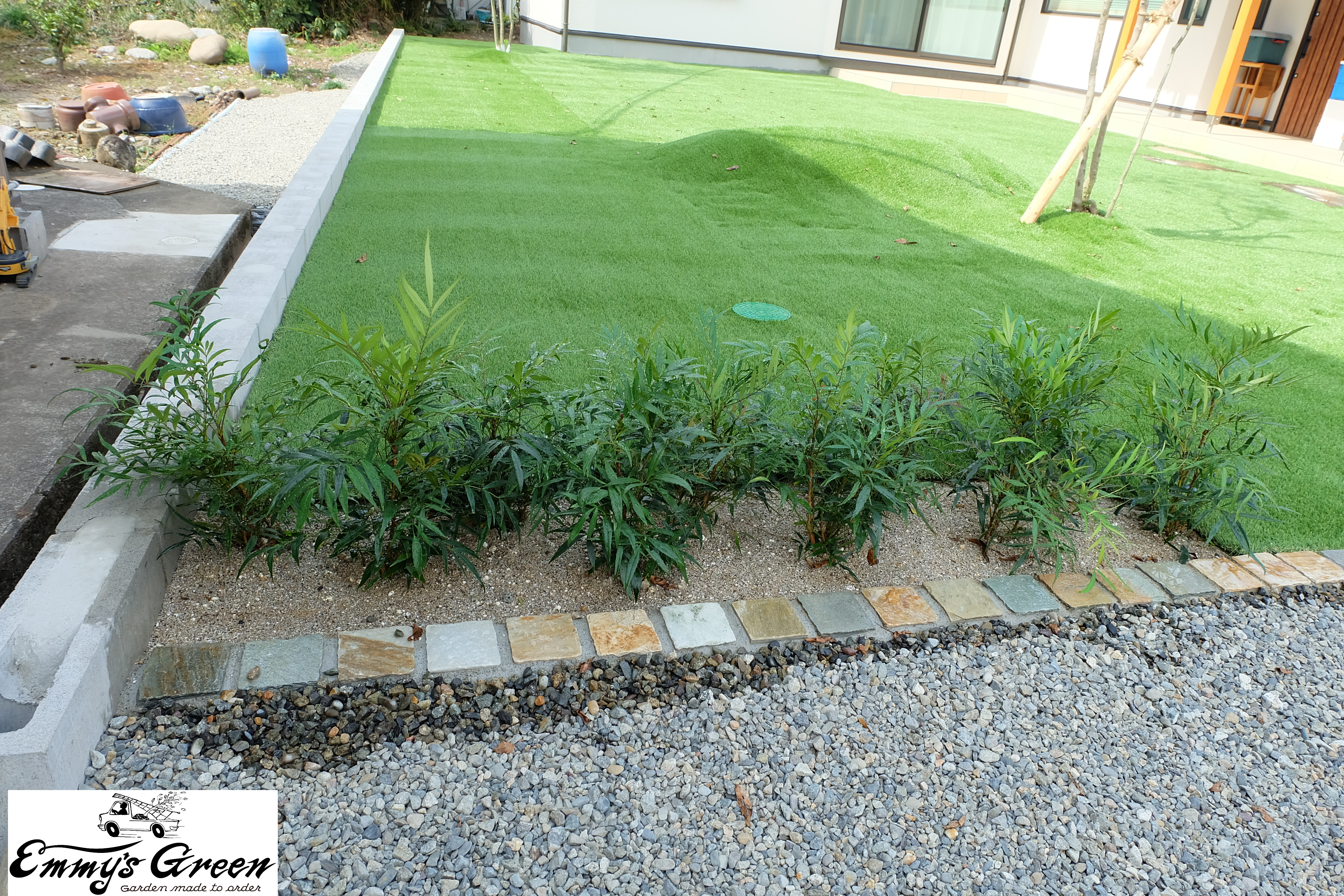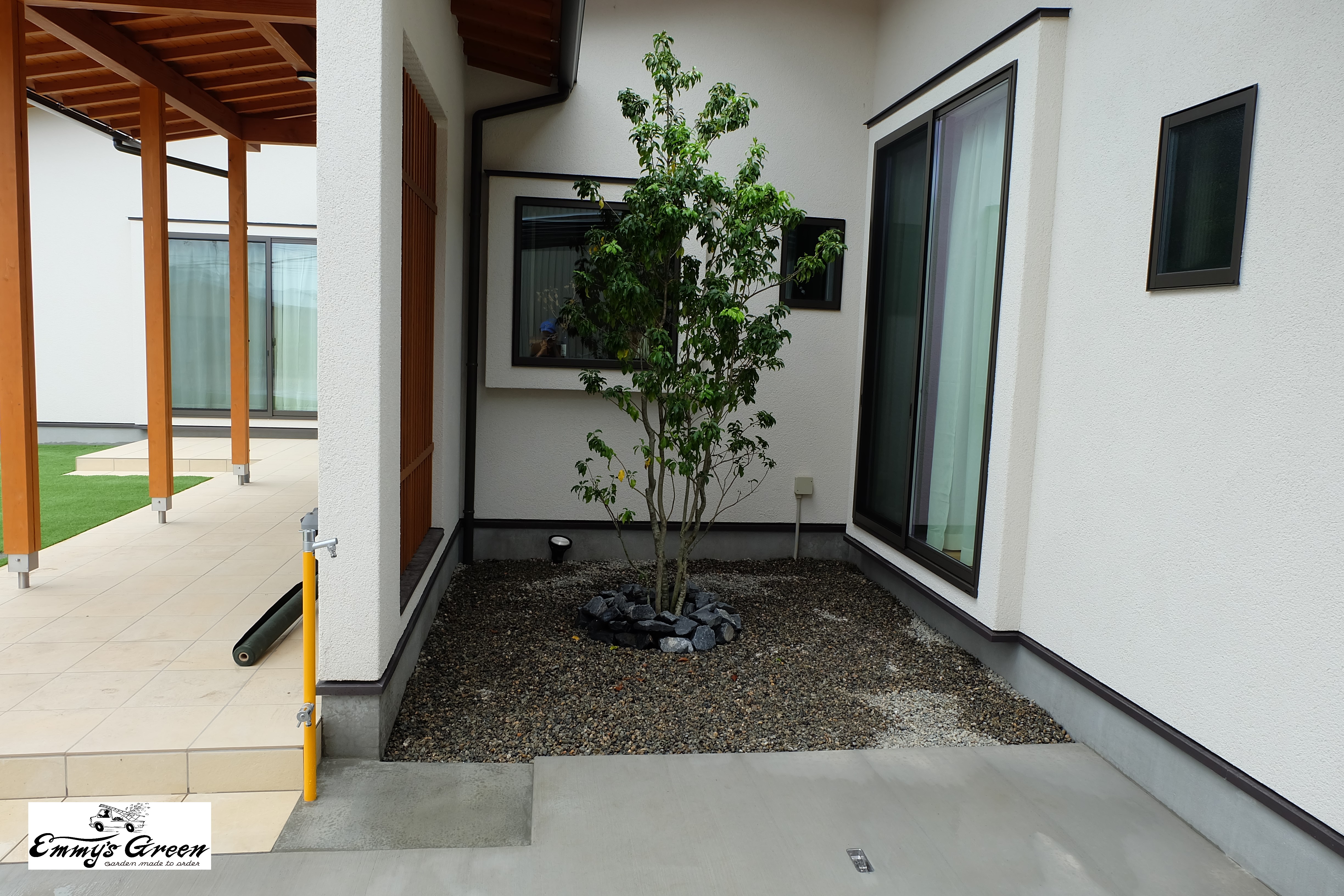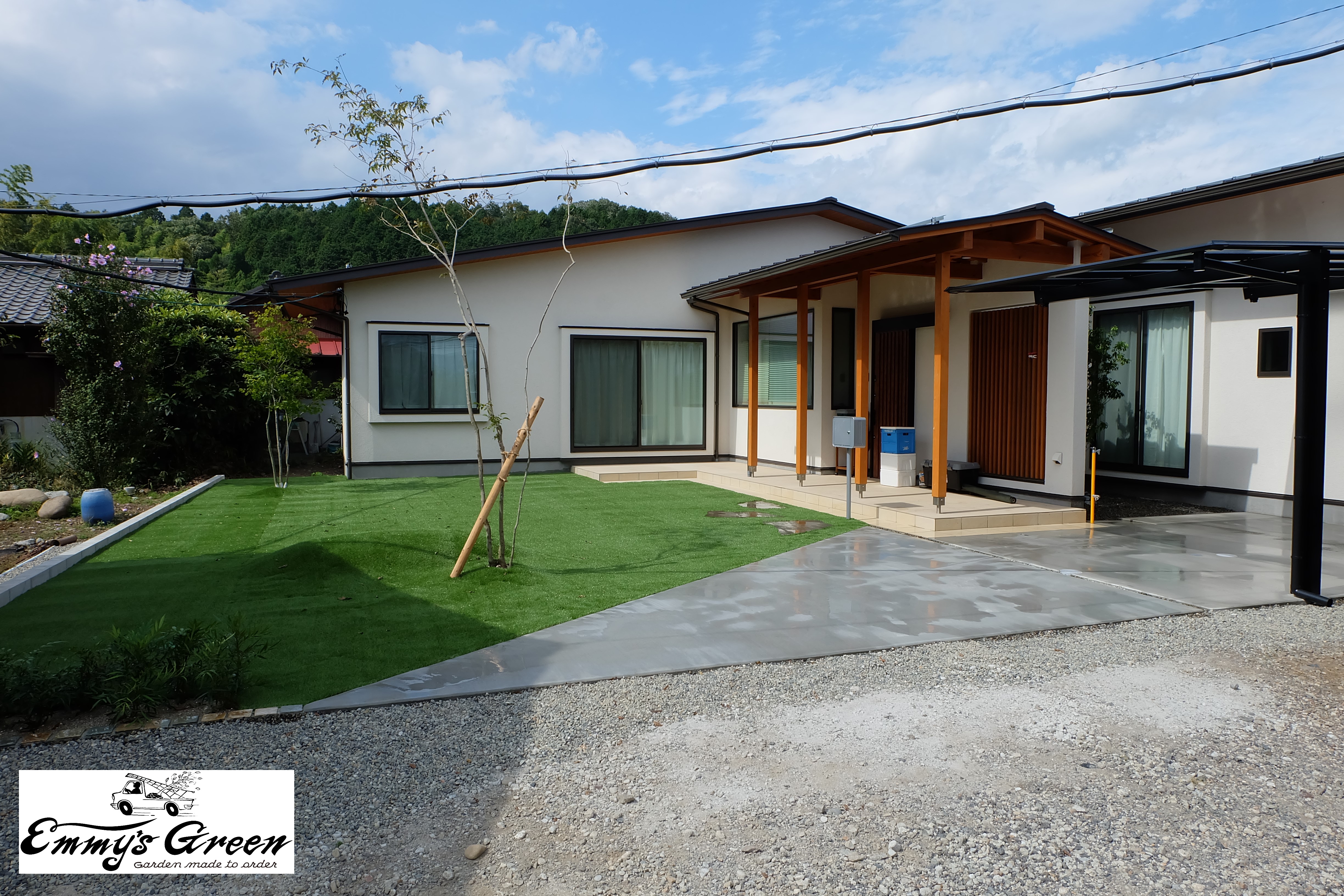 タイルデッキ/ポスト/カーポート/アプローチ/人工芝 大きく開口が広がったオープン的なハウスにはオープン的な庭を リビングから見える庭は思い切って人工芝に アプローチは自然素材の大判の飛び石 植え込んだ樹木は雑木にして飾りっ気のない個性的な樹木を