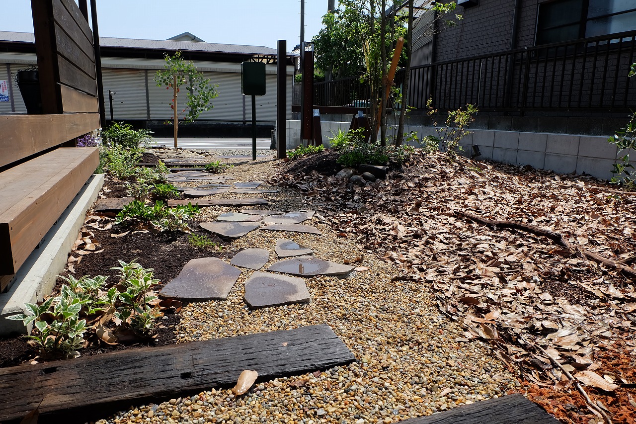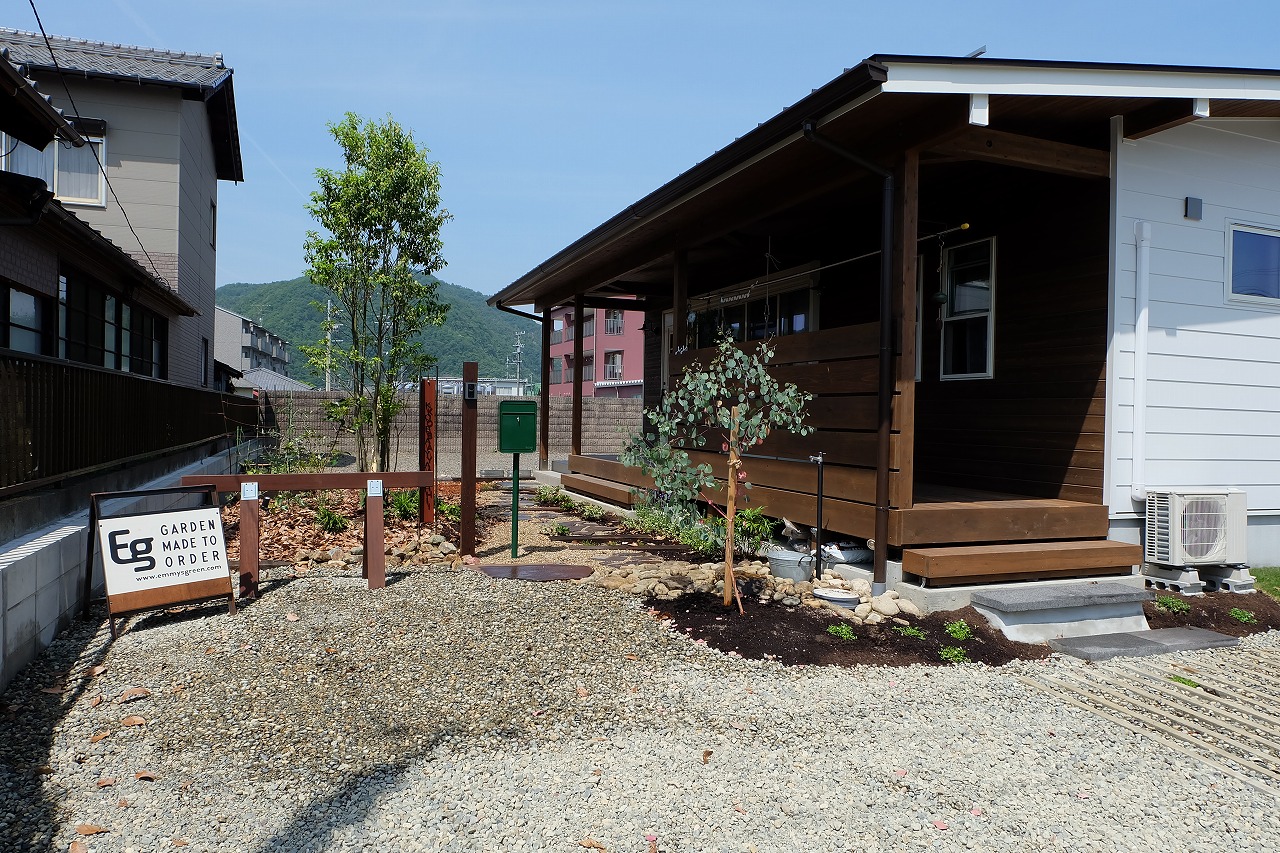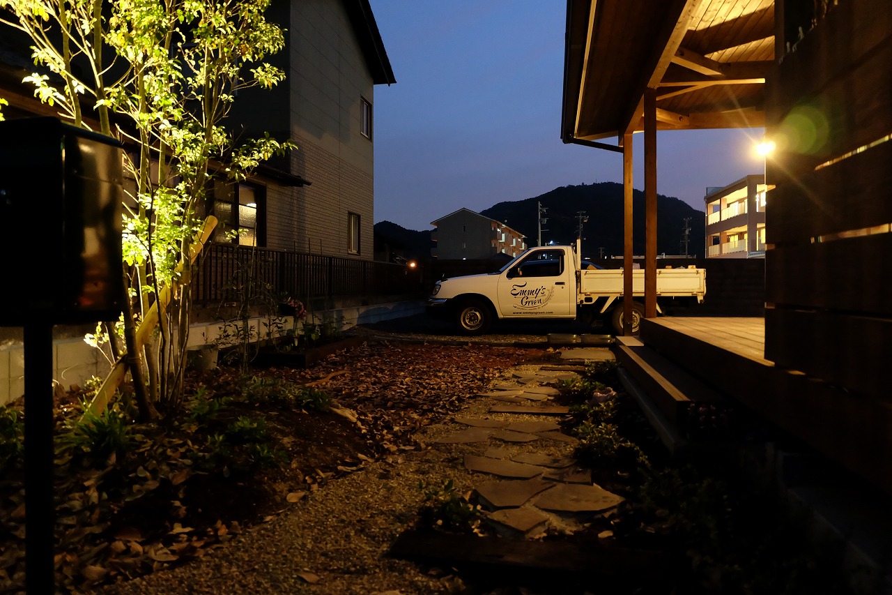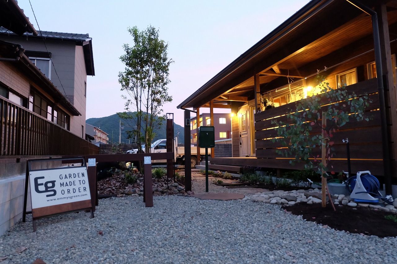雑木の庭/鉄平石アプローチ/ウリンフェンス/緑化ブロック/門廻り ‘森の中を抜けて家路へ’ そんなイメージから始まったクライアントとの打ち合わせ。 Emmy'sが得意とする雑木の庭をそのまま形にしたEXTERIOR工事 庭にはあえて、落ち葉を撒きました。 表札はEmmy's特製のorder製作したモノです。 昼の光に当てられて文字に影が映り、浮き上がって見えます。 デッキに吊るしたハンモックから夜はナイトガーデンが楽しめます。