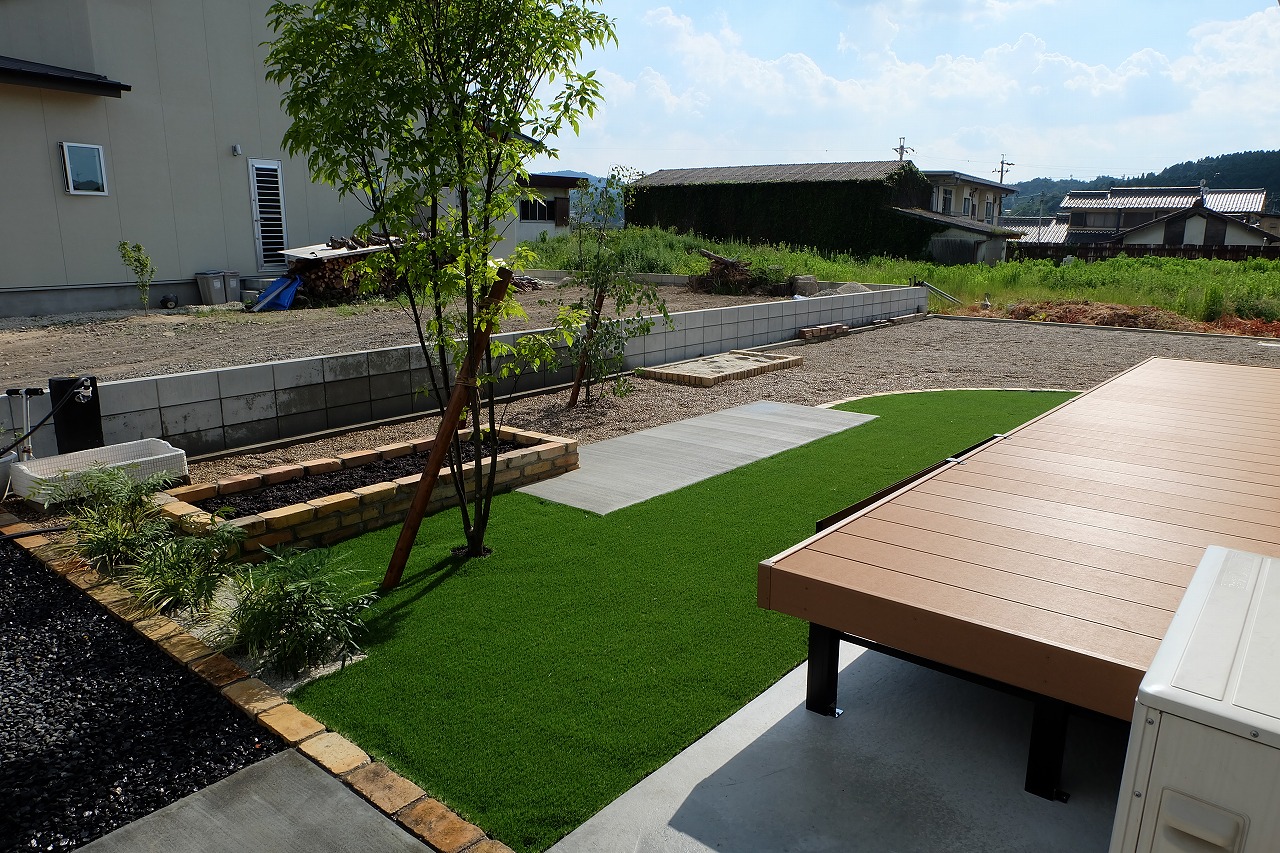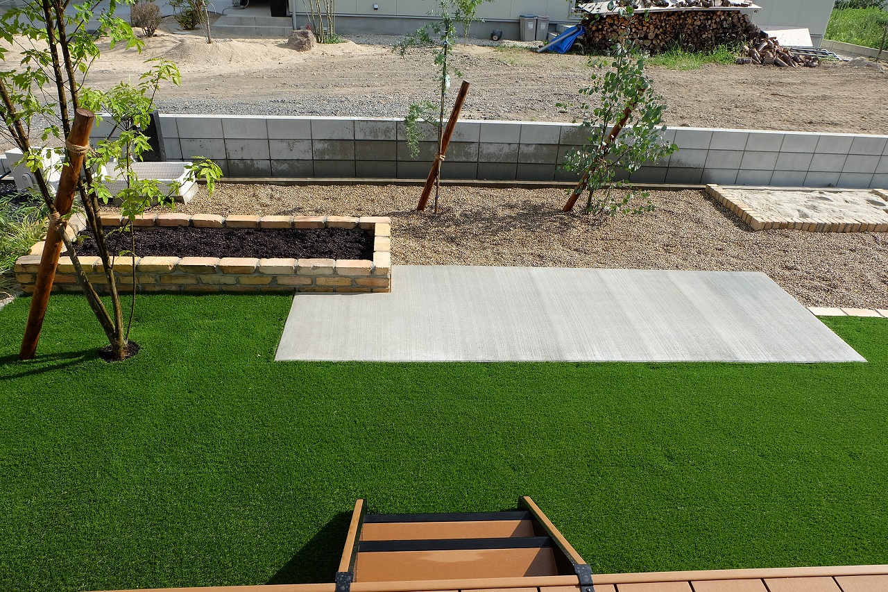 人工芝/ウッドデッキ/BBQ場/砂場/畑 広いお庭で雑草を苦にしていたお施主様 人工芝+砂利敷きで芝の青々した雰囲気をより引き立たせてくれます。 砂場と畑スペースを配置して、子どもと伸び伸び使える庭にしました。 コンクリート部分ではBBQ台を設置したりと使い勝手のできるスペース を設置しました。