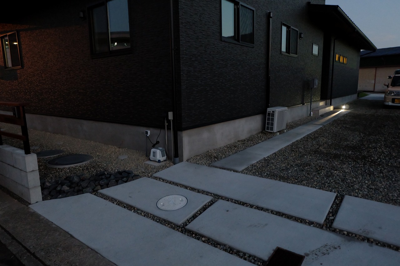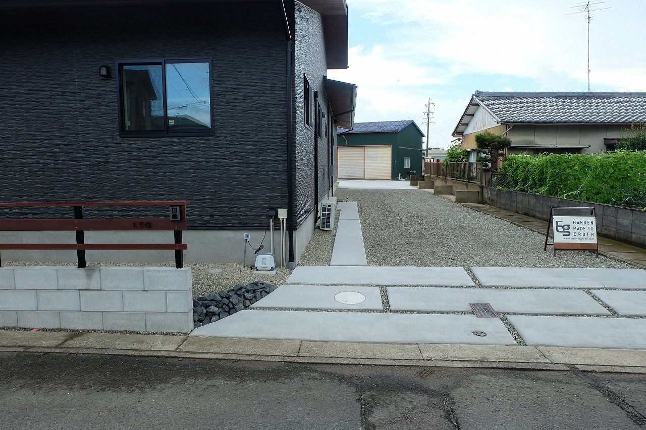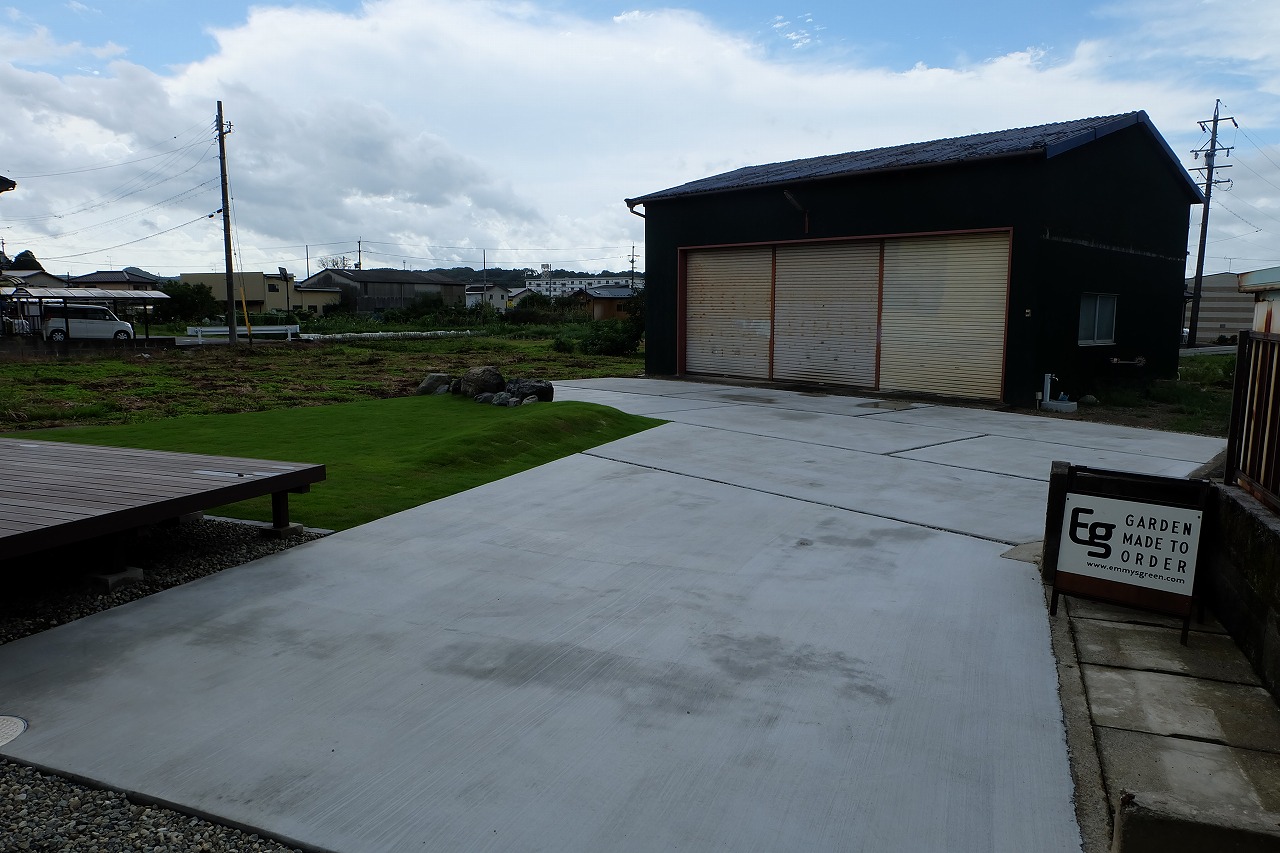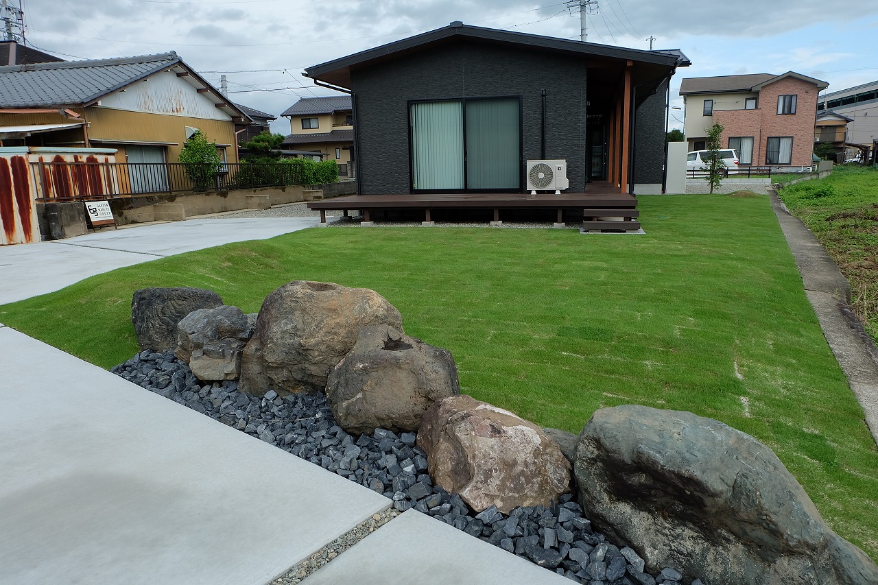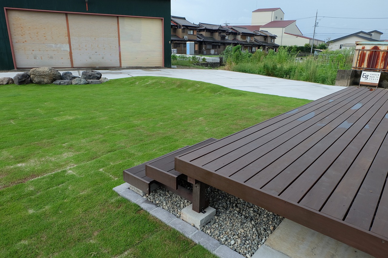 駐車場/ウッドデッキ/フェンス/門/芝生 車が面した道路から宅内へ入ると 広々とした芝生が広がります。 全てのリビング窓ガラスからウッドデッキと芝生が繋がっている為 とても開放的な空間に仕上がりました。 玄関へと続くアプローチは夜にはライトが床面を照らしている ので、とても幻想的でお洒落なデザインです。
