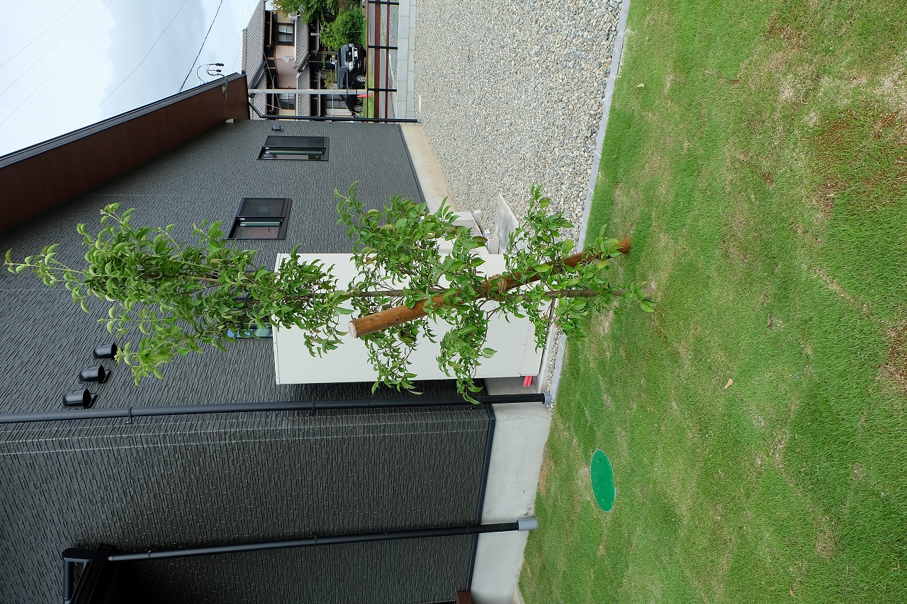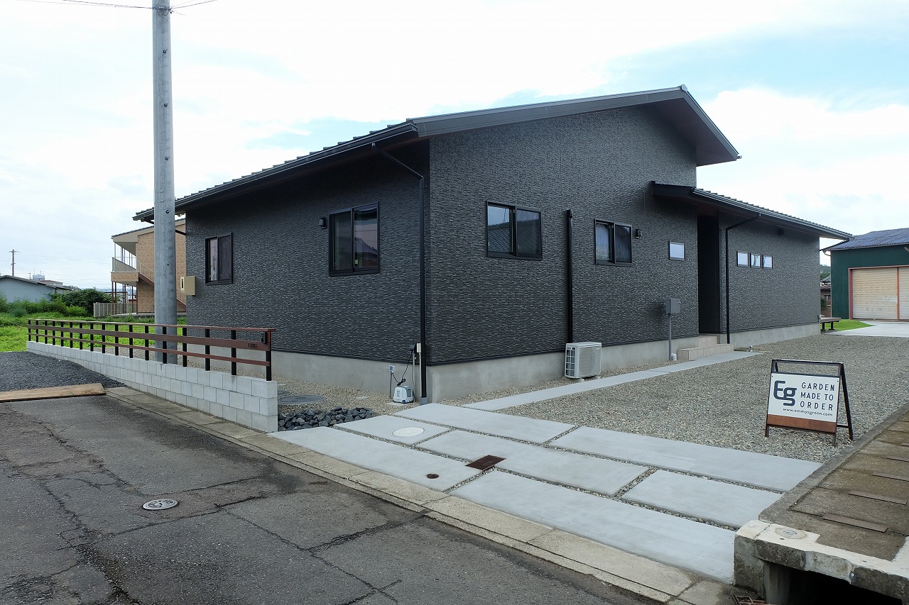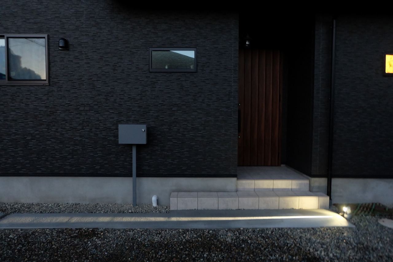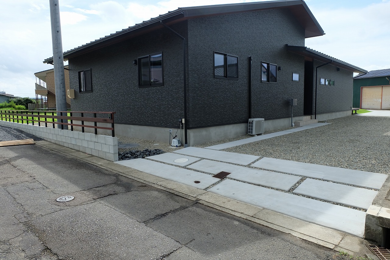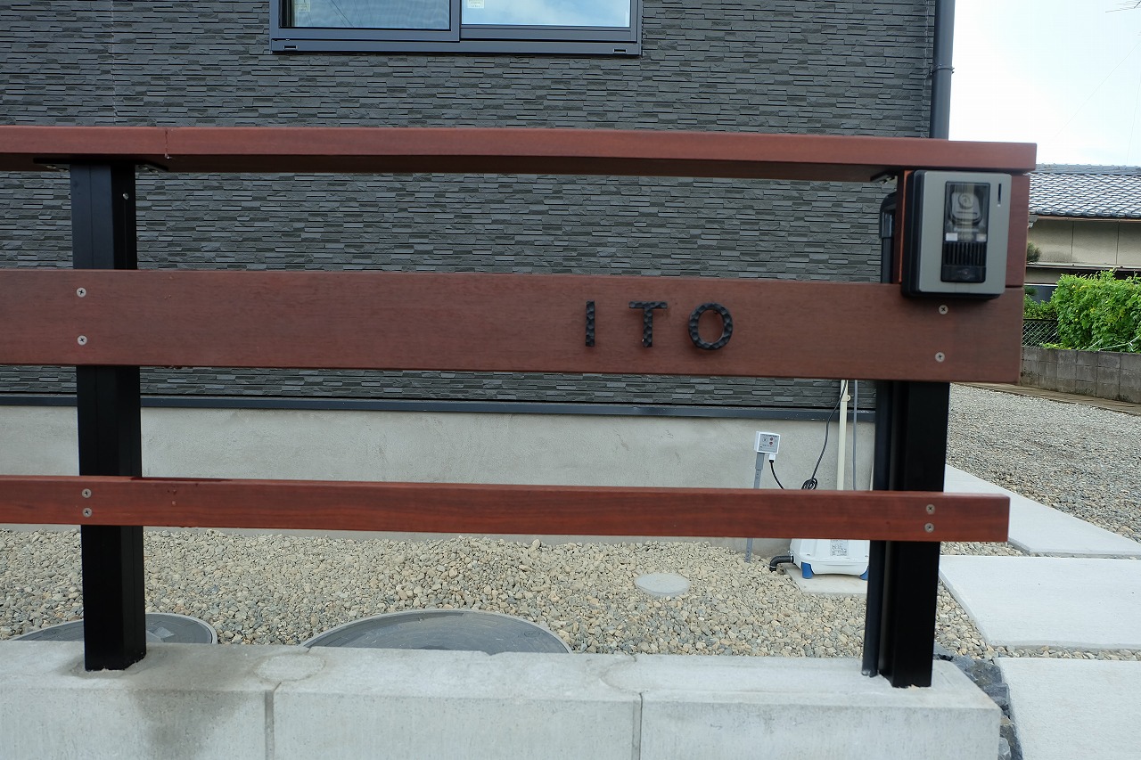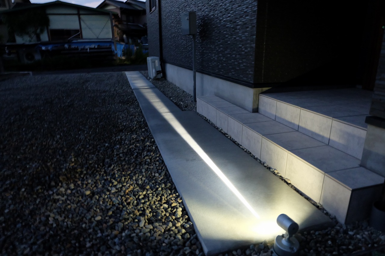 駐車場/ウッドデッキ/フェンス/門/芝生 車が面した道路から宅内へ入ると 広々とした芝生が広がります。 全てのリビング窓ガラスからウッドデッキと芝生が繋がっている為 とても開放的な空間に仕上がりました。 玄関へと続くアプローチは夜にはライトが床面を照らしている ので、とても幻想的でお洒落なデザインです。