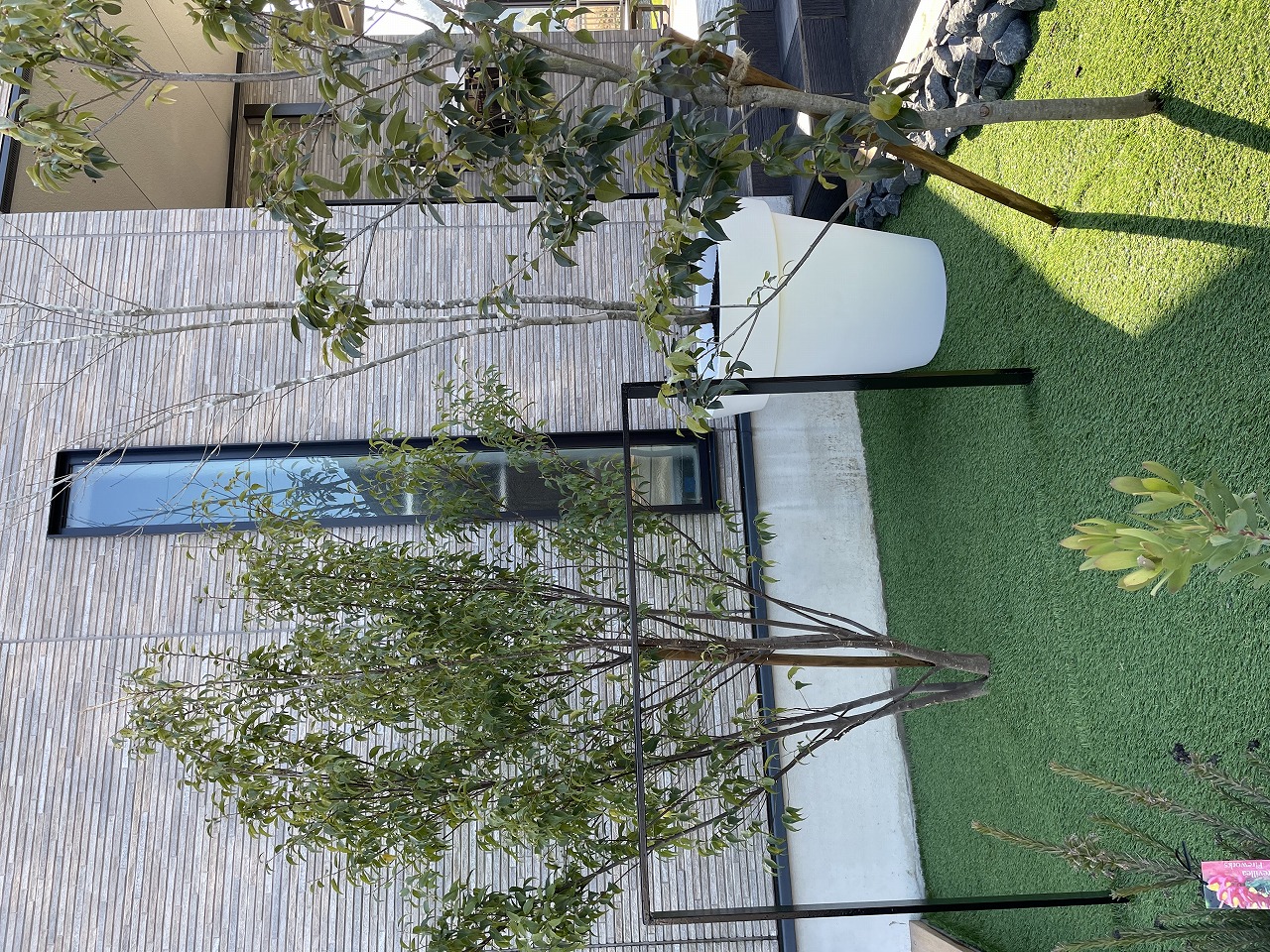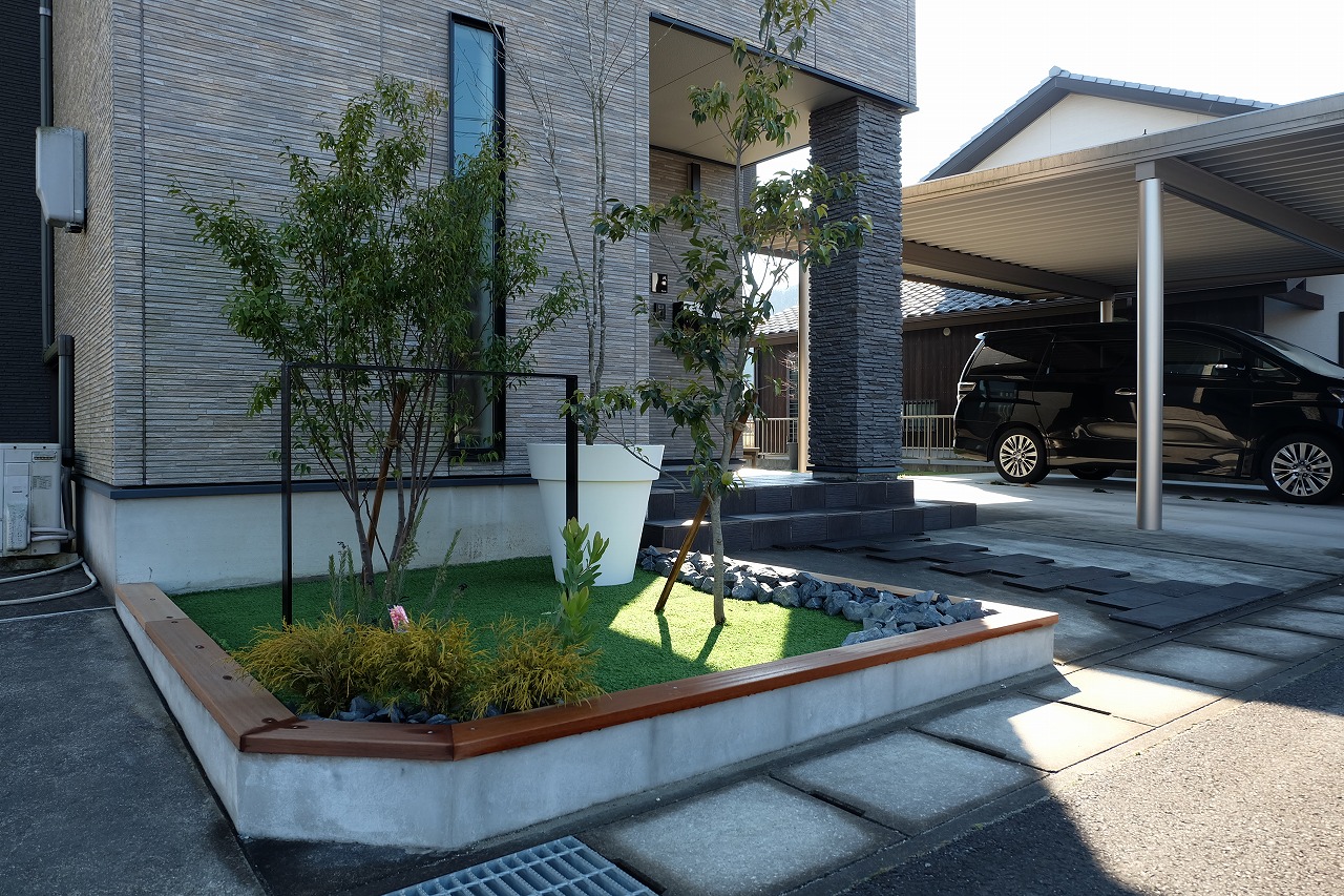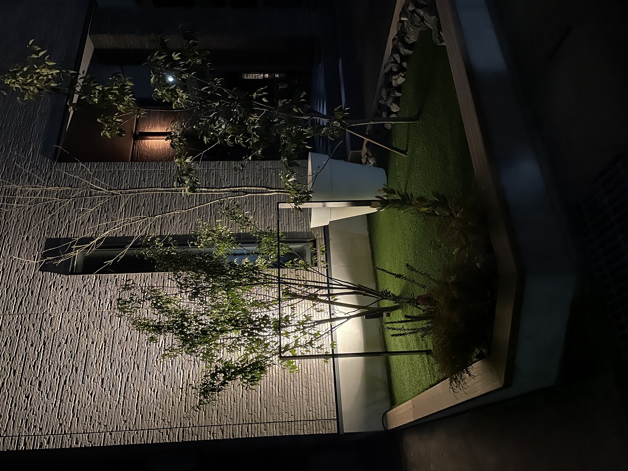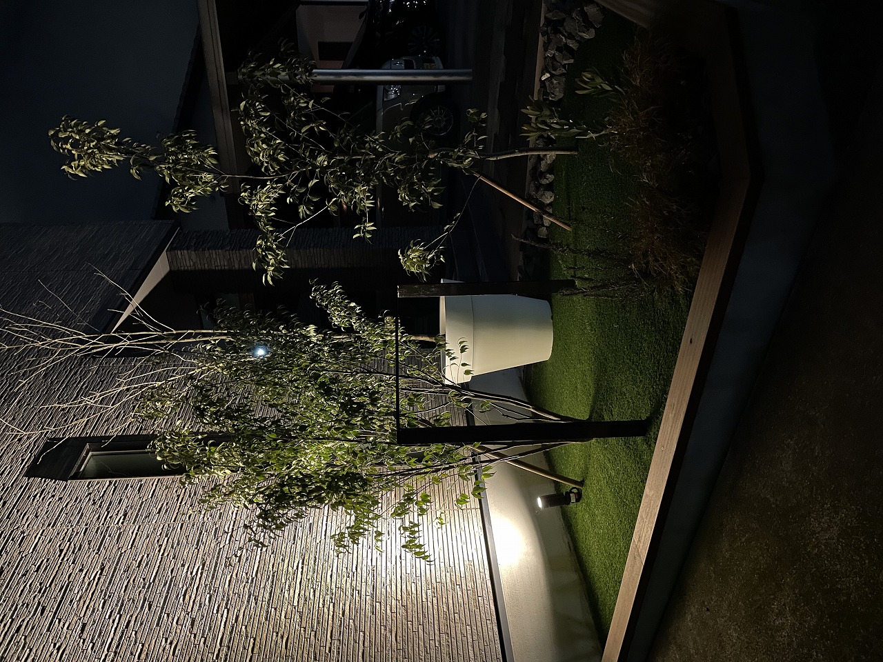 植栽工事/人工芝/アイアンフェンス/照明 一部のみのガーデンリフォーム工事をお任せいただきました 玄関前のスペースに植物や大きな鉢植え、アイアンフェンスを 設置して、立体的なバランスを検討したお庭の空間創りを提案させて頂きました。 更に夜には照明を付ける事によって、お昼の表情とはまた違う大人っぽい印象になりました。 床面はメンテナンスが掛からない様、人工芝を貼りました。 結果、空間のコントラスを生かす良いスパイスとなりました