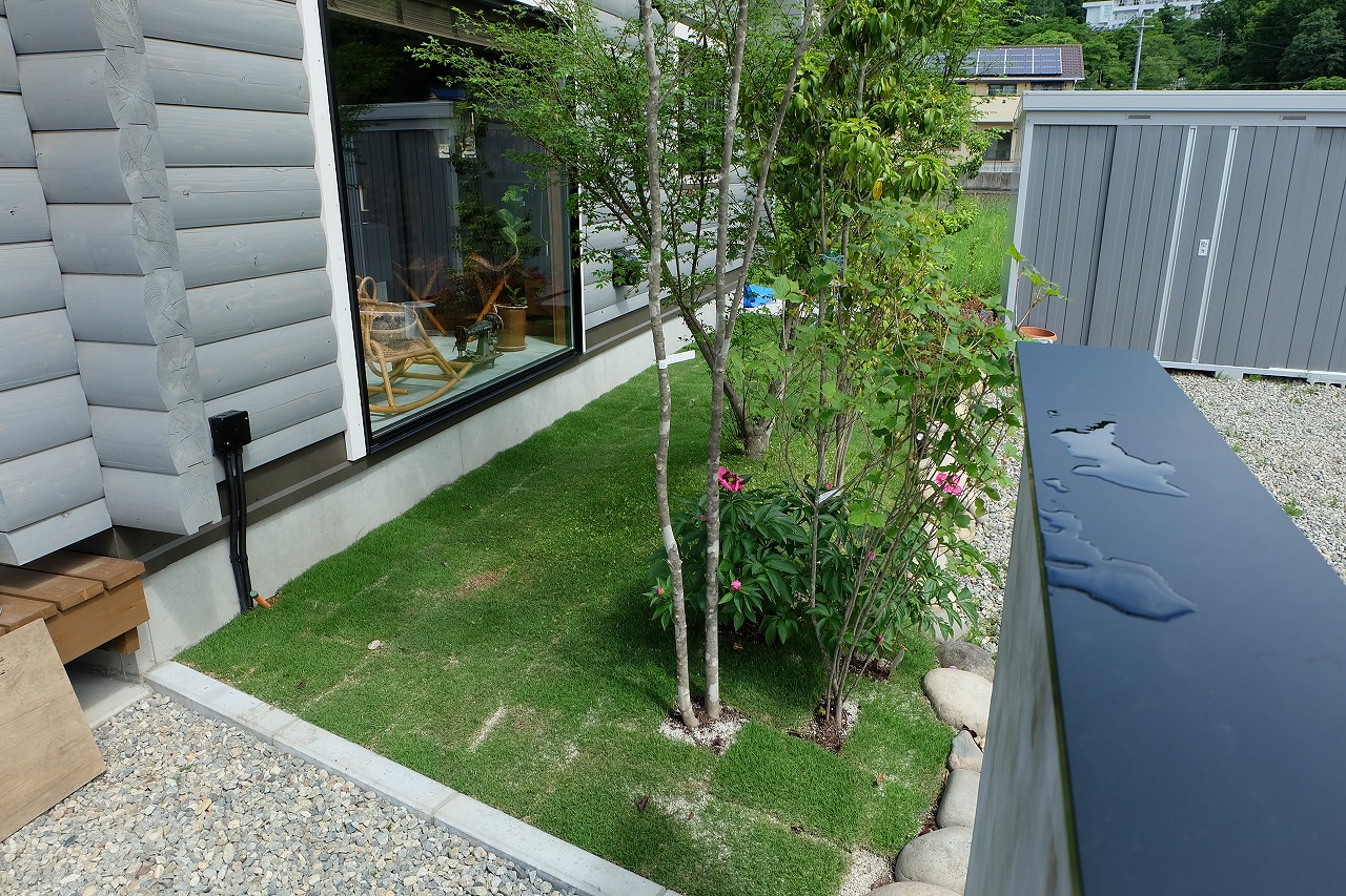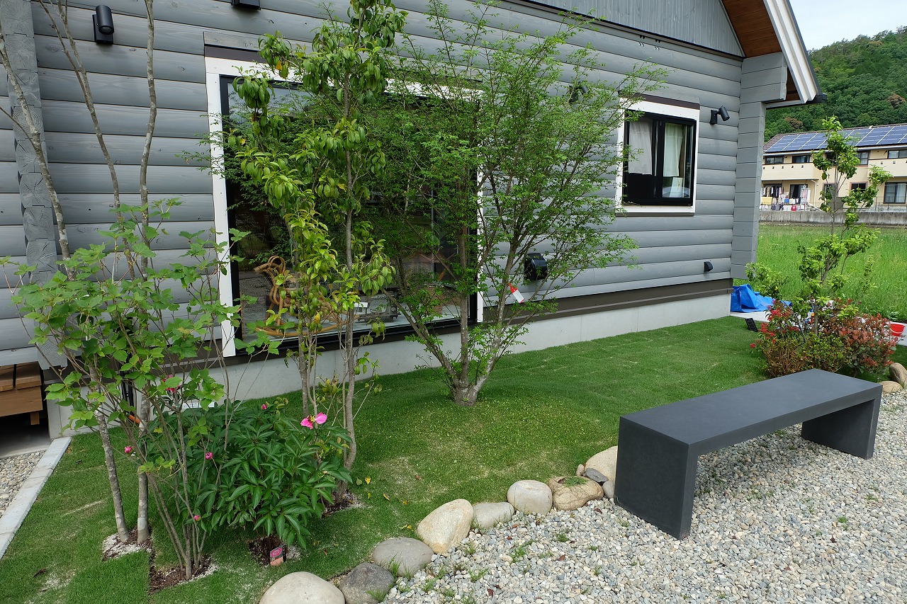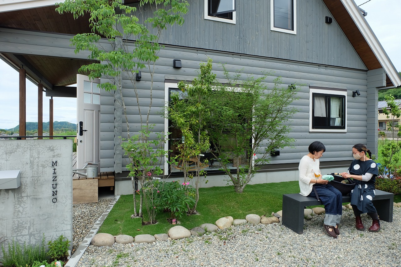 駐車場/門/アプローチ/植栽工事 自宅から、山も川も眺める事のできる絶景のロケーションに建つ ログハウス。 別荘に居る様な感覚になってしまう家には、植栽を多く植え付け、 町のザワメキを感じさせない緑豊かな空間を造りました。 ピクチャーウィンドウから庭を眺める先には静かにベンチを配置。 眺めているだけでも癒されます。 ちょっとした来客時にも、このベンチに座りながら木陰でお茶をできるようにしました。 家の中より会話は弾む。