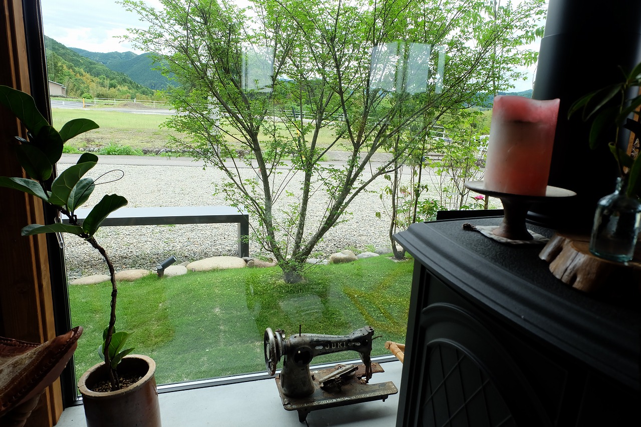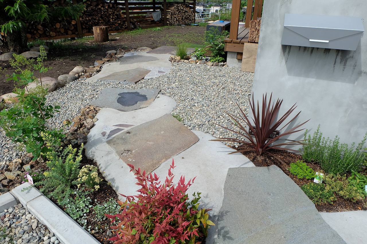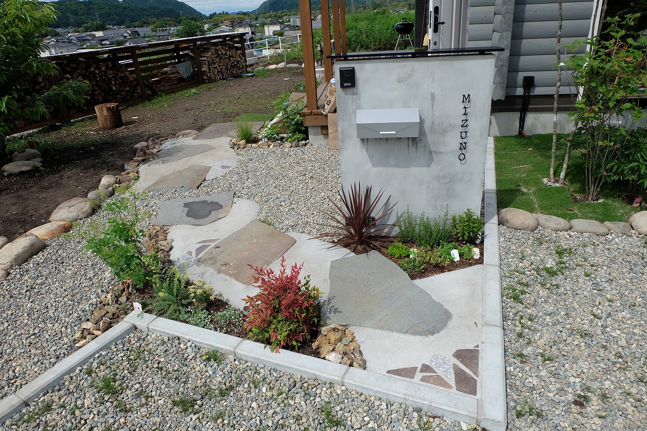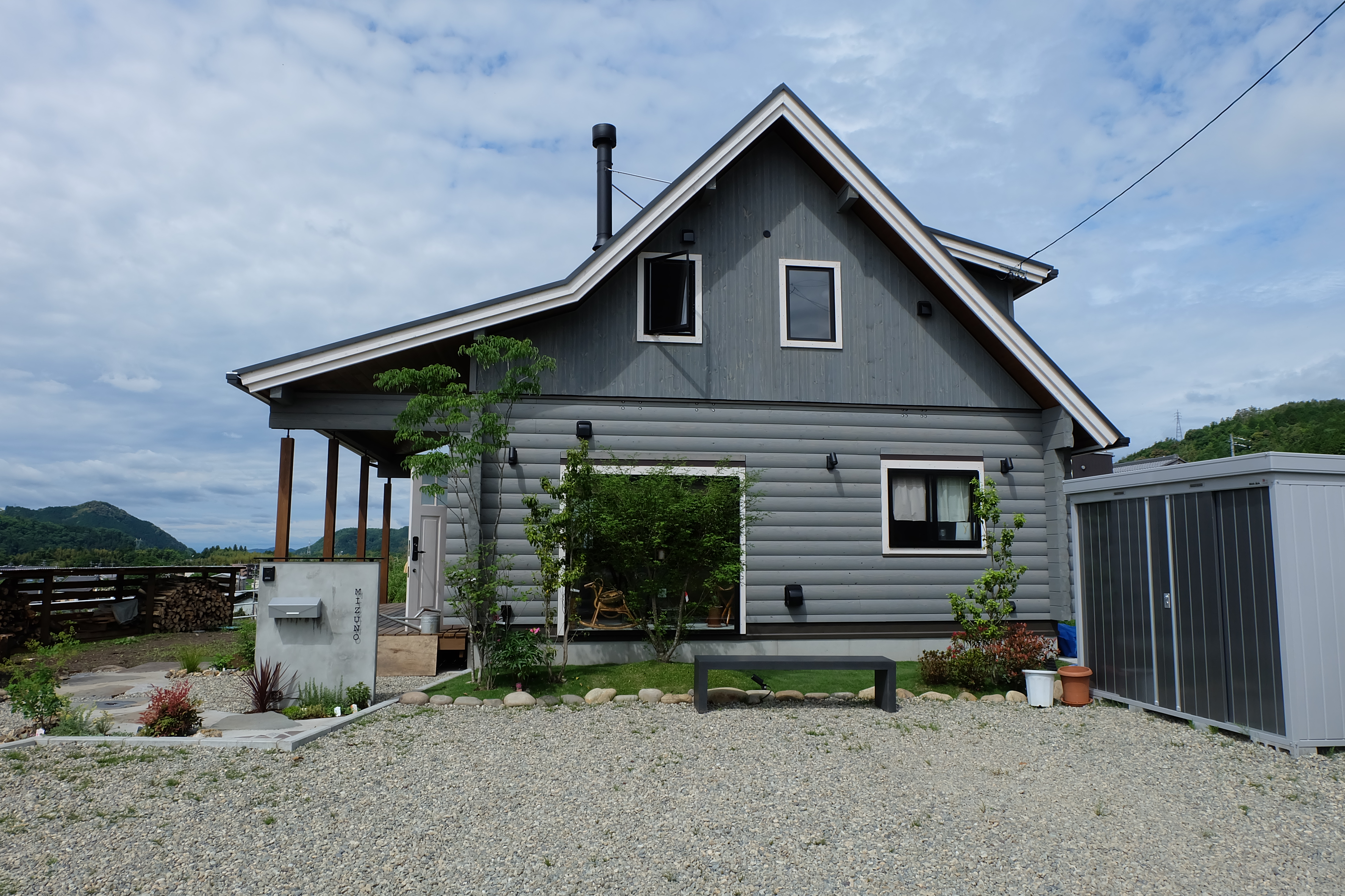 駐車場/門/アプローチ/植栽工事 自宅から、山も川も眺める事のできる絶景のロケーションに建つ ログハウス。 別荘に居る様な感覚になってしまう家には、植栽を多く植え付け、 町のザワメキを感じさせない緑豊かな空間を造りました。 ピクチャーウィンドウから庭を眺める先には静かにベンチを配置。 眺めているだけでも癒されます。 ちょっとした来客時にも、このベンチに座りながら木陰でお茶をできるようにしました。 家の中より会話は弾む。