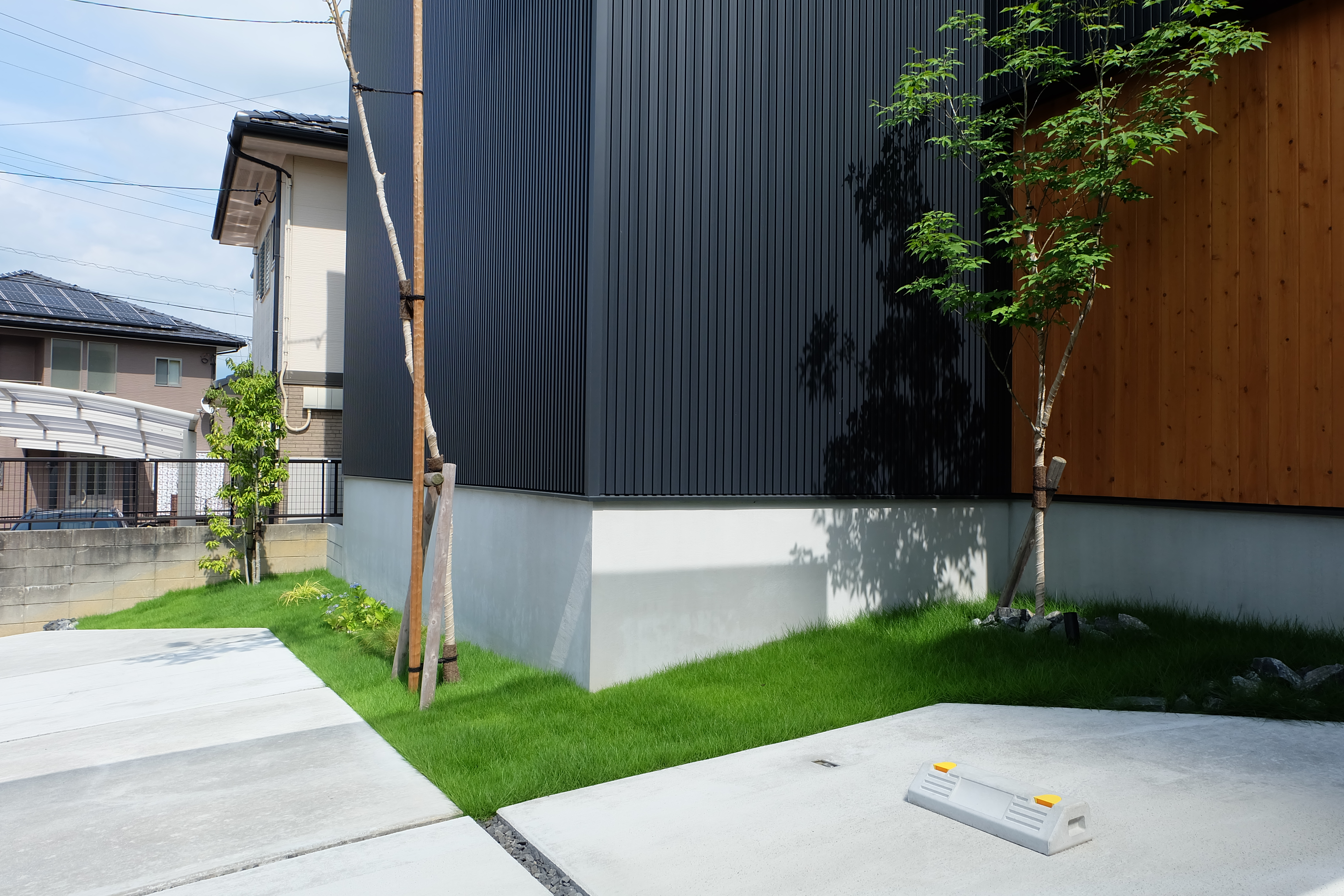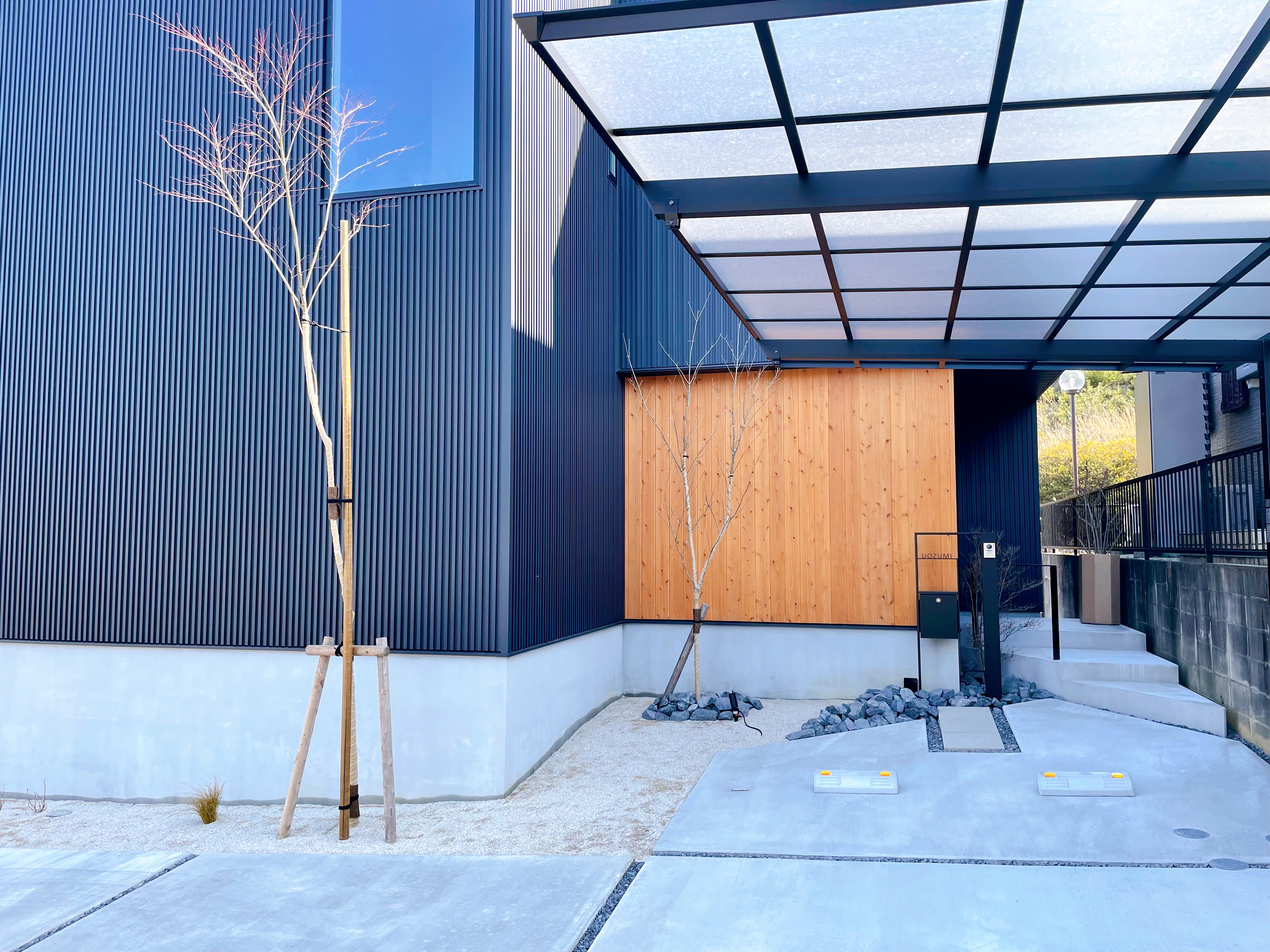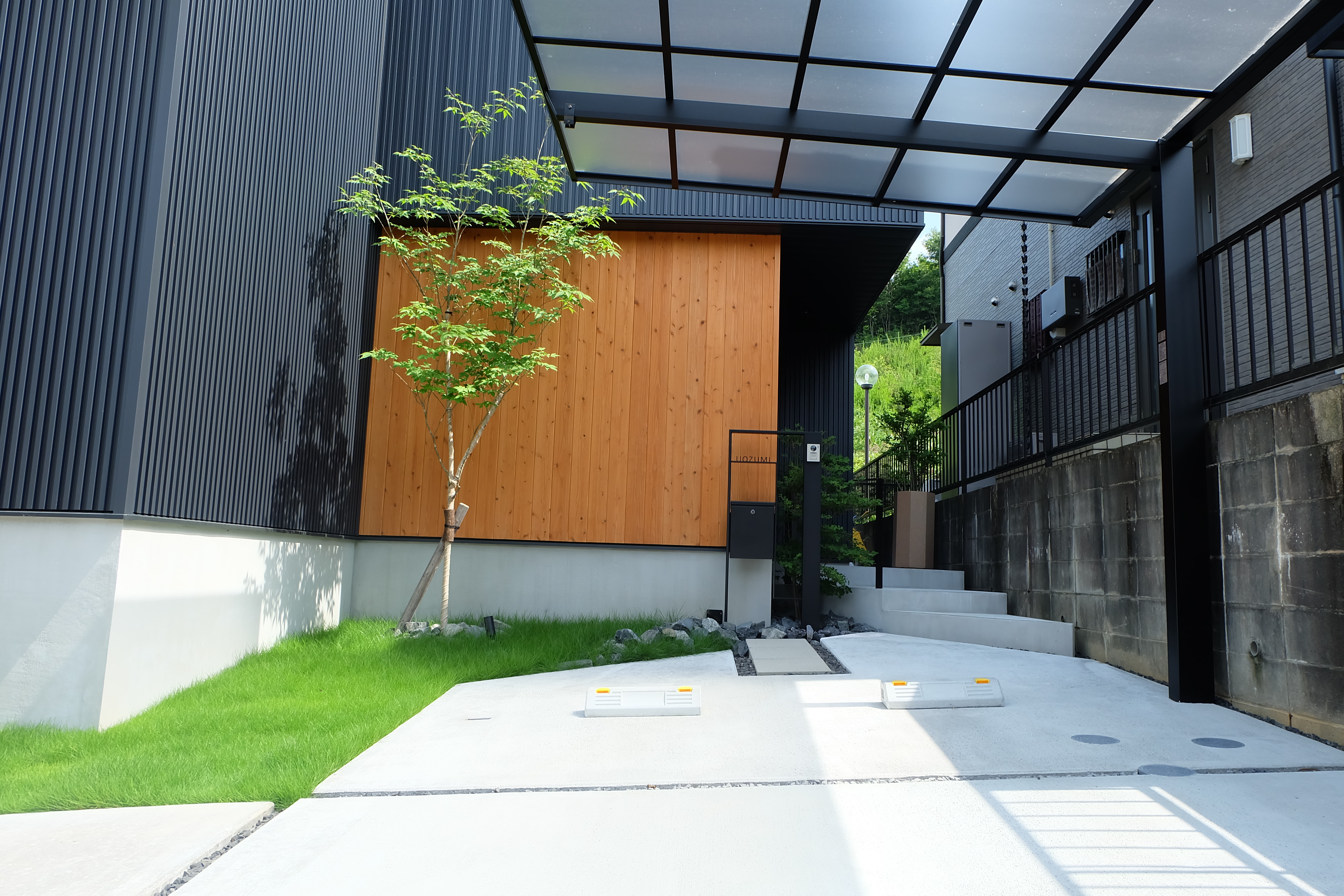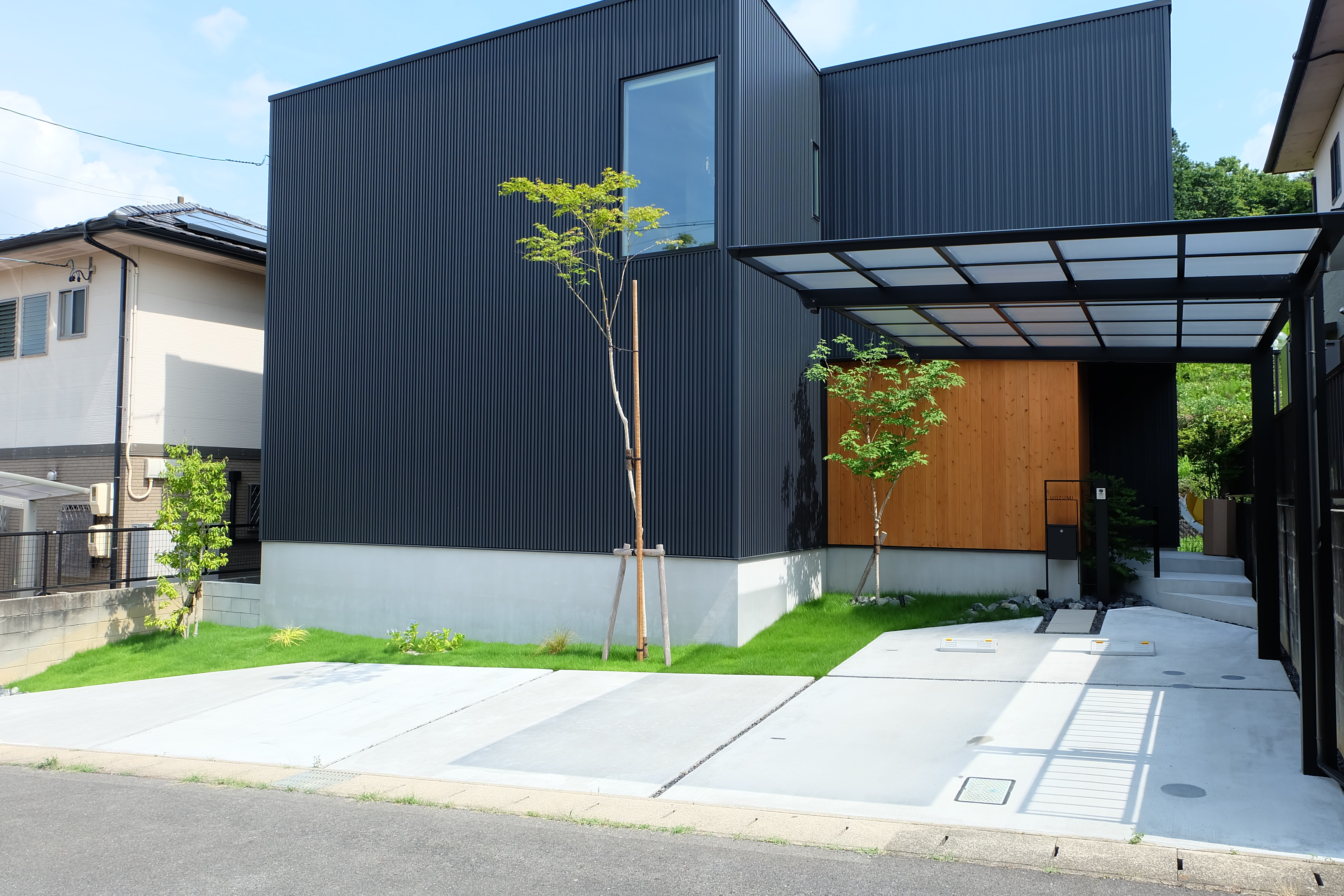 カーポート/駐車場/機能門柱/植栽工事 スッキリとまとめたスタイリッシュな外観のお家に 合うよう、Exteriorのデザインもスッキリとまとめています 手すりや機能門柱をアイアン製品でまとめて、植栽工事で 柔らかさをだしています。 芝生の生えた夏と冬の枯れ葉の違う雰囲気を比べてご覧ください 落葉樹の葉のないシーンもとっても樹木の生命力を感じる 良い雰囲気です
