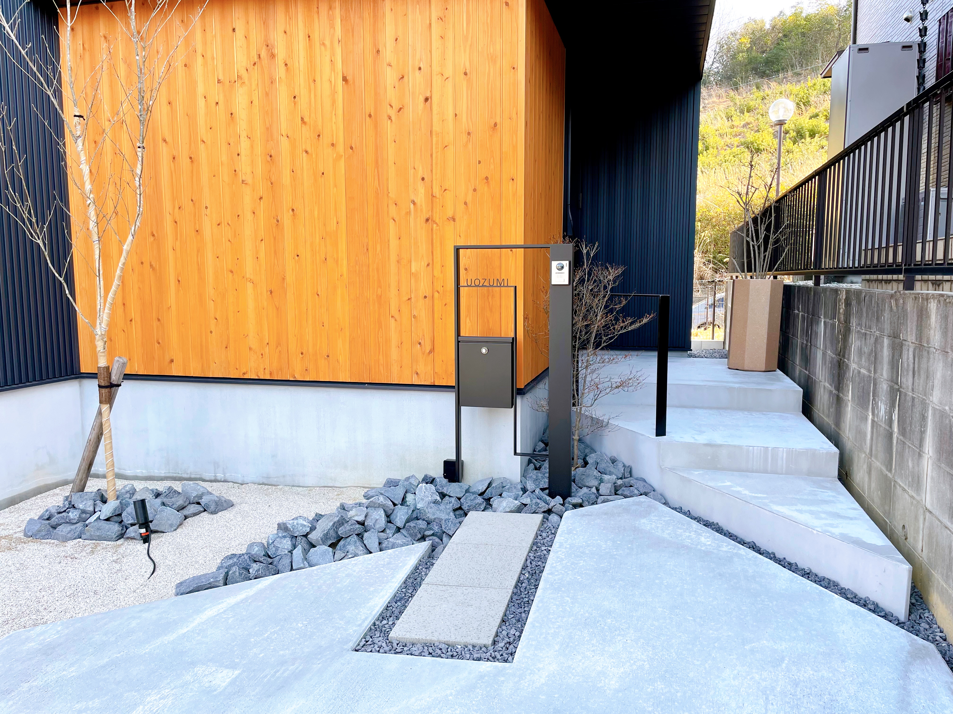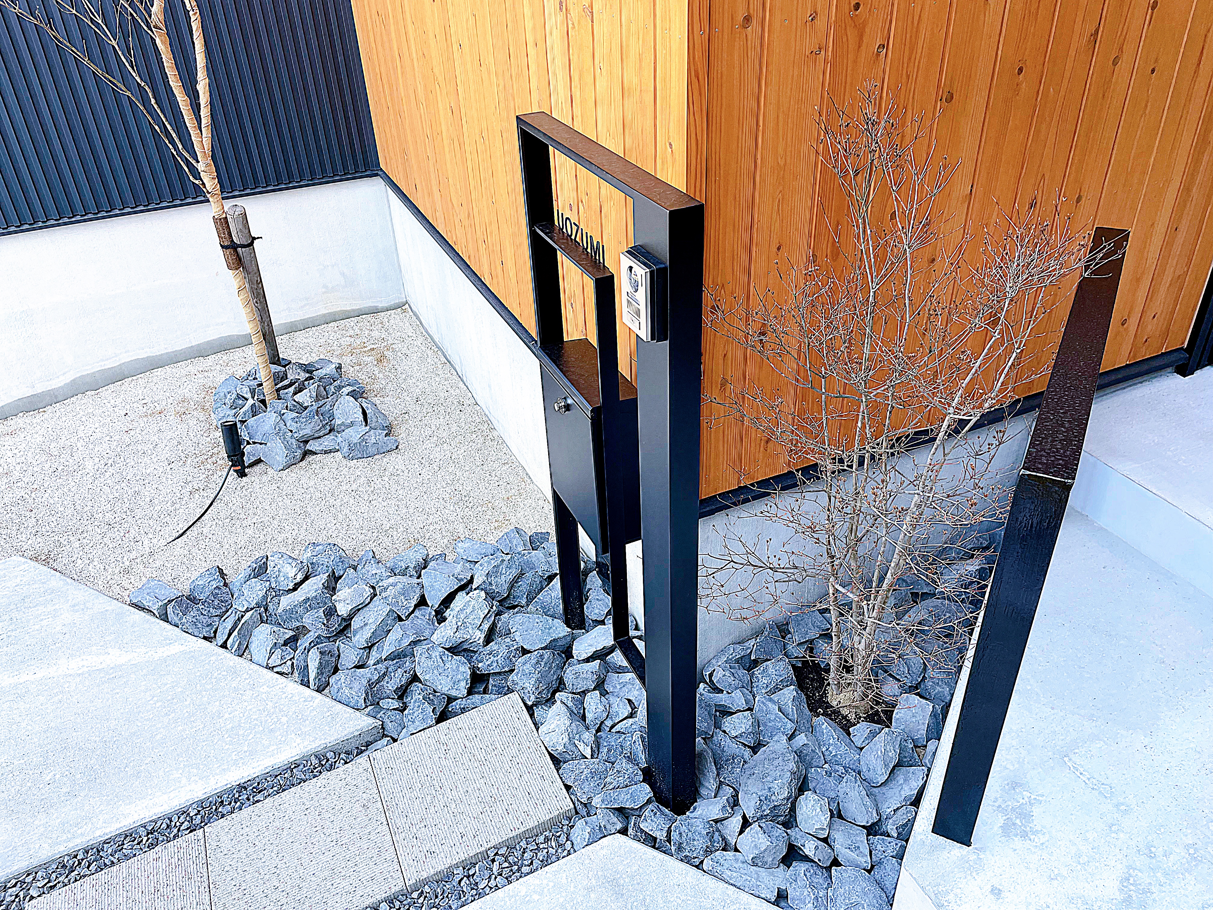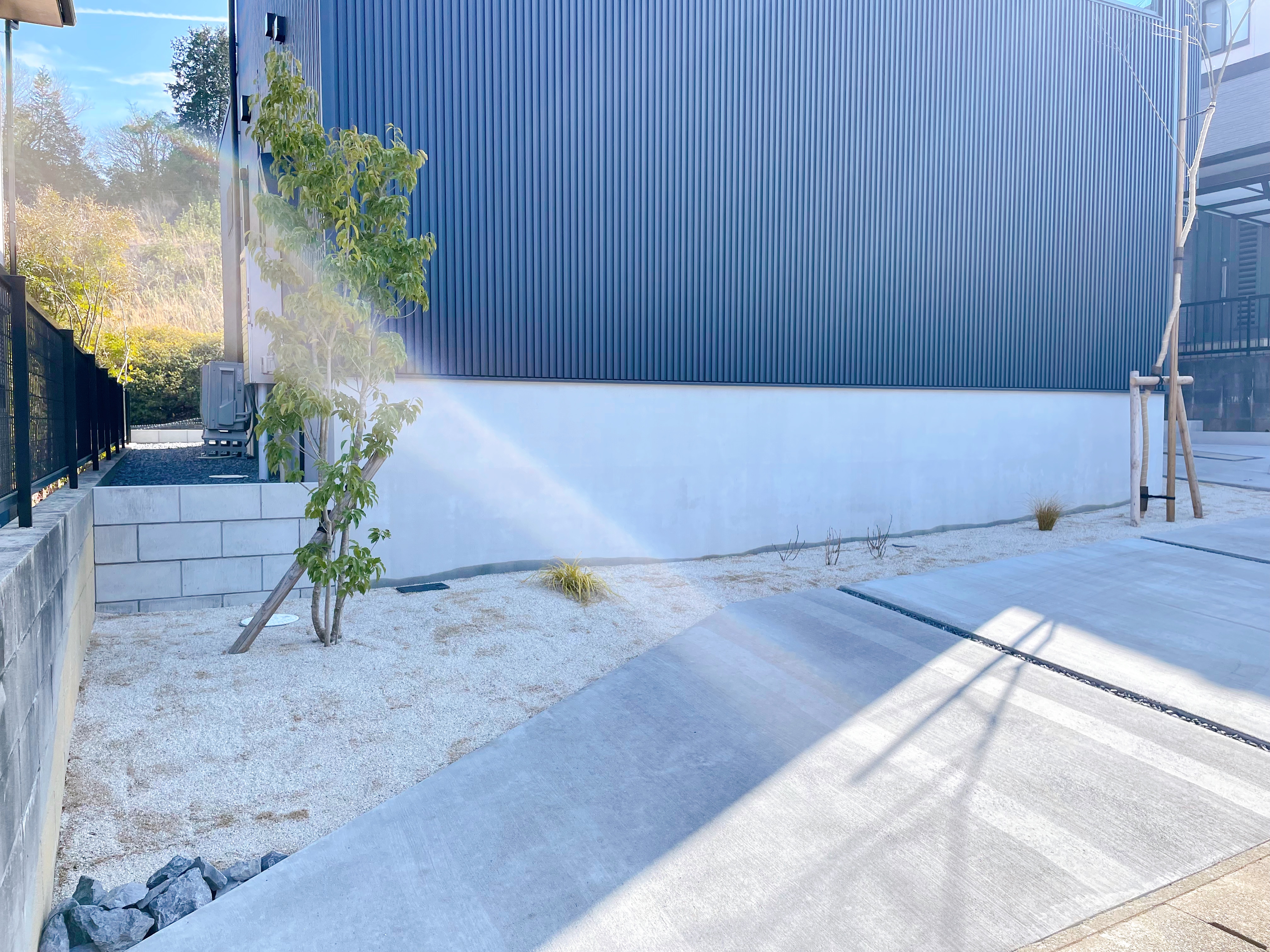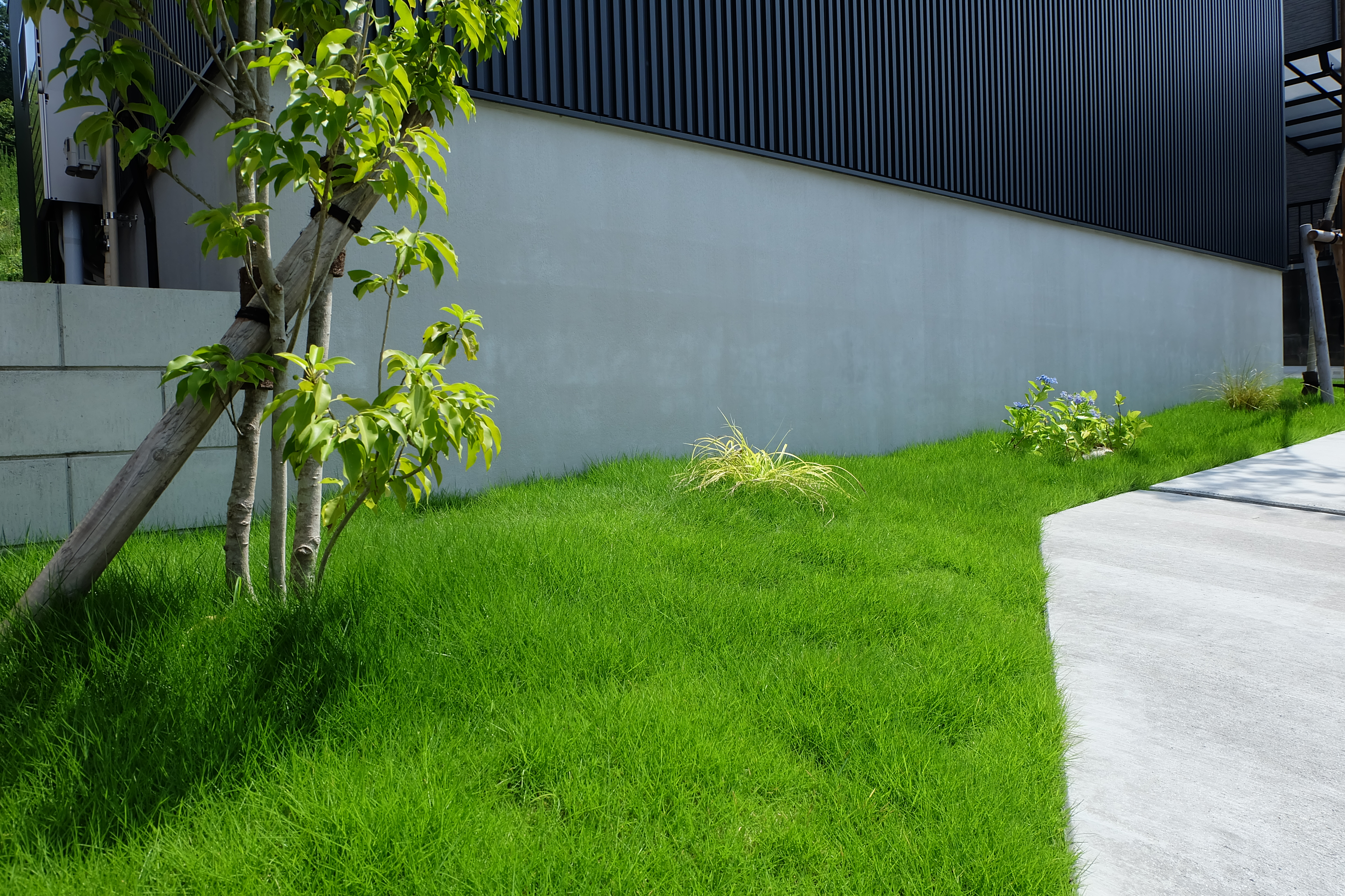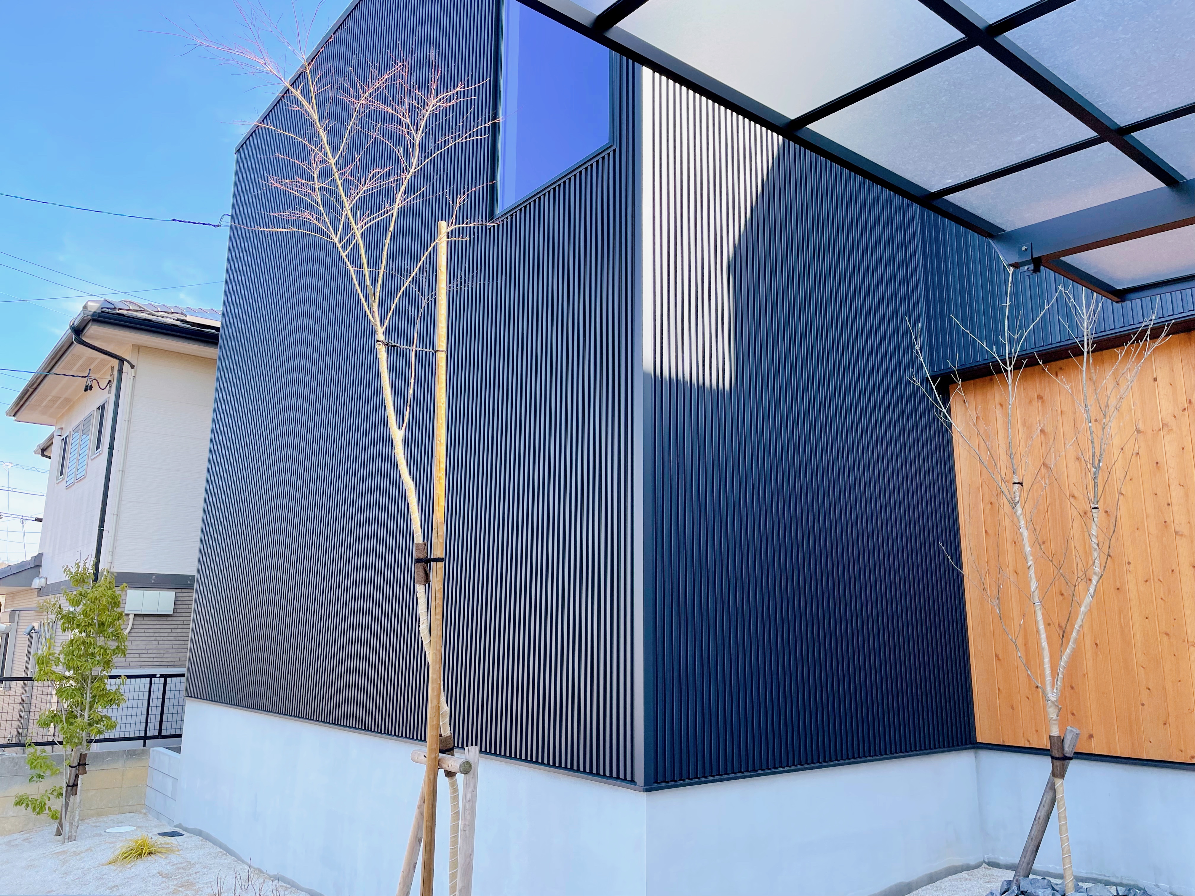 カーポート/駐車場/機能門柱/植栽工事 スッキリとまとめたスタイリッシュな外観のお家に 合うよう、Exteriorのデザインもスッキリとまとめています 手すりや機能門柱をアイアン製品でまとめて、植栽工事で 柔らかさをだしています。 芝生の生えた夏と冬の枯れ葉の違う雰囲気を比べてご覧ください 落葉樹の葉のないシーンもとっても樹木の生命力を感じる 良い雰囲気です