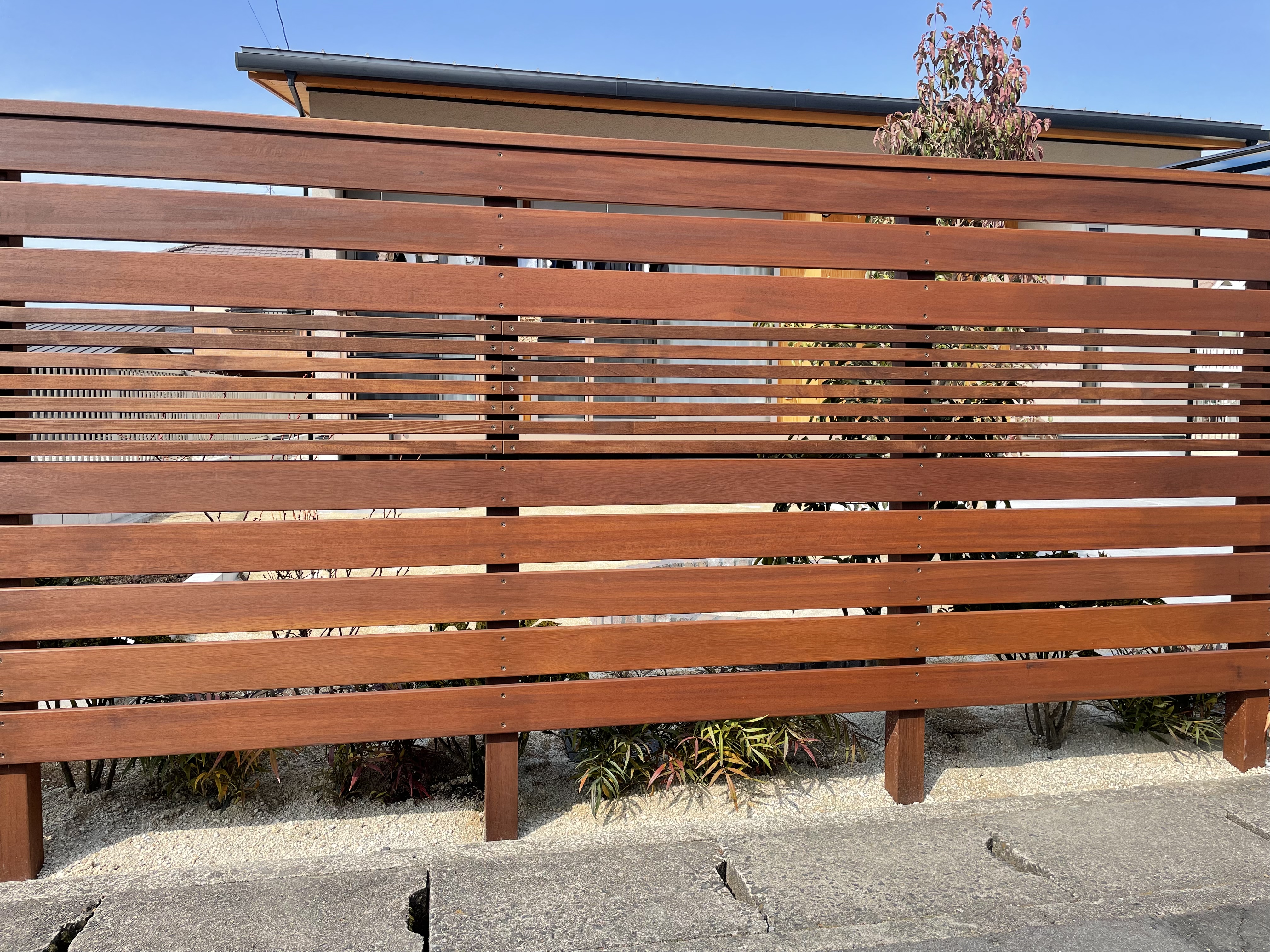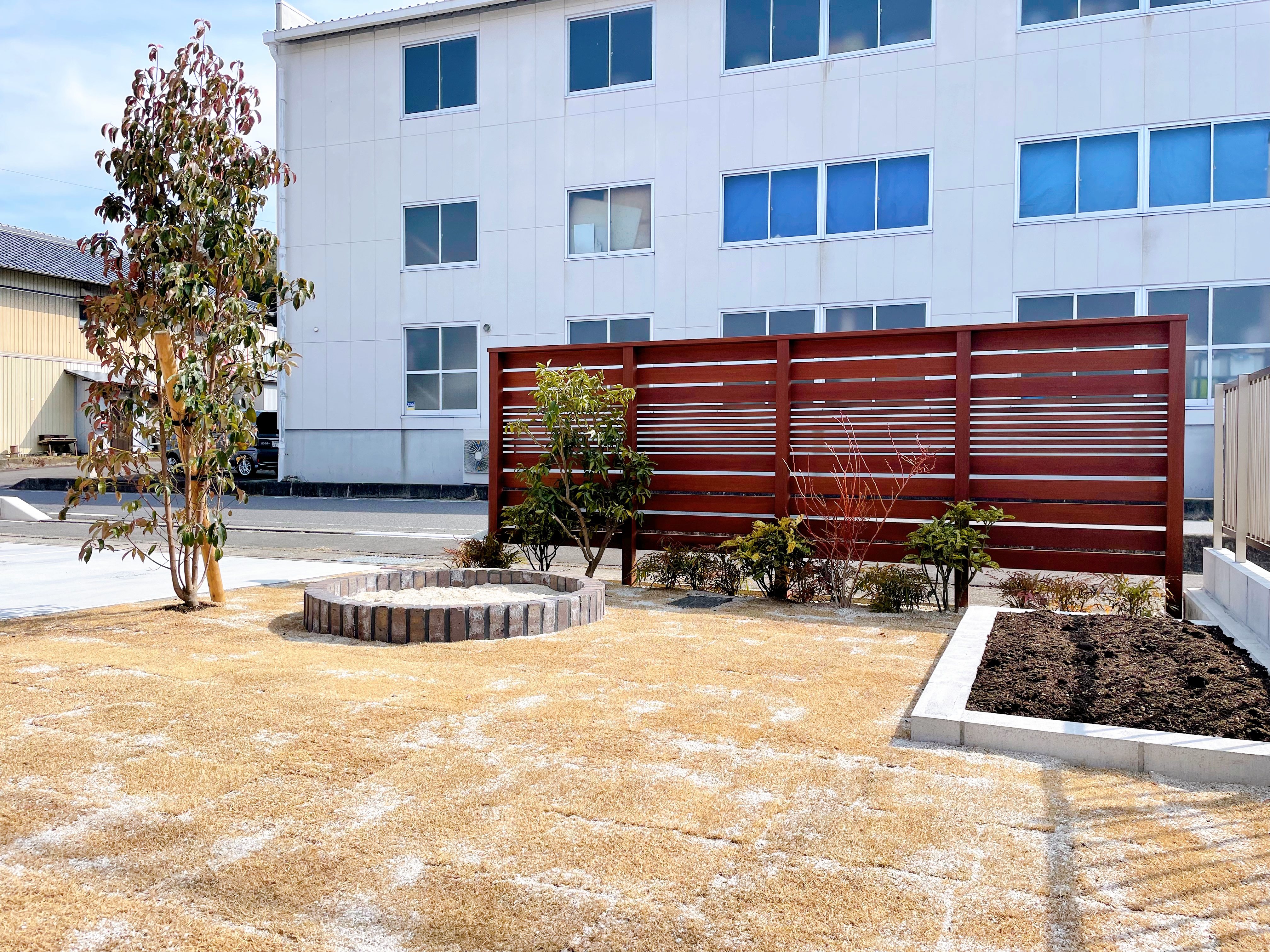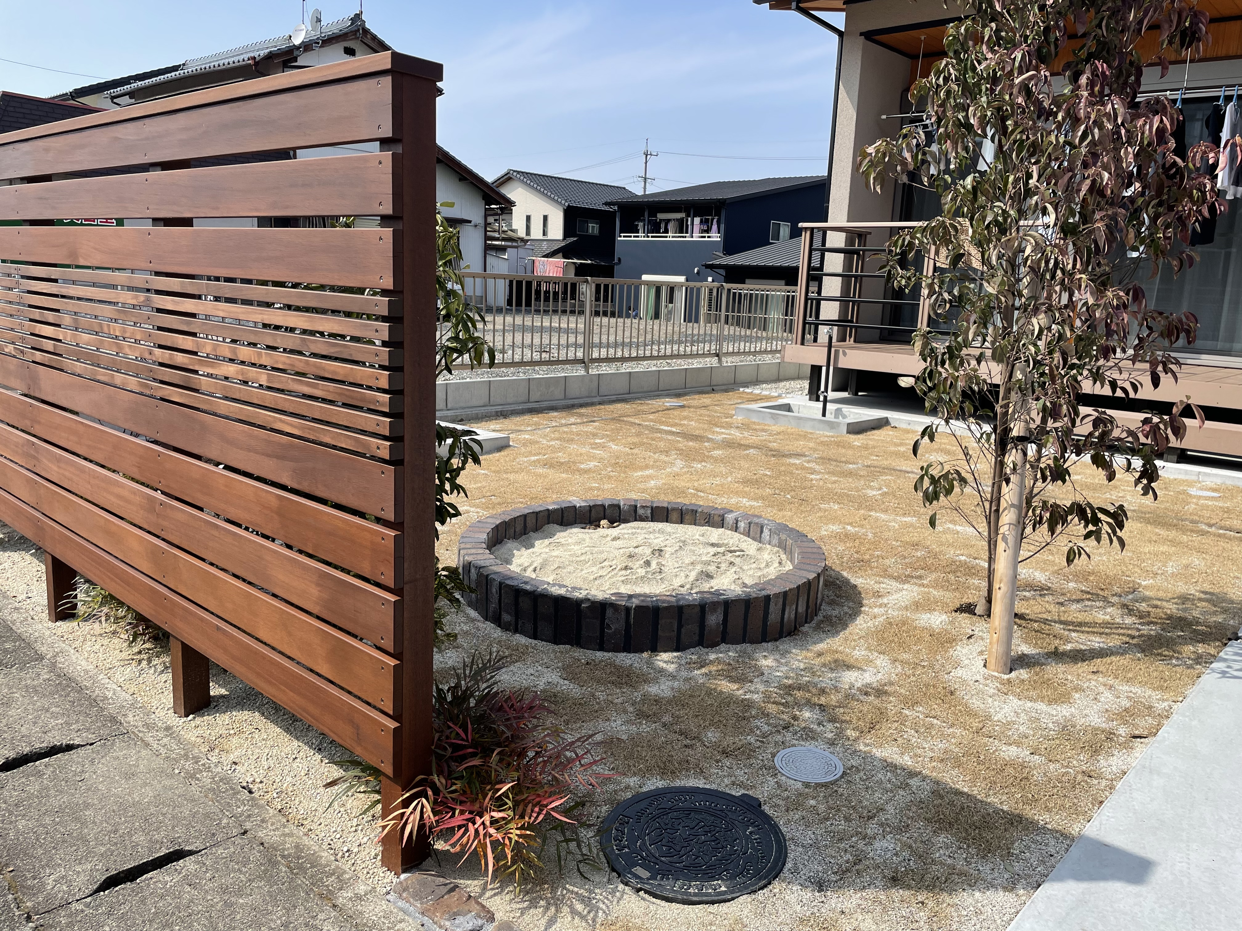 目隠しフェンス/ハードウッド/花壇/立水栓/植栽工事 目隠しフェンスがあるのはやはり安心感があります ご近所や道路からの目線を気にする事無くくつろげる 空間はとても貴重です フェンスのデザインもこだわったポイントです! こちらは花壇や畑もあり、家族で楽しむ空間が造られています 芝生を張ったので、お外で遊べる時期は素足でも歩けるので 気持ちが良いですね! ※撮影時冬季