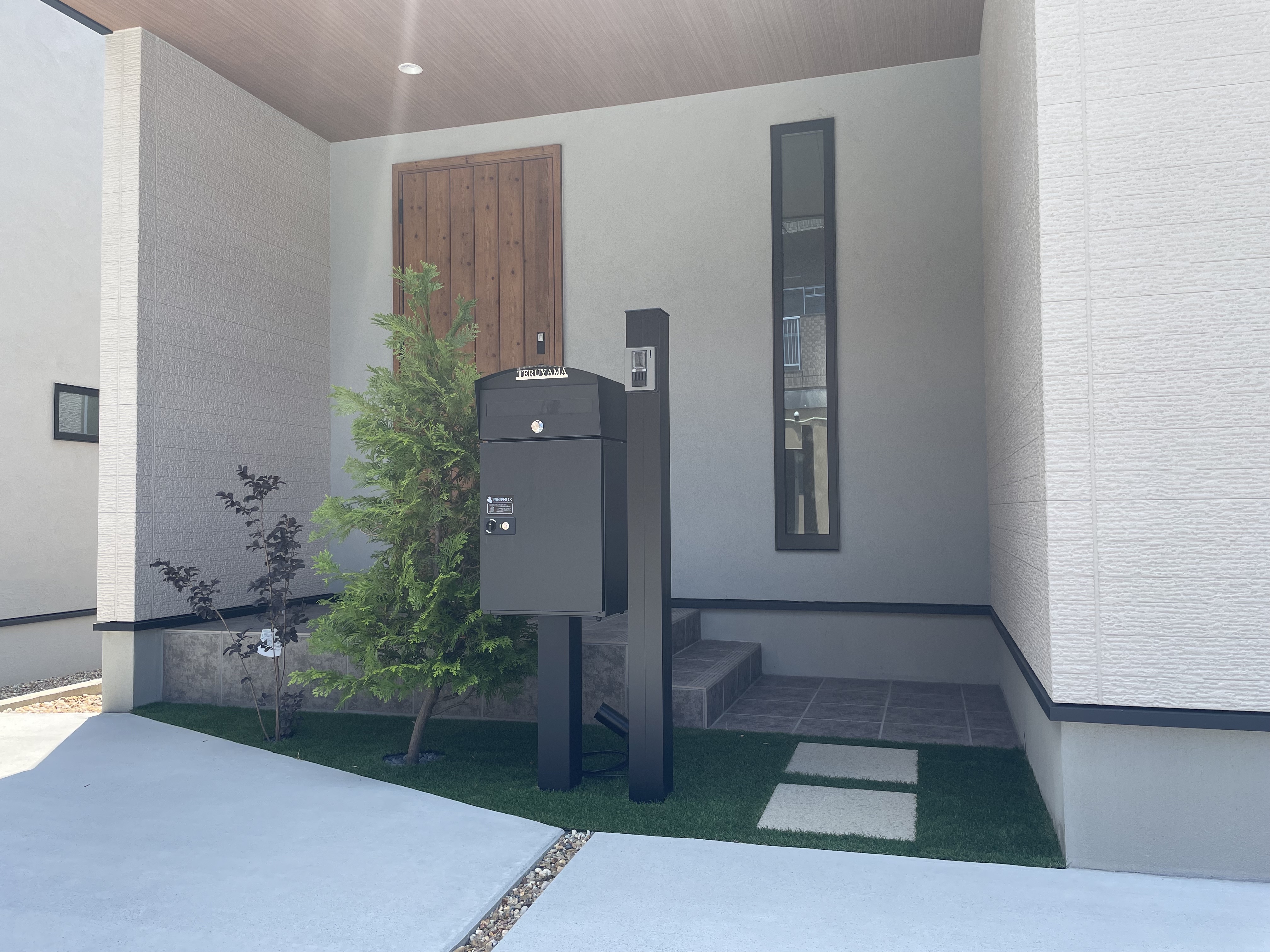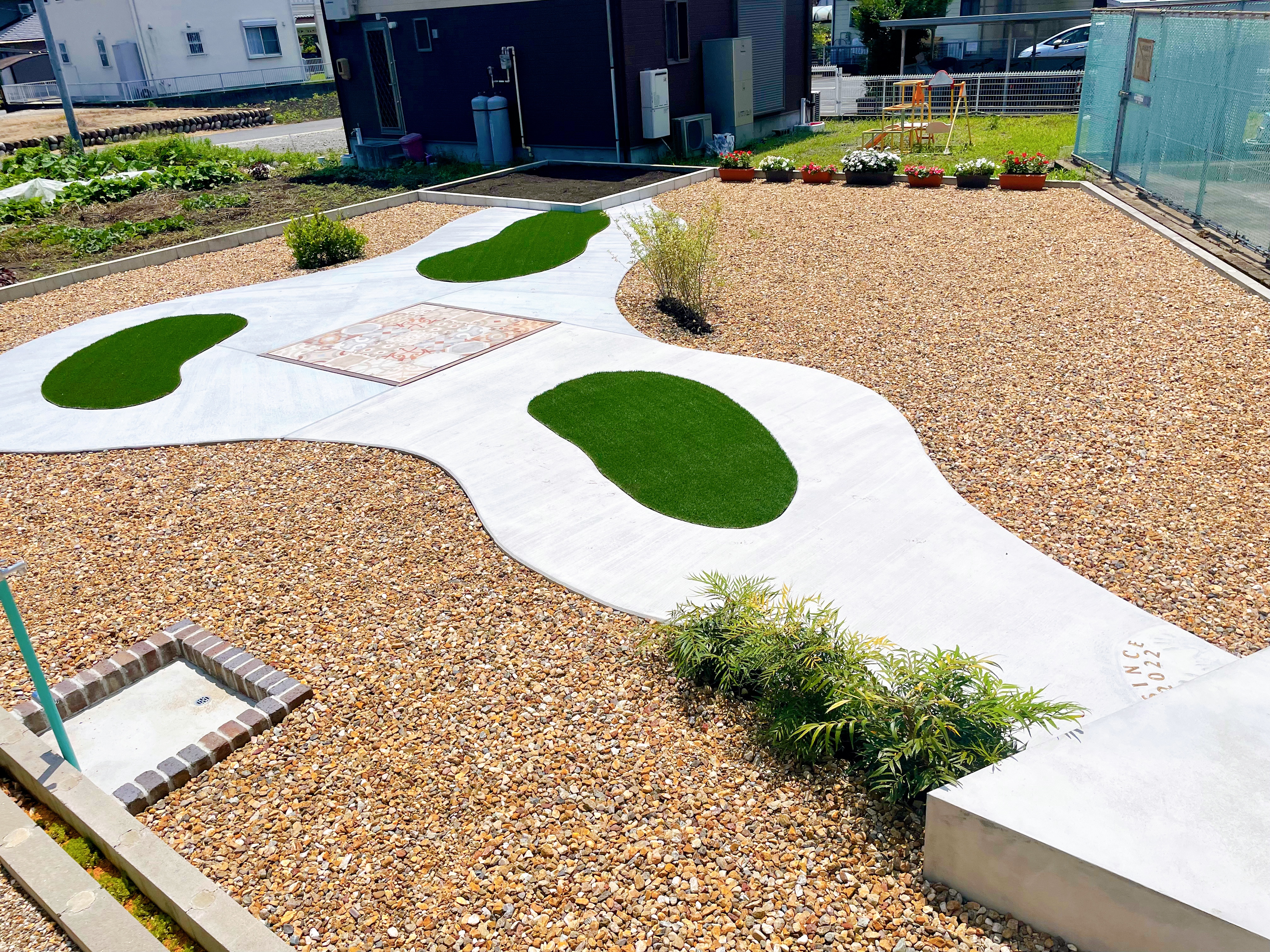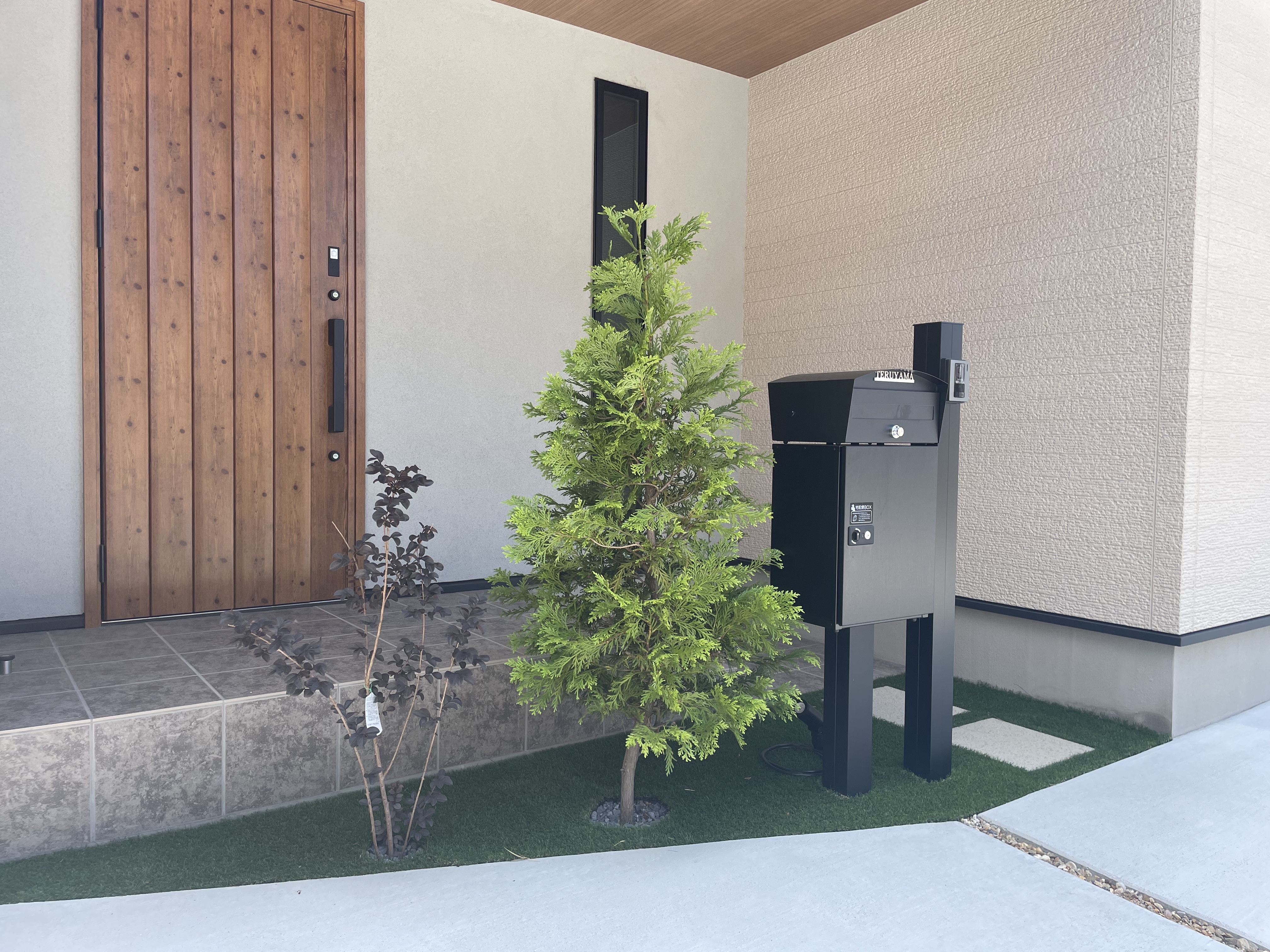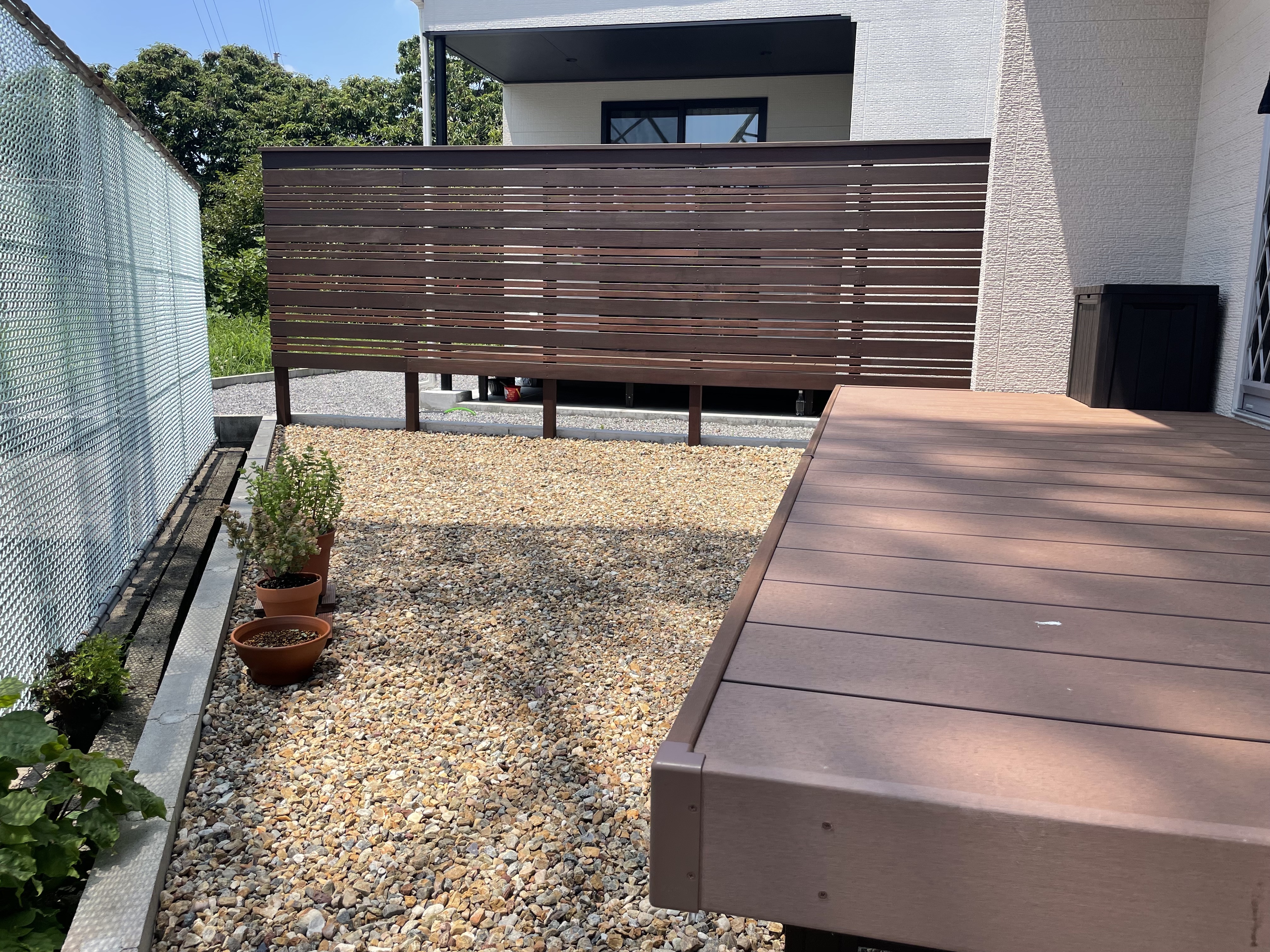 目隠しフェンス/ウッドデッキ/モルタルデッキ/植栽工事/宅配ボックス リビングの窓越しに見える広いお庭 機能的に使う部分と意匠性を兼ね備えた管理しやすいお庭となりました 家族との思い出に残した手形と真鍮レターも素敵です また、目隠しフェンスでプライバシーをしっかり確保しました こちらもメンテナンスフリーの天然木です