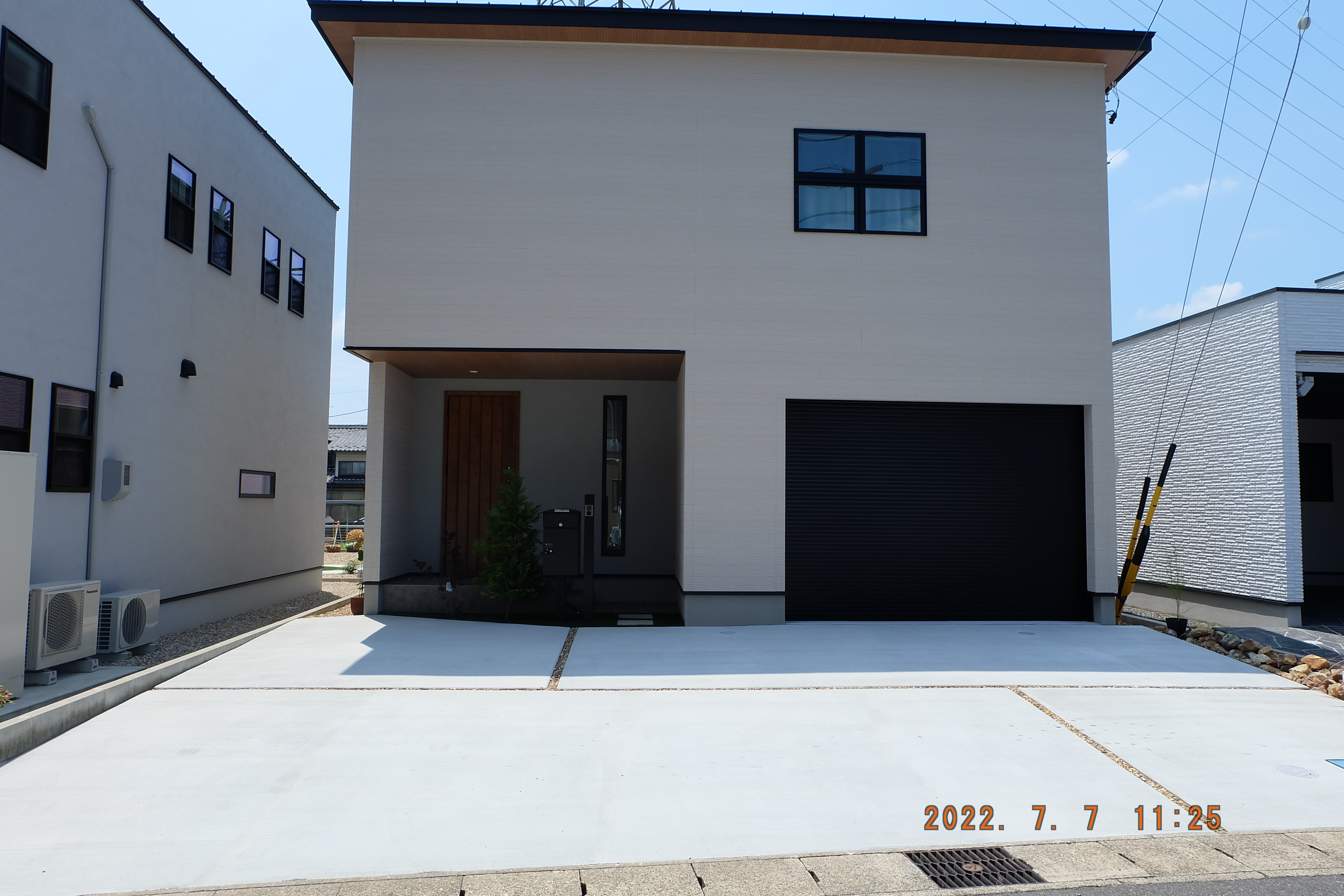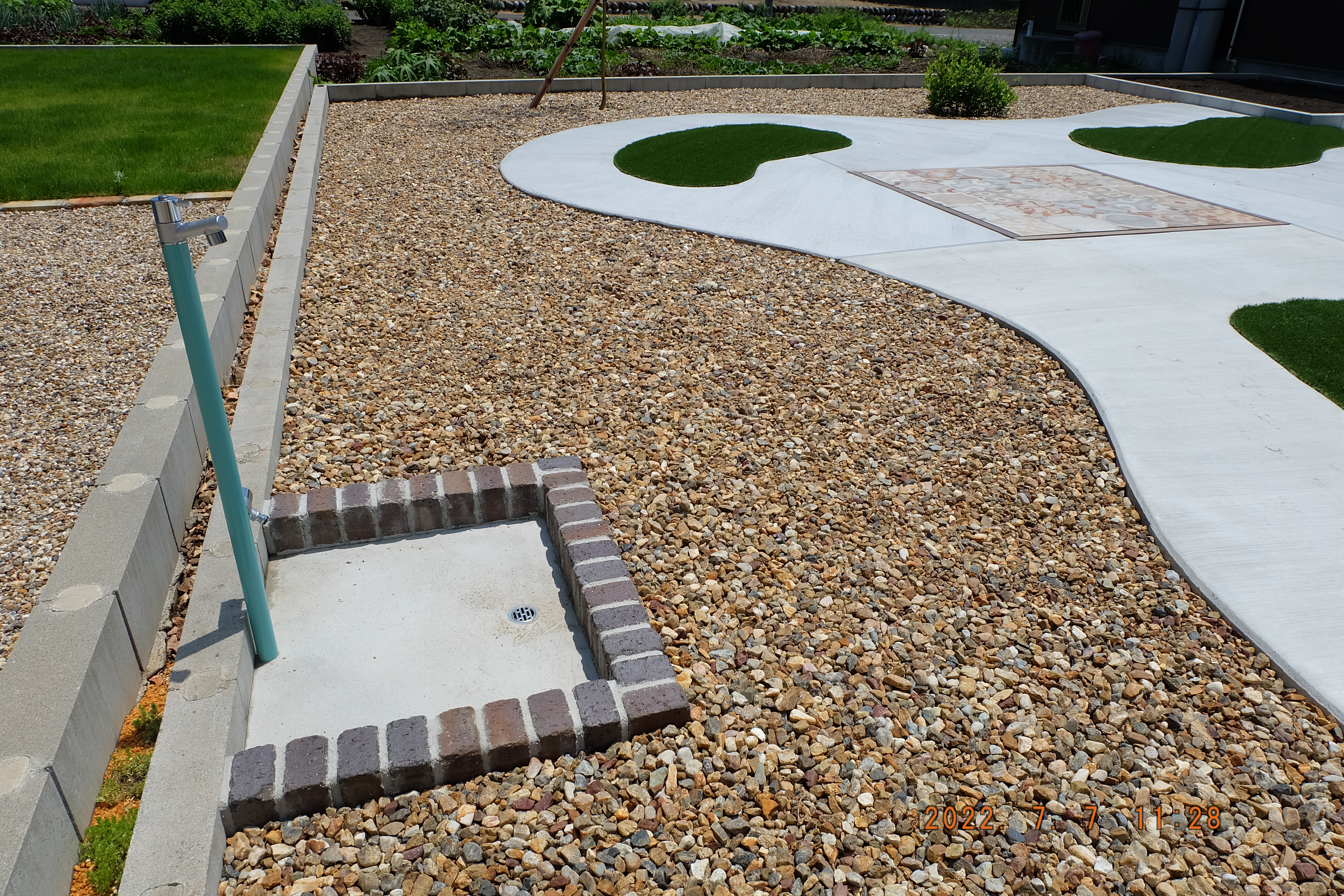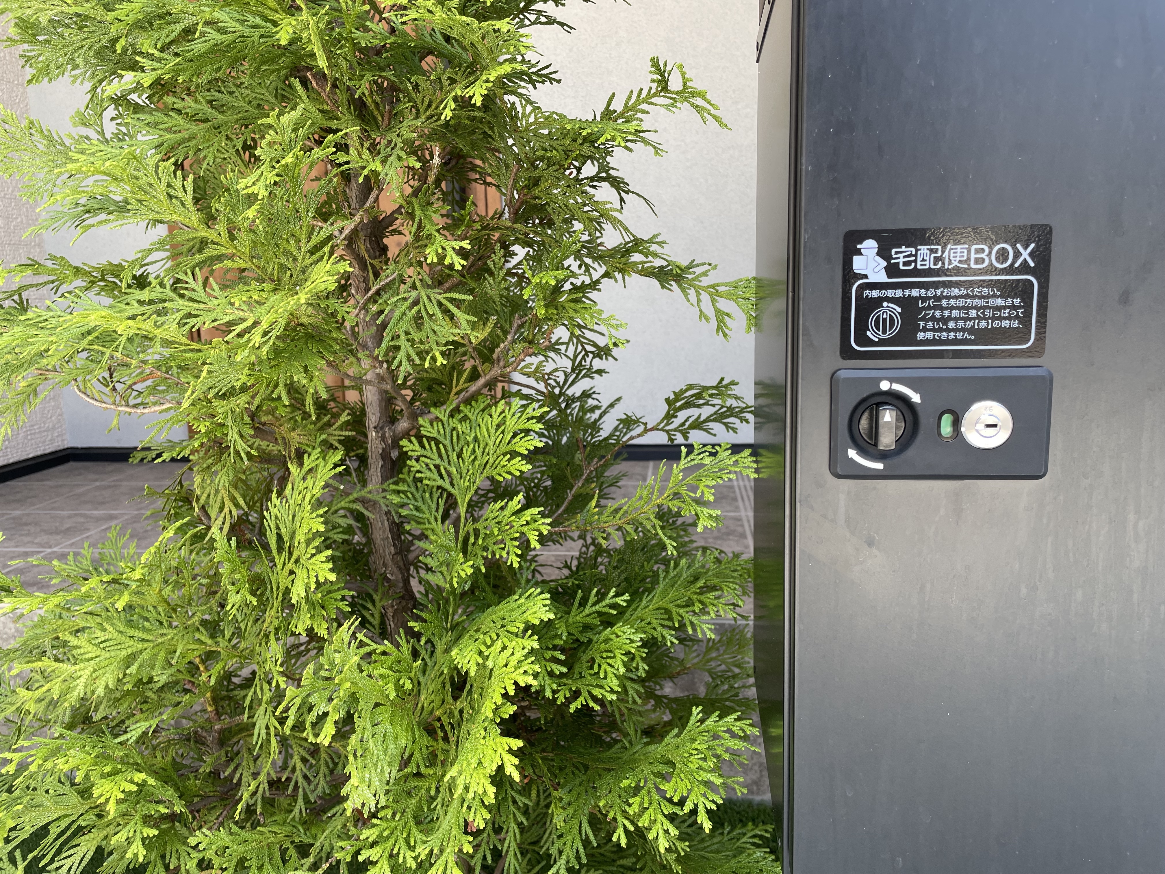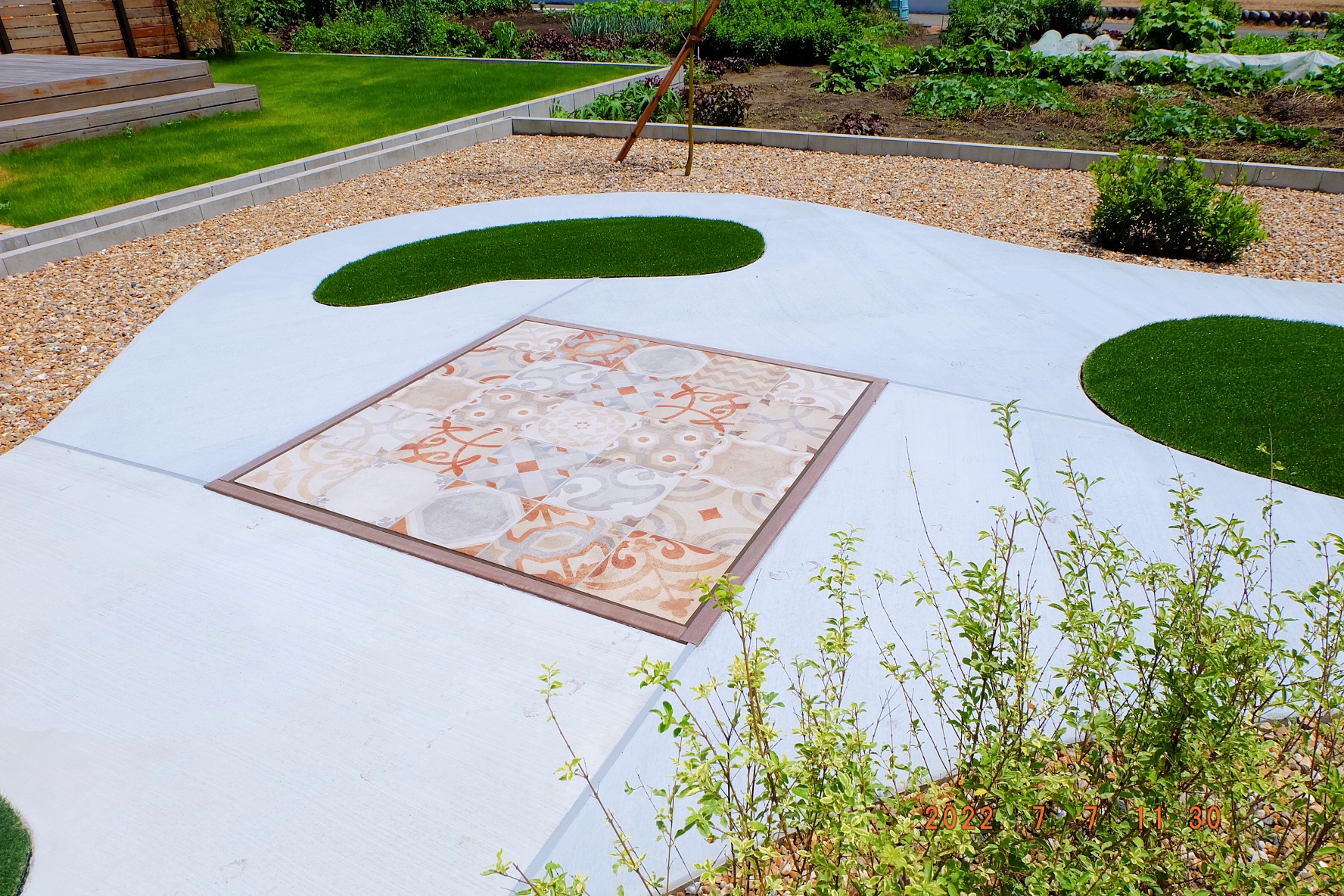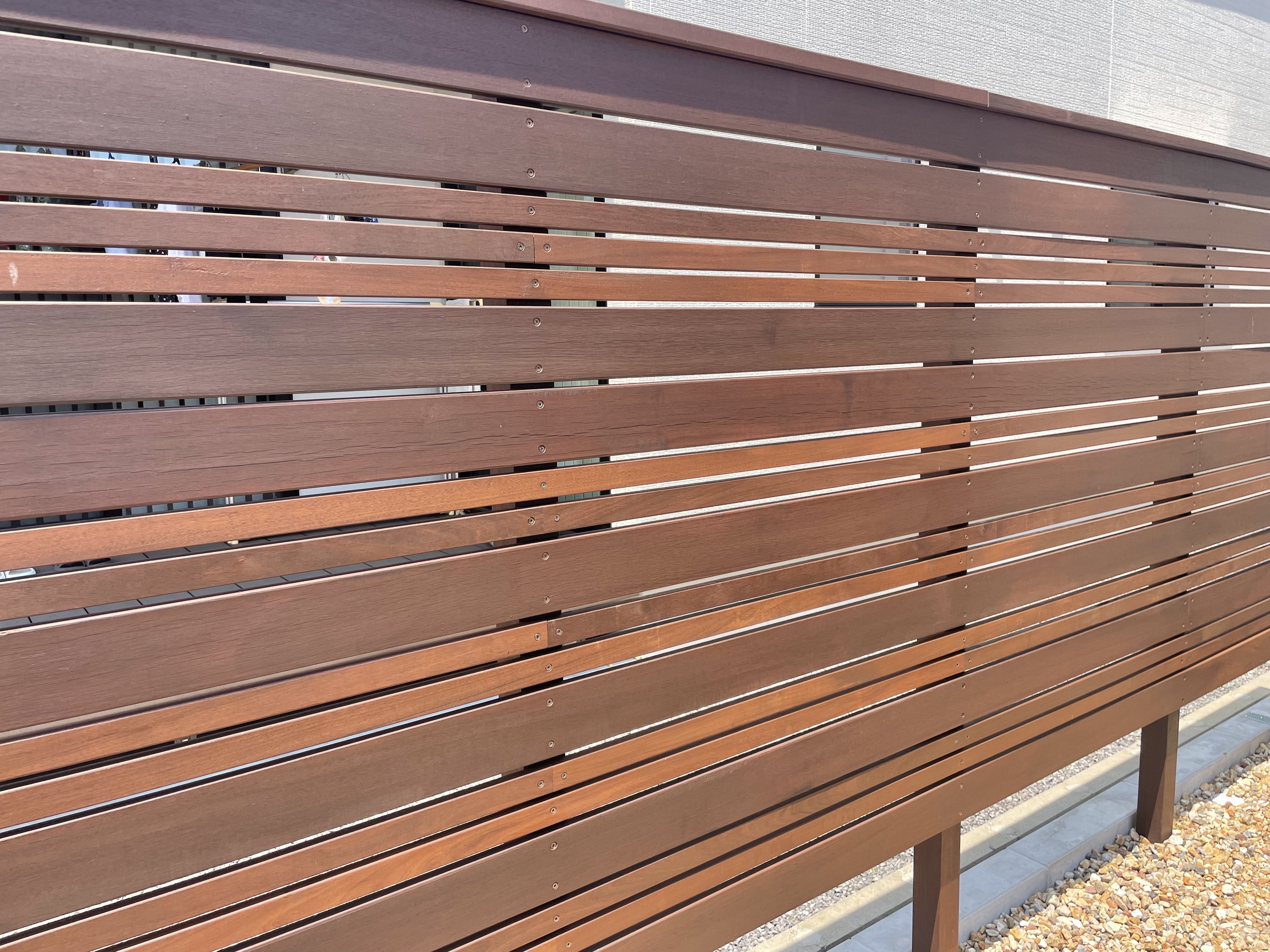目隠しフェンス/ウッドデッキ/モルタルデッキ/植栽工事/宅配ボックス リビングの窓越しに見える広いお庭 機能的に使う部分と意匠性を兼ね備えた管理しやすいお庭となりました 家族との思い出に残した手形と真鍮レターも素敵です また、目隠しフェンスでプライバシーをしっかり確保しました こちらもメンテナンスフリーの天然木です
