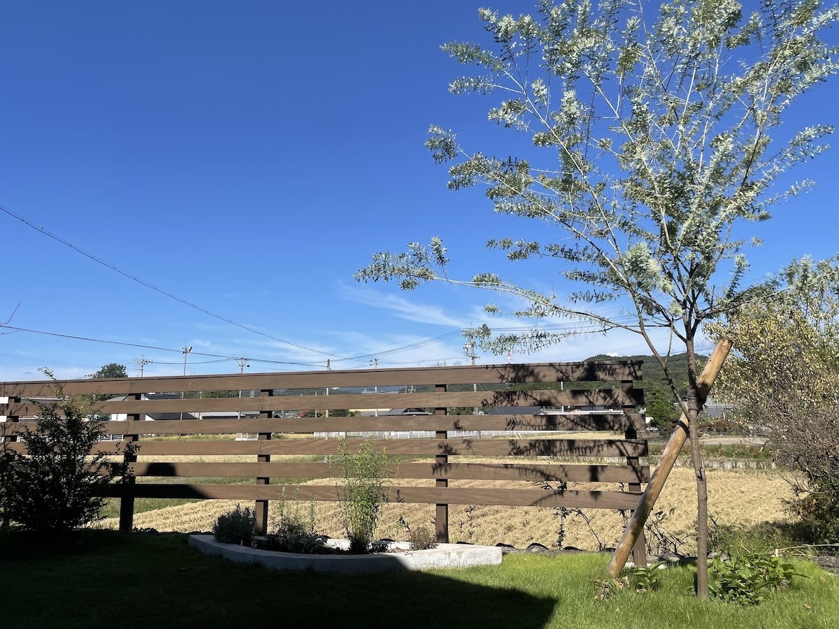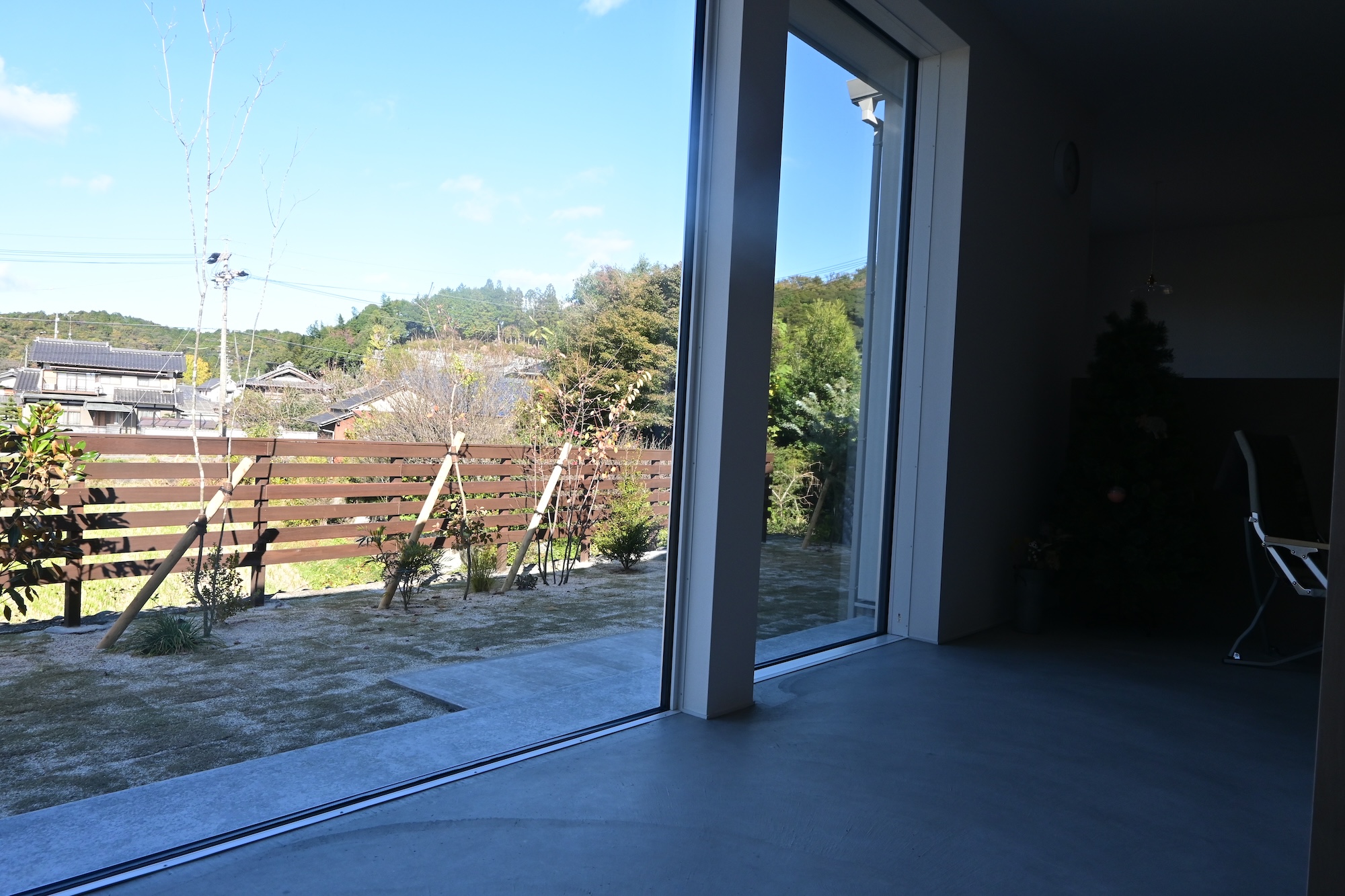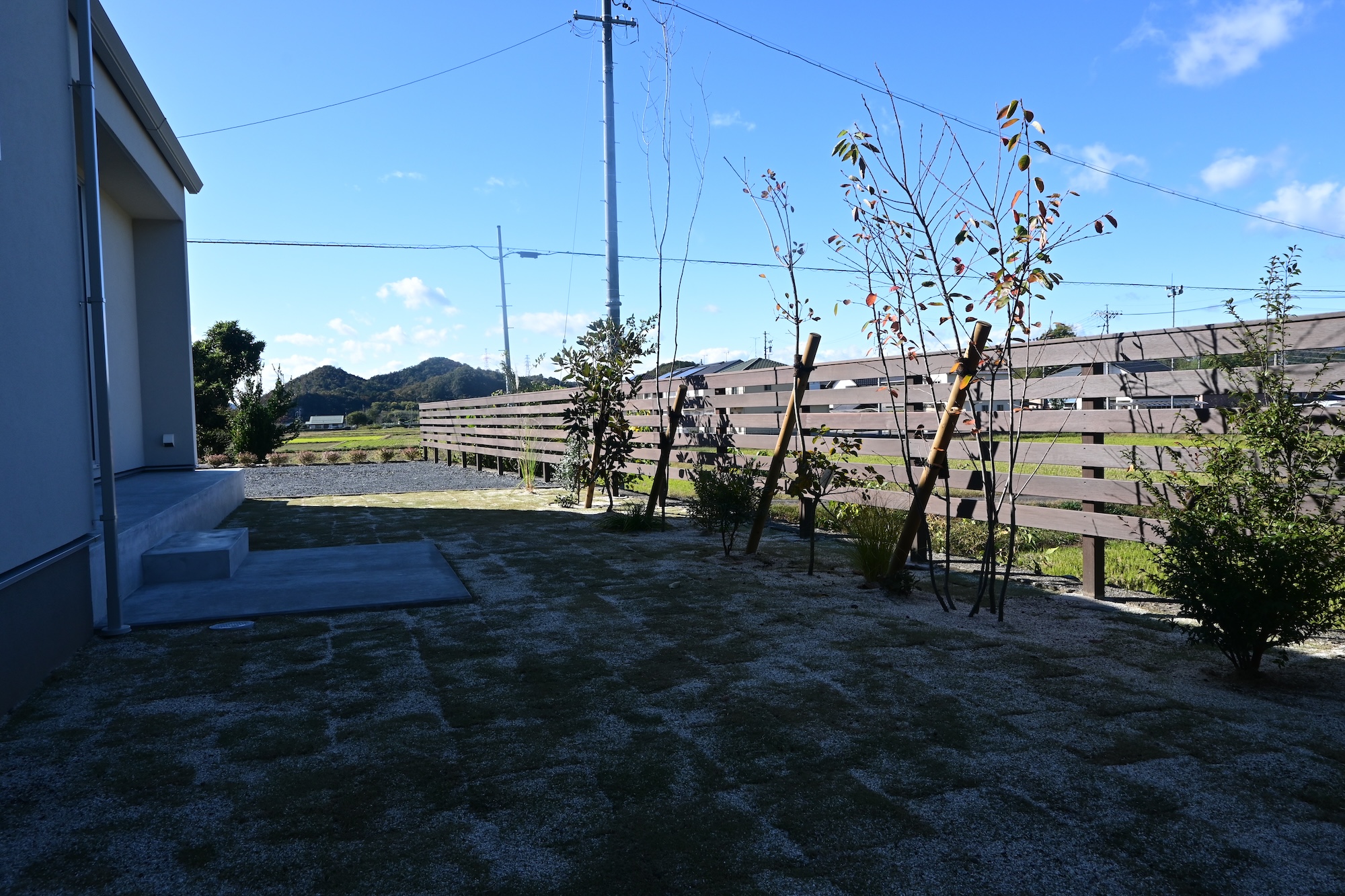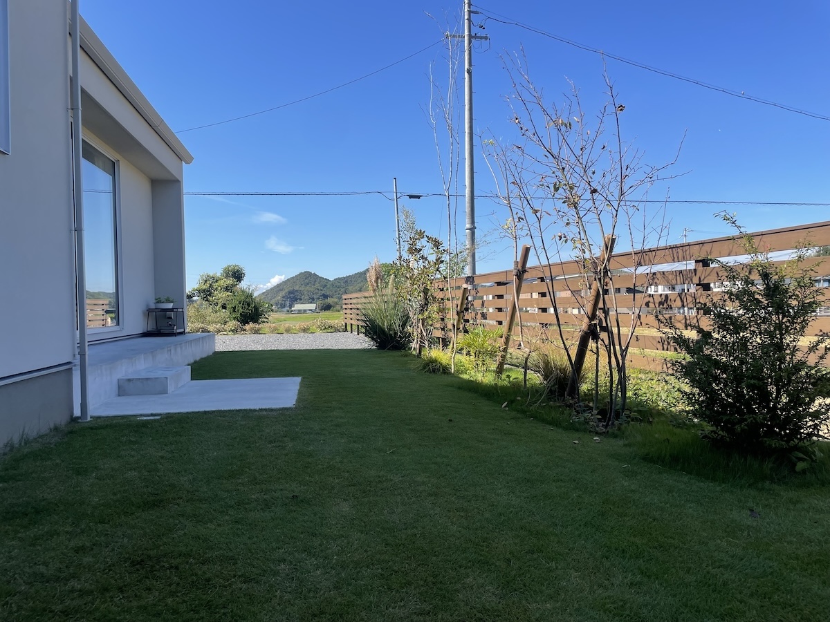 駐車場コンクリート/フェンス工事/植栽工事 芸術的に美しい白い家 この美しさを際立たせるため、差し引きの美学を研究しました 植物と自然の巡りを影や表情で家に落とし込むという 究極を極めたデザインとなりました ちょうど秋の影が美しい時期に家が完成して 納得の仕上がりになりました 樹木たちは落葉の時期なので緑の美しさはわかりませんが 落葉の樹木の枝を見せるにはいい時期です
