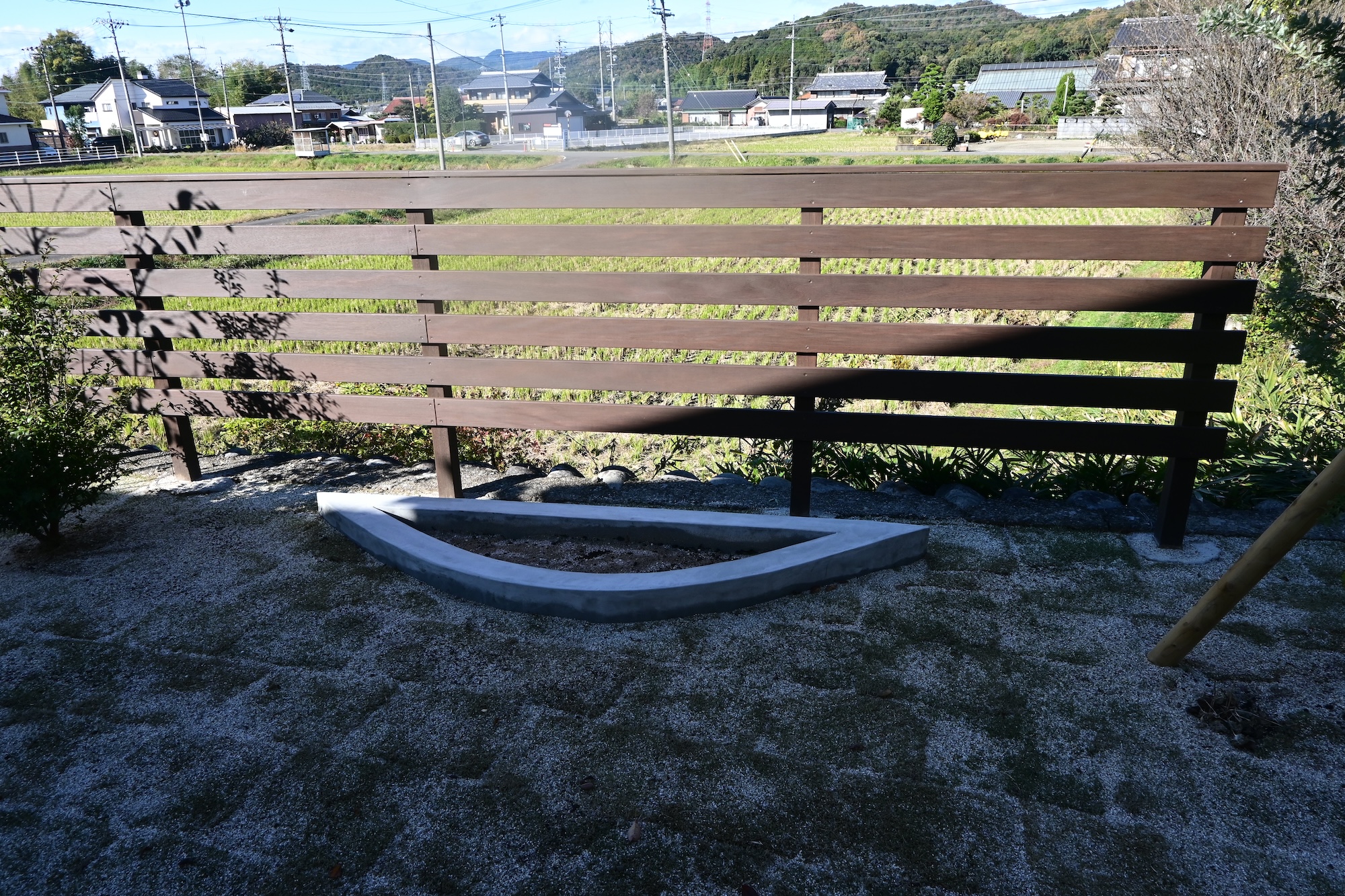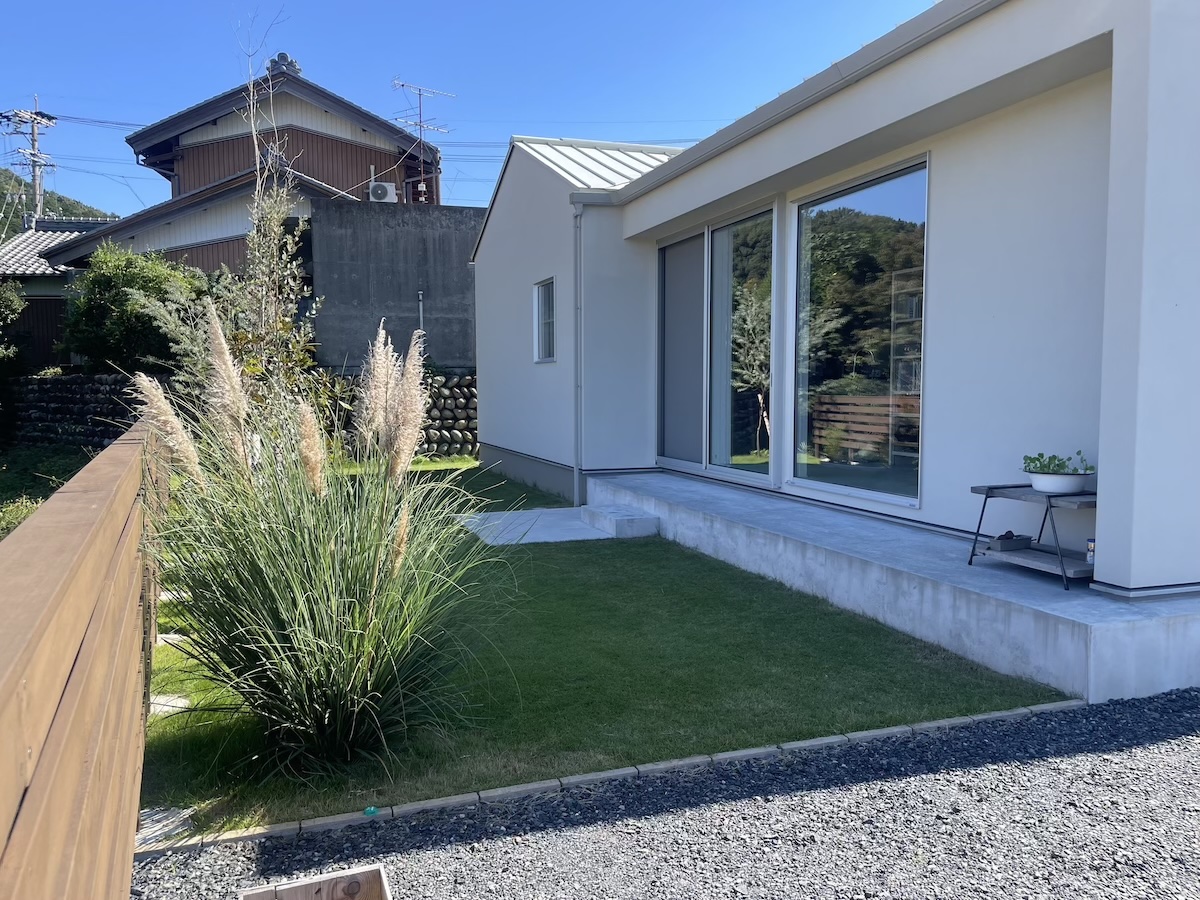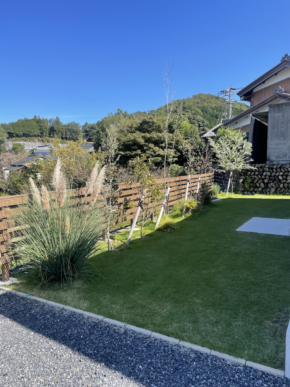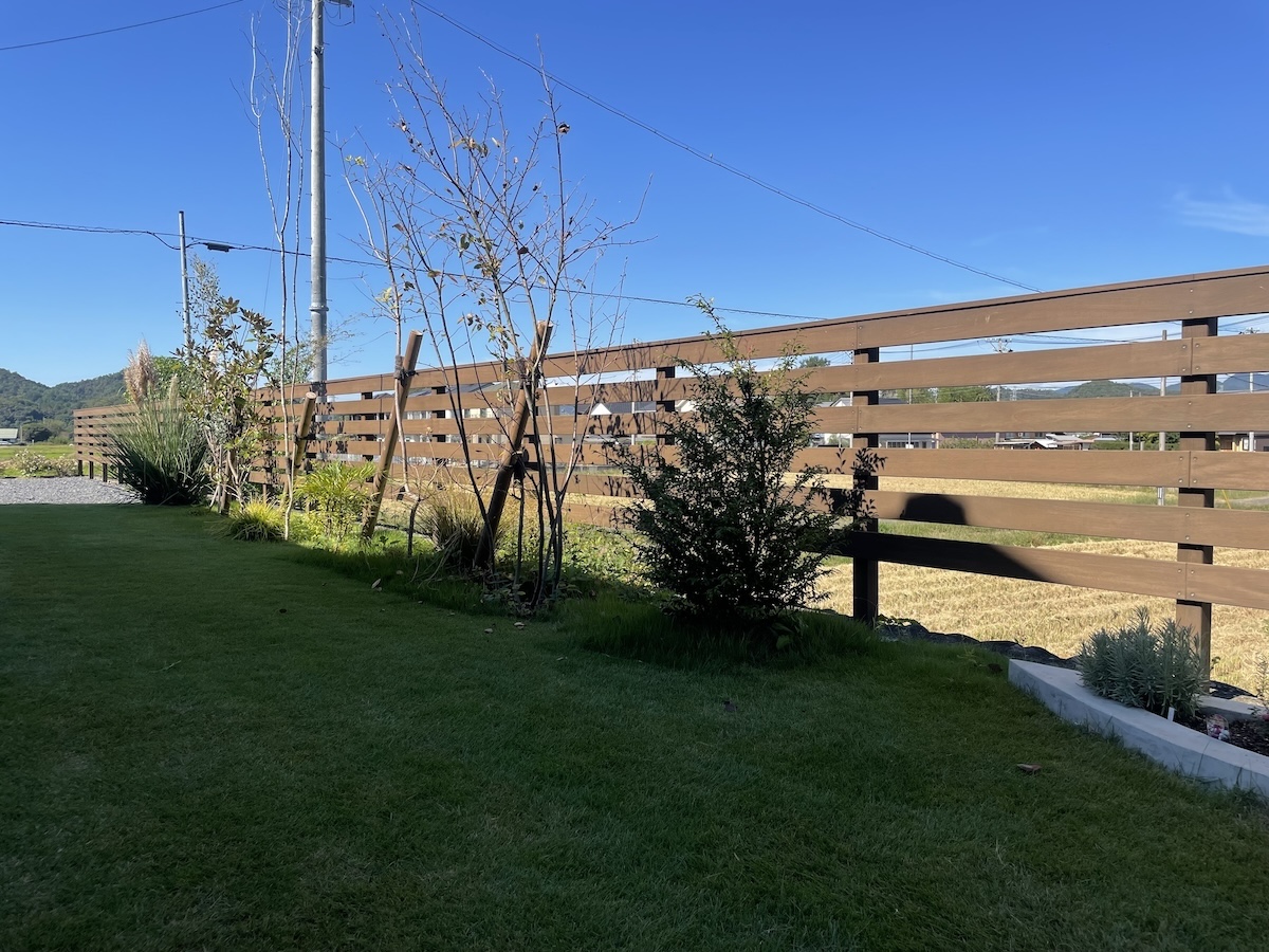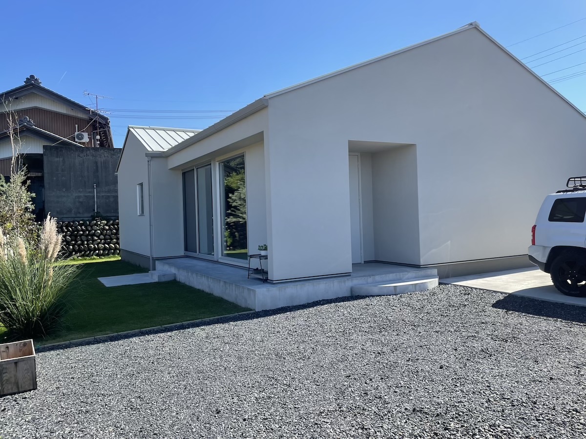 駐車場コンクリート/フェンス工事/植栽工事 芸術的に美しい白い家 この美しさを際立たせるため、差し引きの美学を研究しました 植物と自然の巡りを影や表情で家に落とし込むという 究極を極めたデザインとなりました ちょうど秋の影が美しい時期に家が完成して 納得の仕上がりになりました 樹木たちは落葉の時期なので緑の美しさはわかりませんが 落葉の樹木の枝を見せるにはいい時期です