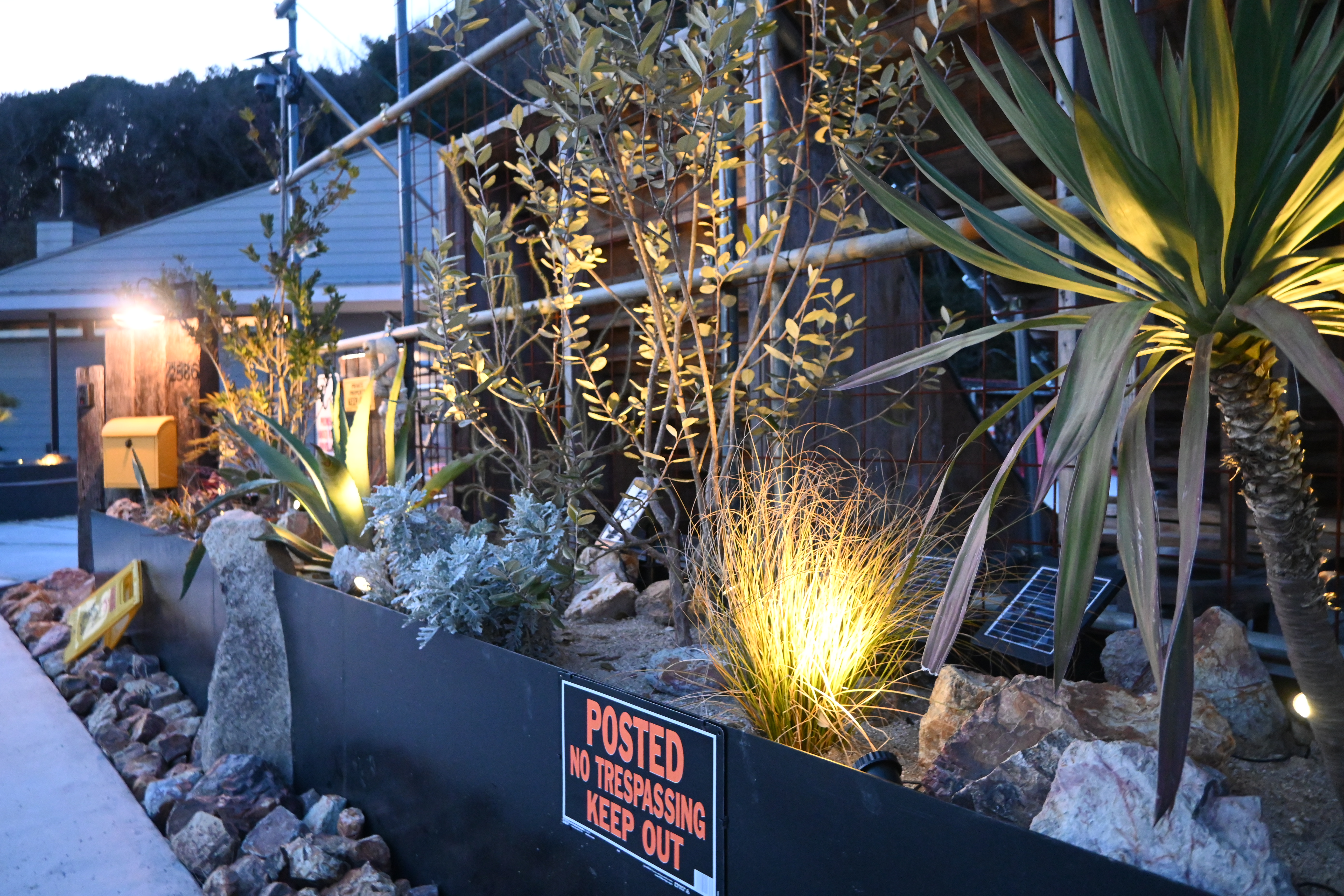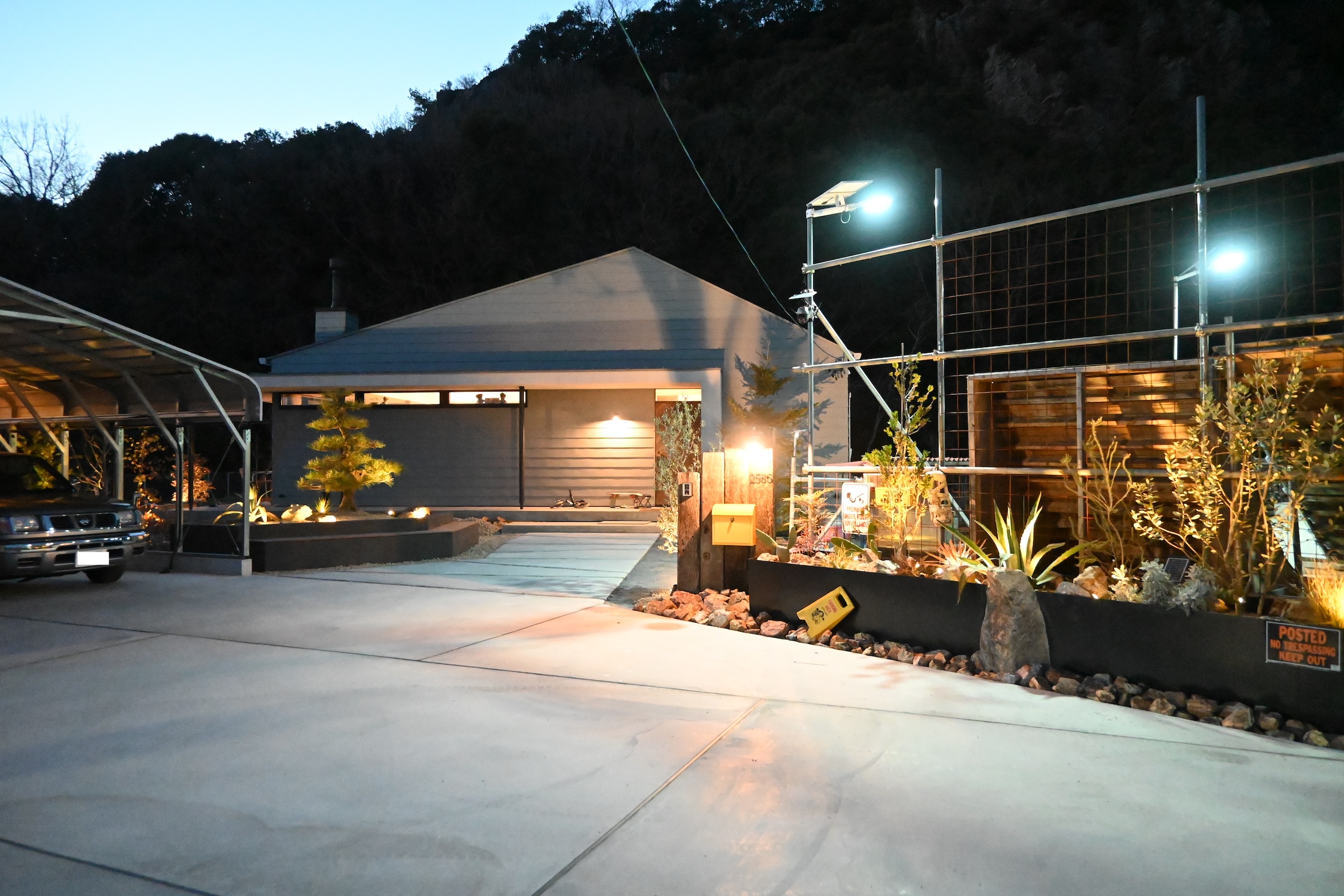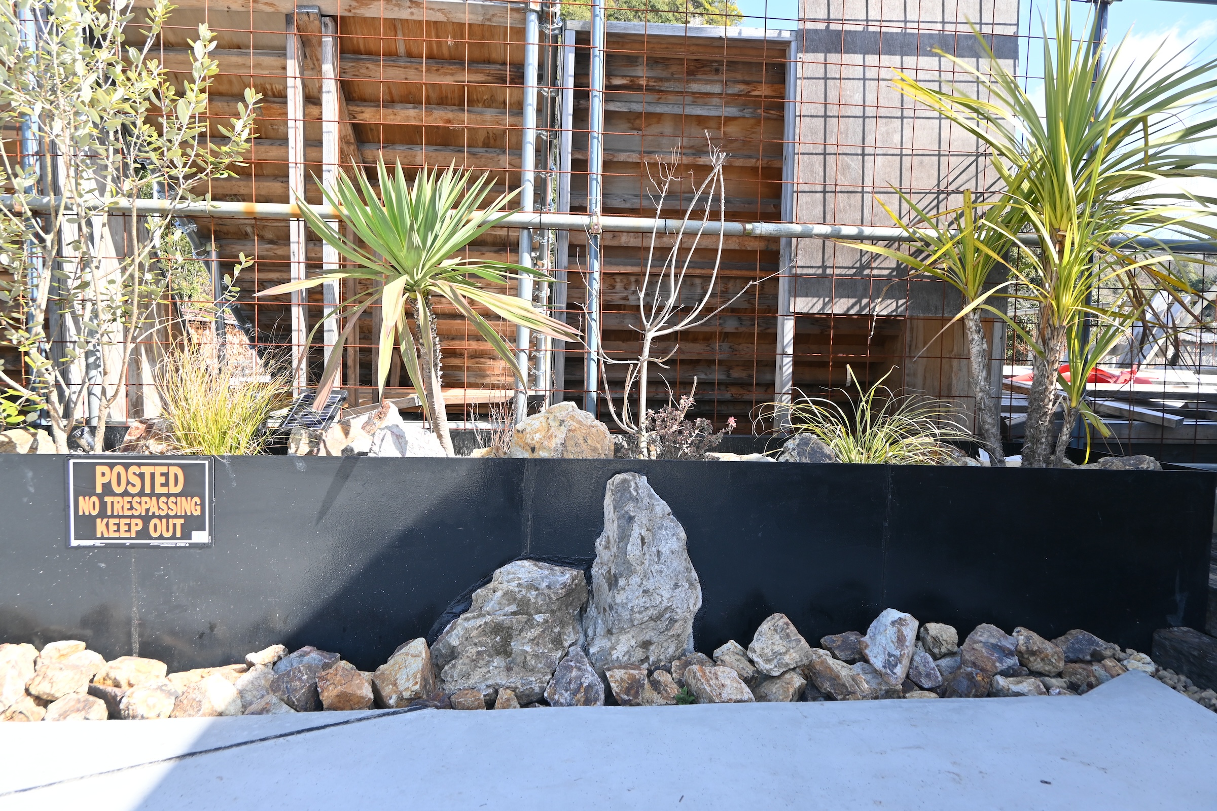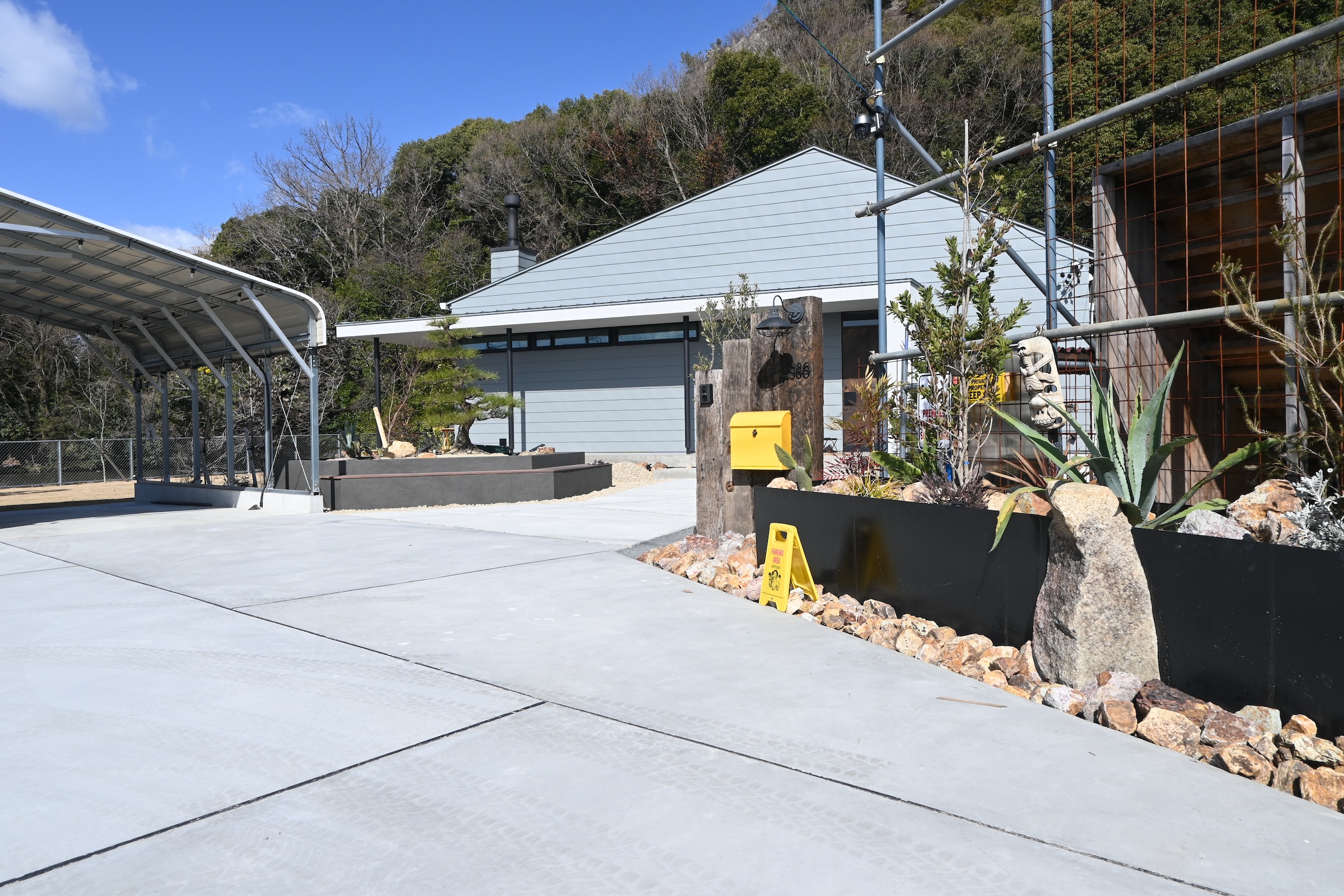 エントランスに並ぶ黒色の花壇は鉄板で創りました