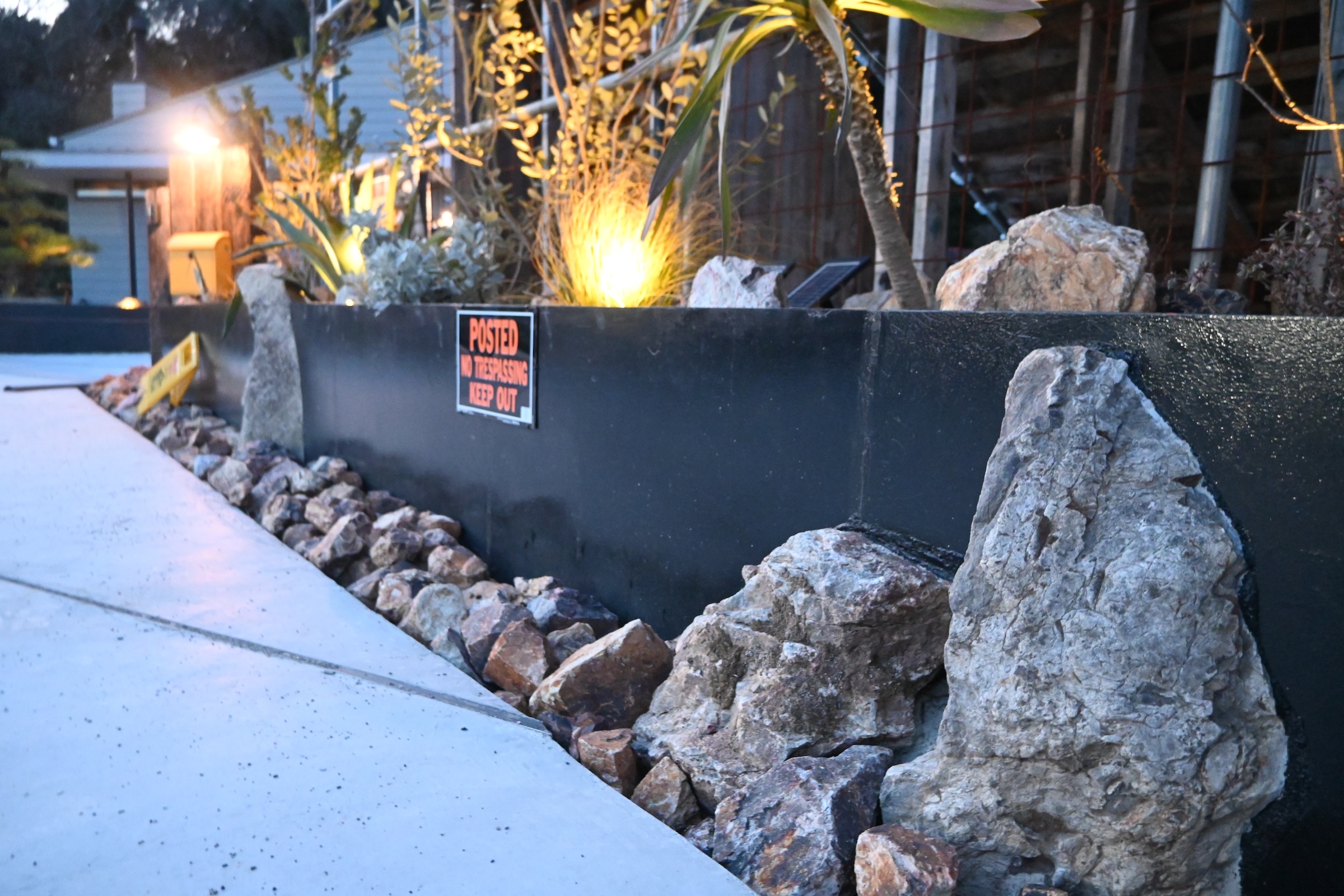 花壇となる鉄板に石を埋め込んでいて、借景となる岩山と調和を合わせています