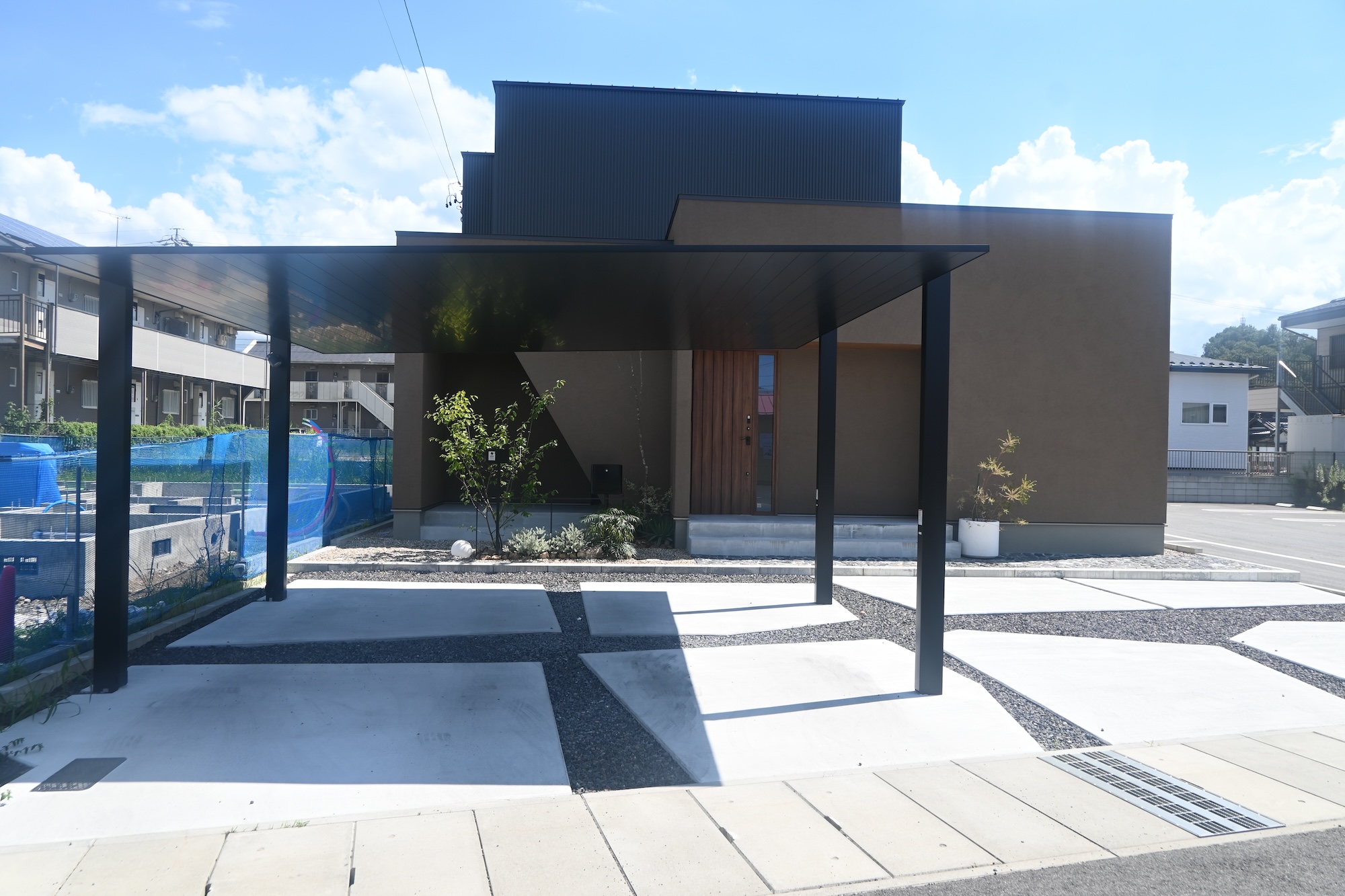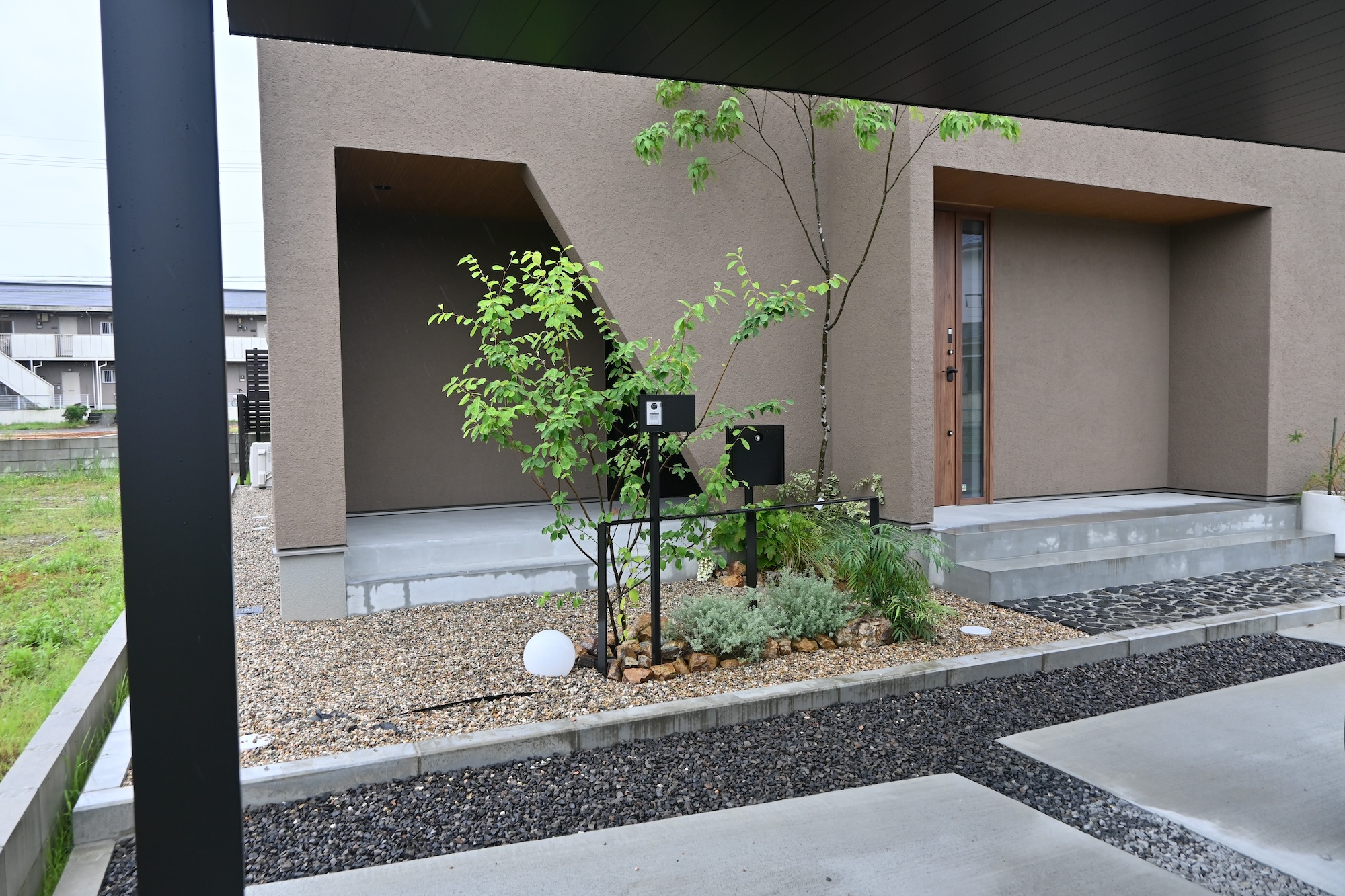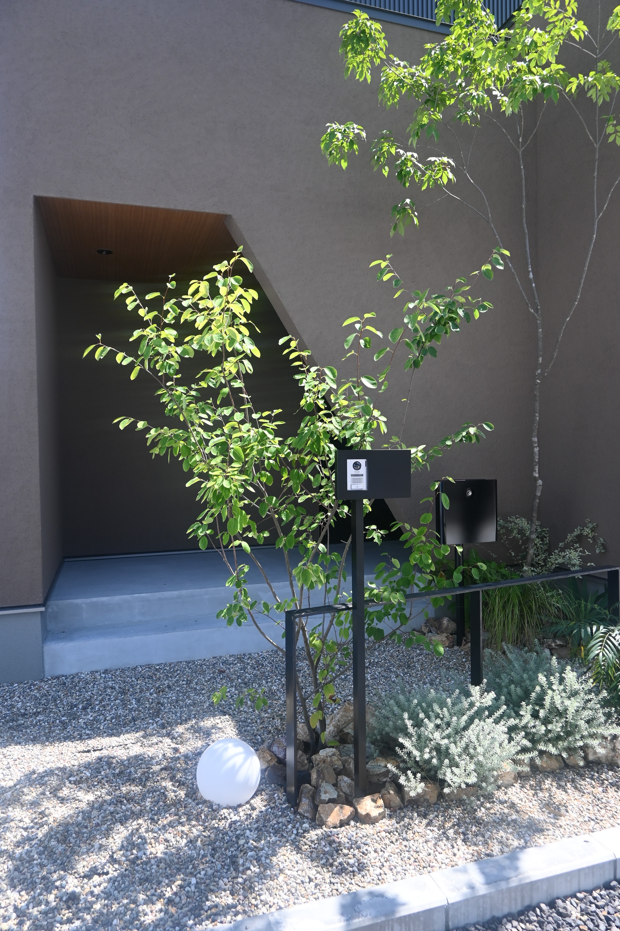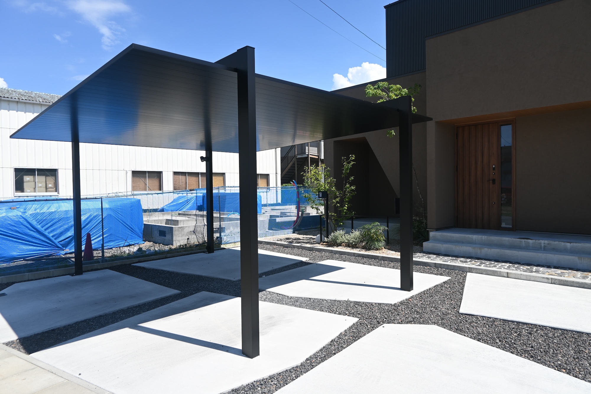 カーポート/門/変形コンクリート/植栽工事/タイルデッキ/目隠しフェンス 外観玄関の切り込みが入った壁が特徴的なお家 特徴的なデザインのお家のイメージを崩さないよう できるだけシンプルに シンプルだけど使う小物はしっかり主張のあるものを選びました カーポートは大人気のSCです お庭には芝生を一面張っています お庭は人目を気にせず過ごせるよう背の高いアルミの目隠しフェンスをしています タイルデッキは淡いグレーを使いました とてもスッキリしたデザインとなりました