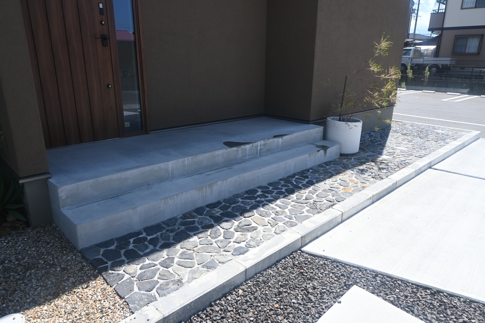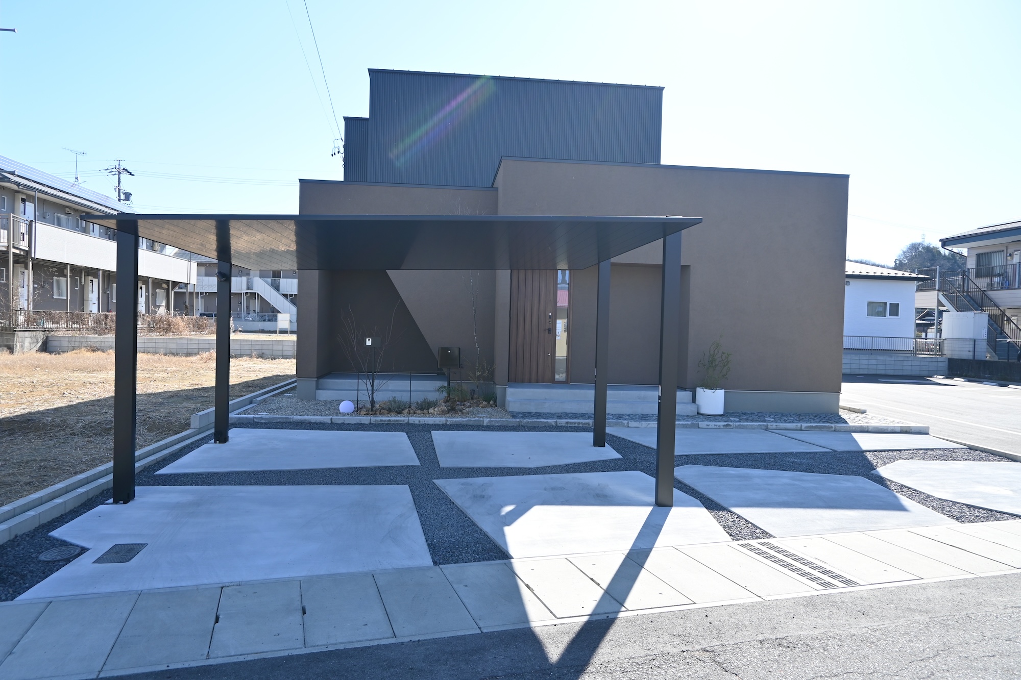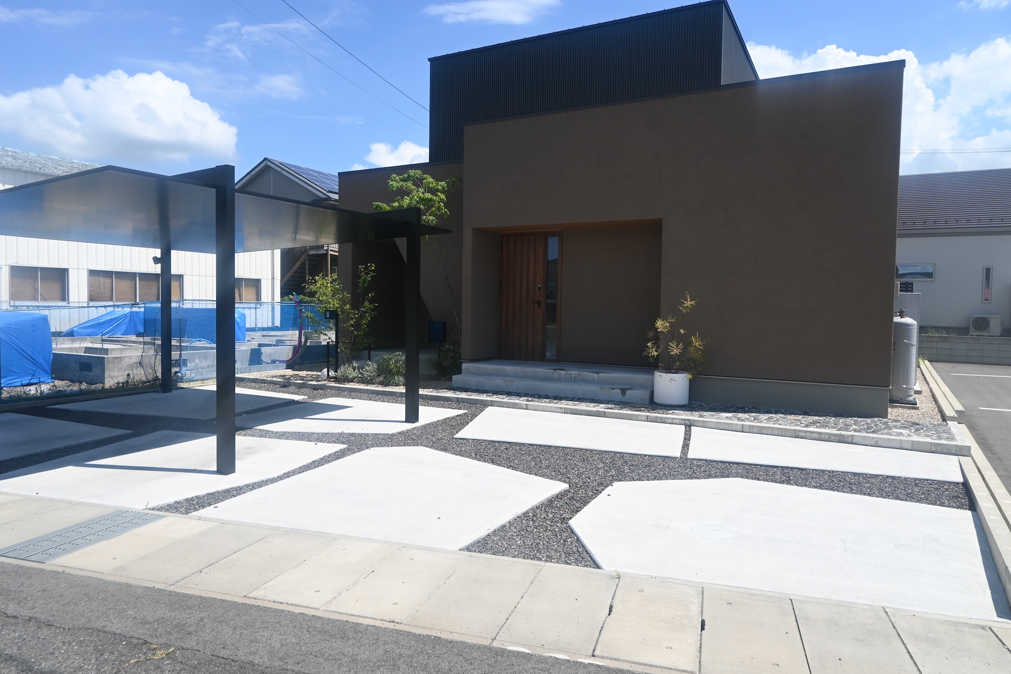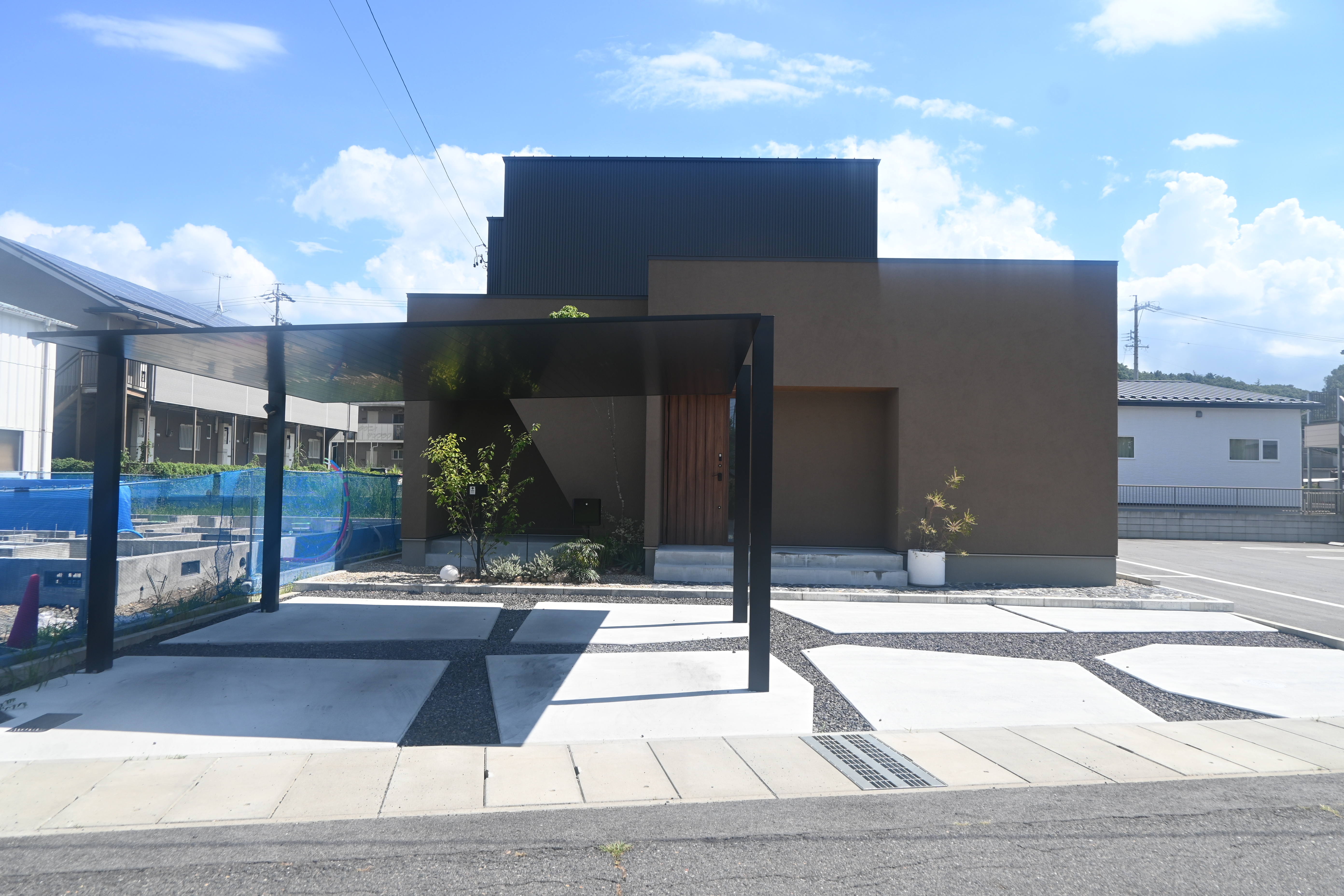 カーポート/門/変形コンクリート/植栽工事/タイルデッキ/目隠しフェンス 外観玄関の切り込みが入った壁が特徴的なお家 特徴的なデザインのお家のイメージを崩さないよう できるだけシンプルに シンプルだけど使う小物はしっかり主張のあるものを選びました カーポートは大人気のSCです お庭には芝生を一面張っています お庭は人目を気にせず過ごせるよう背の高いアルミの目隠しフェンスをしています タイルデッキは淡いグレーを使いました とてもスッキリしたデザインとなりました