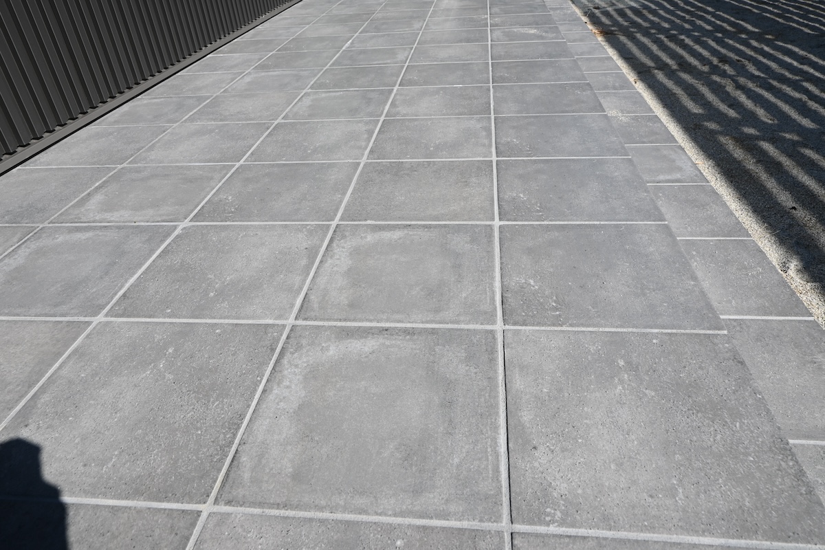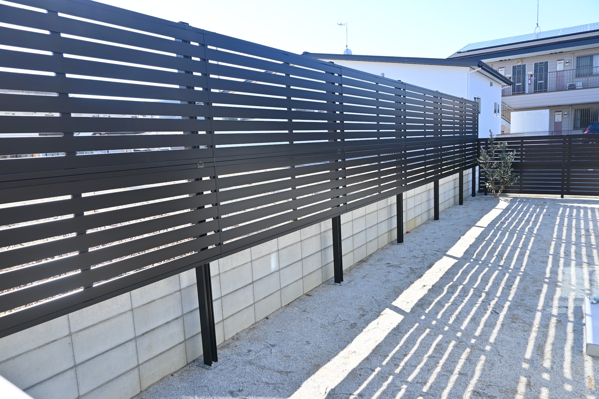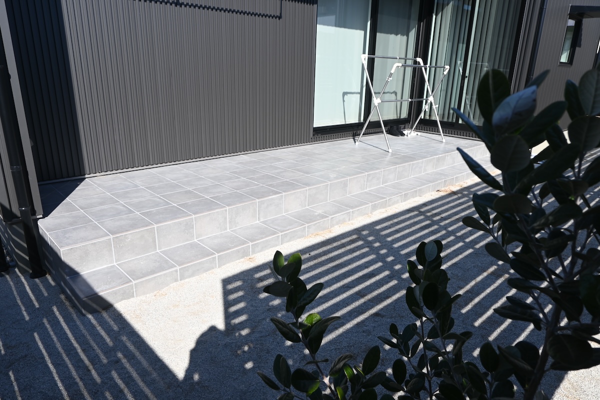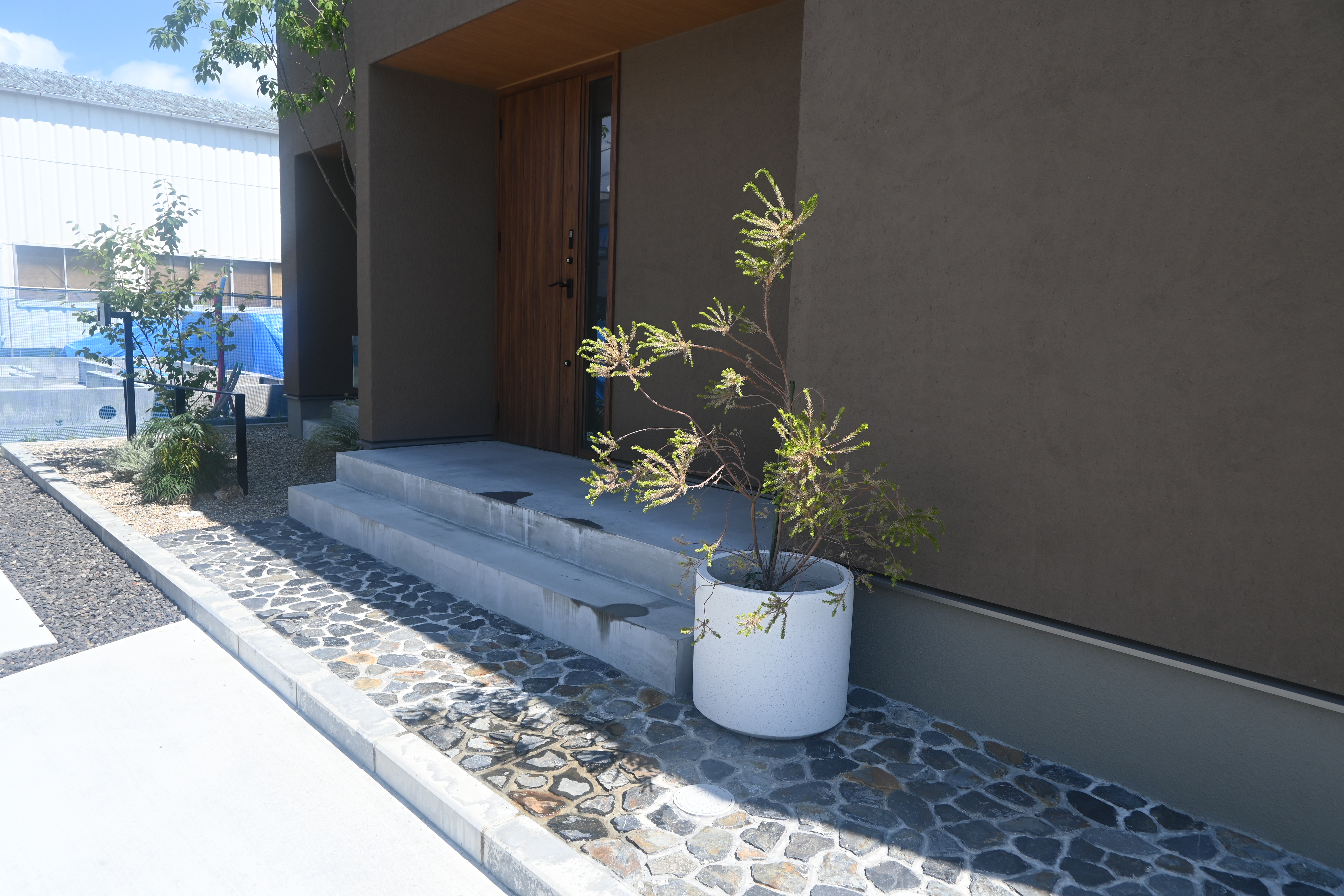 カーポート/門/変形コンクリート/植栽工事/タイルデッキ/目隠しフェンス 外観玄関の切り込みが入った壁が特徴的なお家 特徴的なデザインのお家のイメージを崩さないよう できるだけシンプルに シンプルだけど使う小物はしっかり主張のあるものを選びました カーポートは大人気のSCです お庭には芝生を一面張っています お庭は人目を気にせず過ごせるよう背の高いアルミの目隠しフェンスをしています タイルデッキは淡いグレーを使いました とてもスッキリしたデザインとなりました