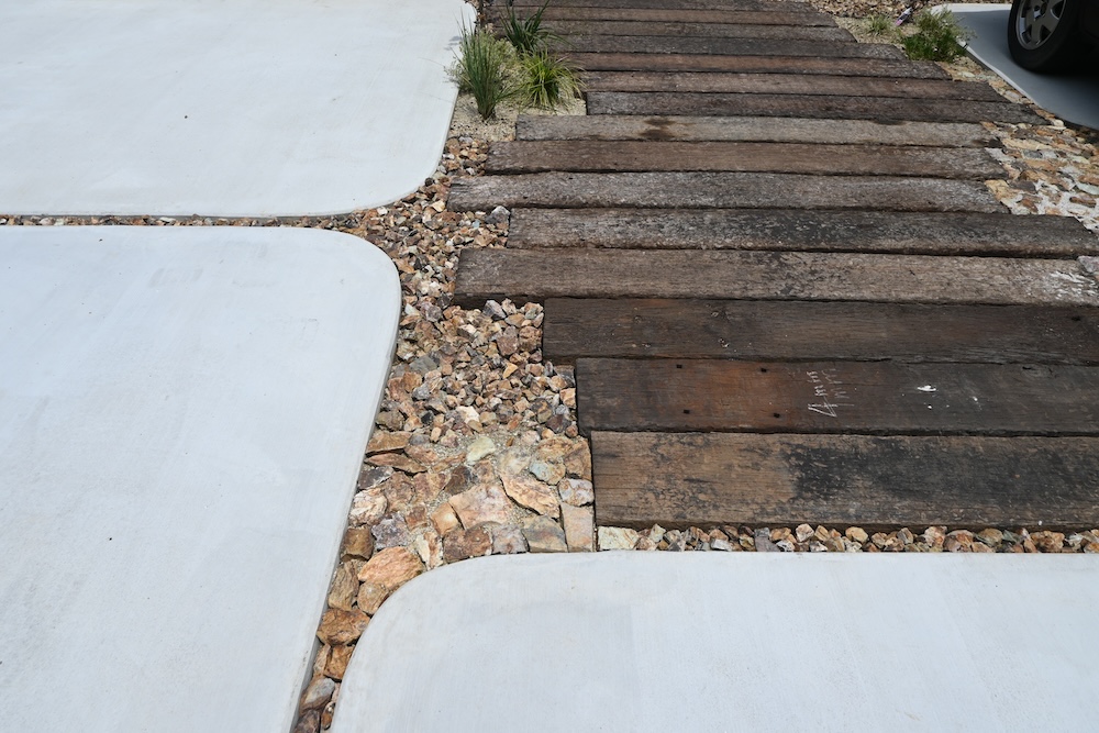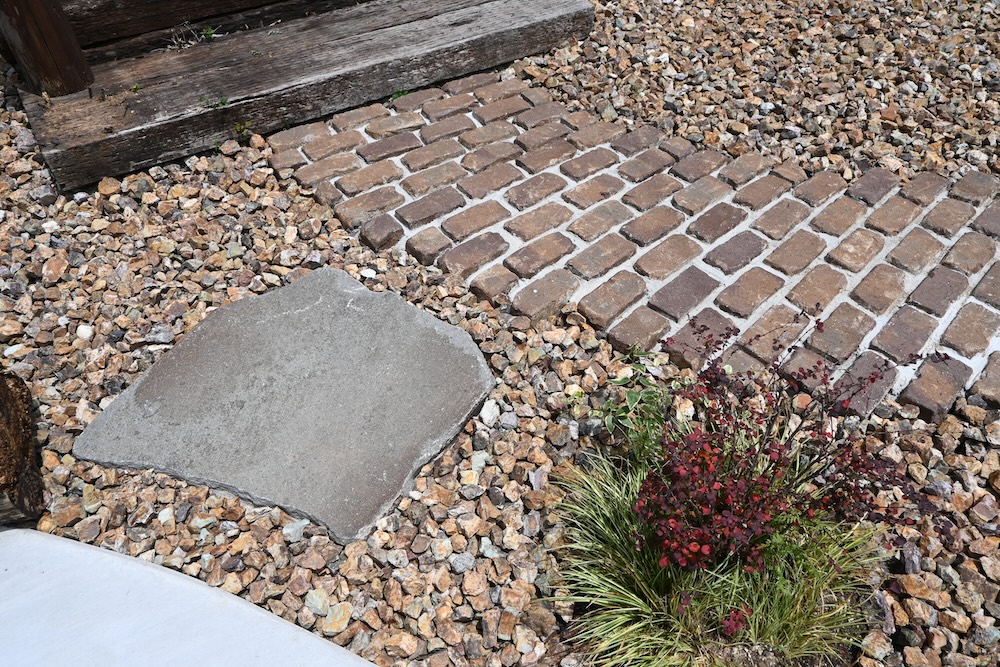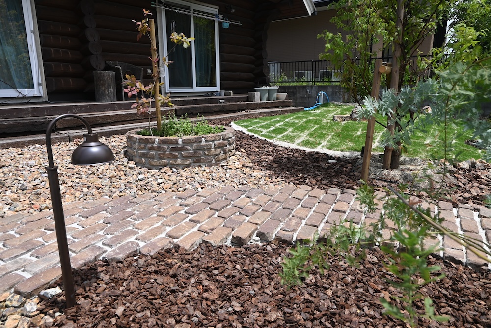 アプローチはレンガと古木の枕木を使っています