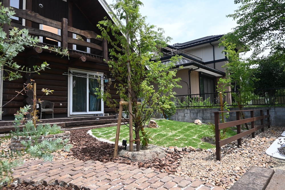 ログハウスの自然あふれる庭