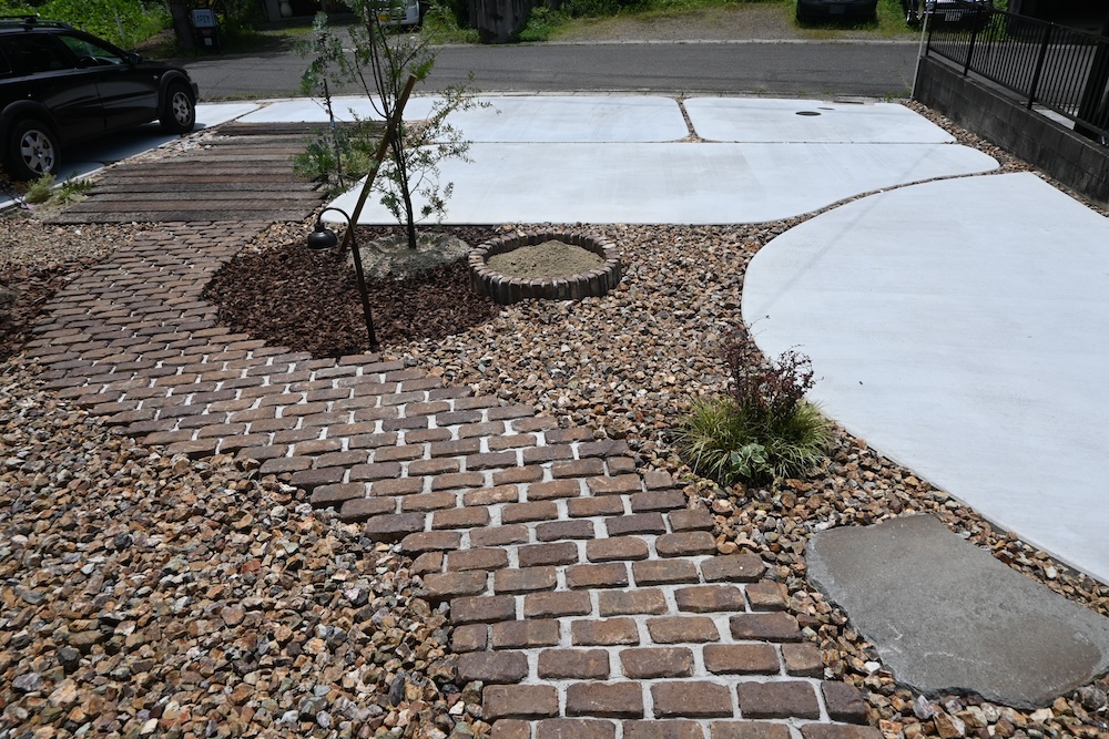 駐車場/フェンス/雑木の庭/レンガアプローチ/枕木アプローチ