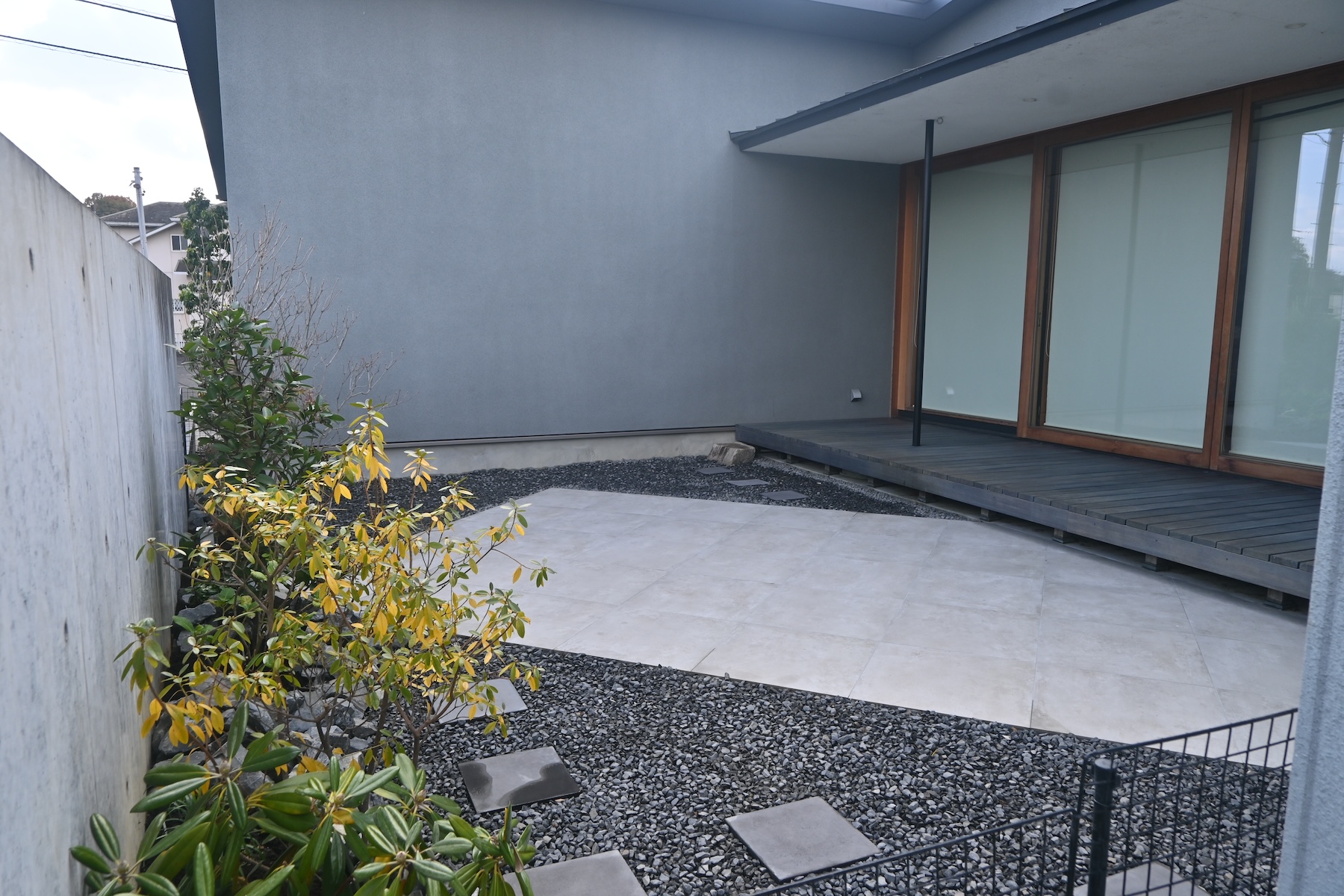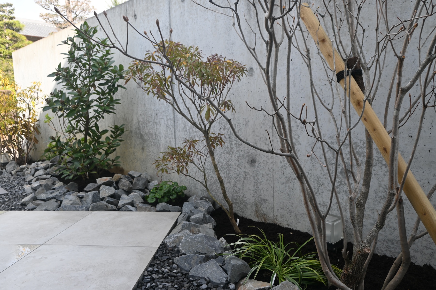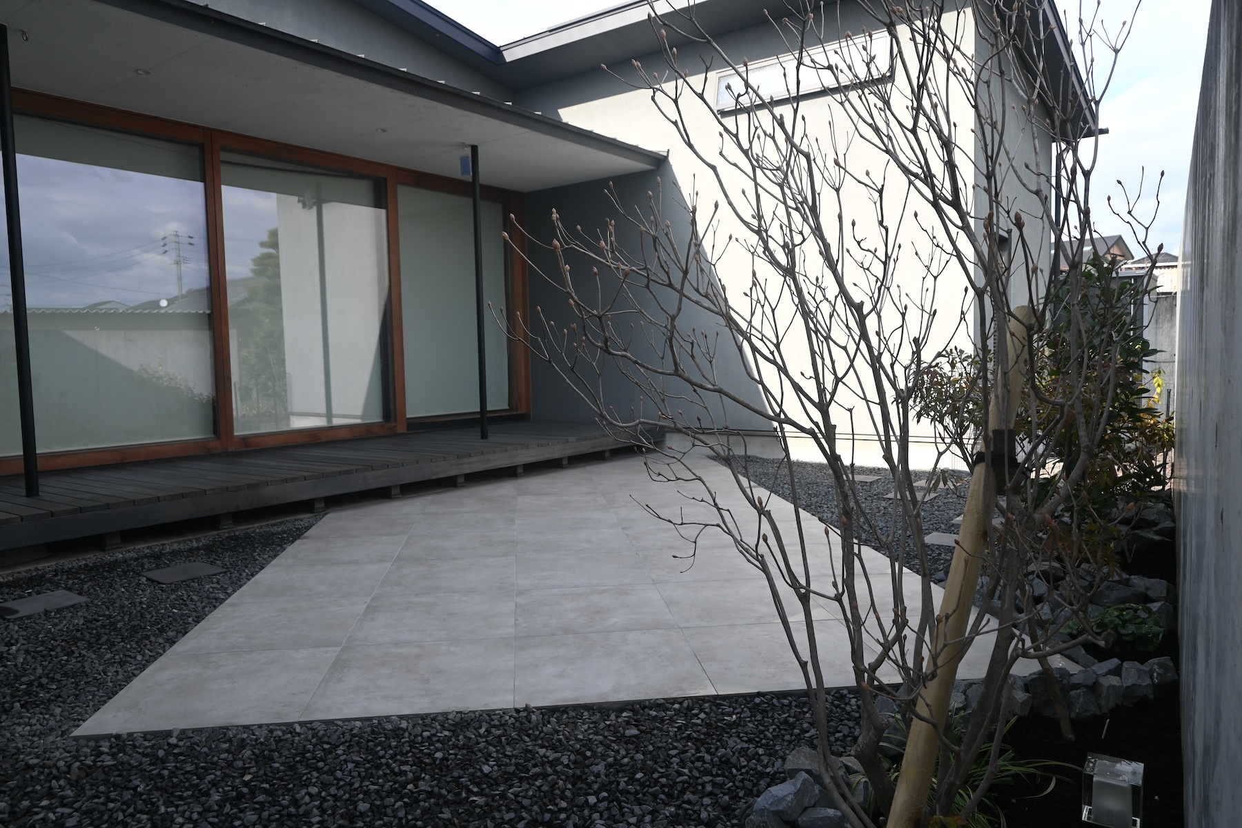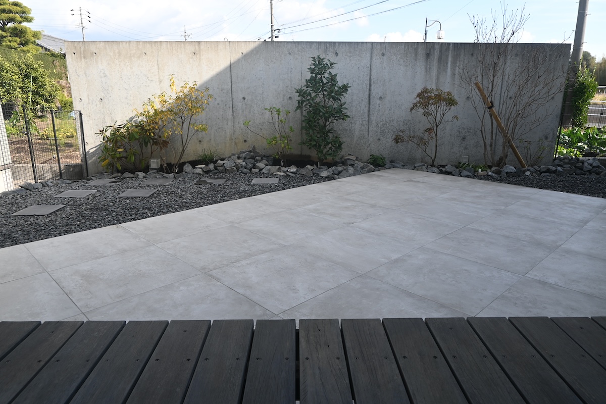 タイルデッキ/植樹 既存の芝貼りと大きな木のあるお庭から一新、モダンなくつろげるお庭に リフォームさせていただきました 植物は山採りの優しい枝と葉の樹木を選びモダンな空間に柔らかさを演出します 夜はライティングで壁面に映る落葉した枝が浮かび上がり、昼のお庭と違った お庭空間が出来上がりました お客様がお庭を見られるようにリビングのソファを移動したそうです お庭の効果を実感していただけて非常に嬉しいです