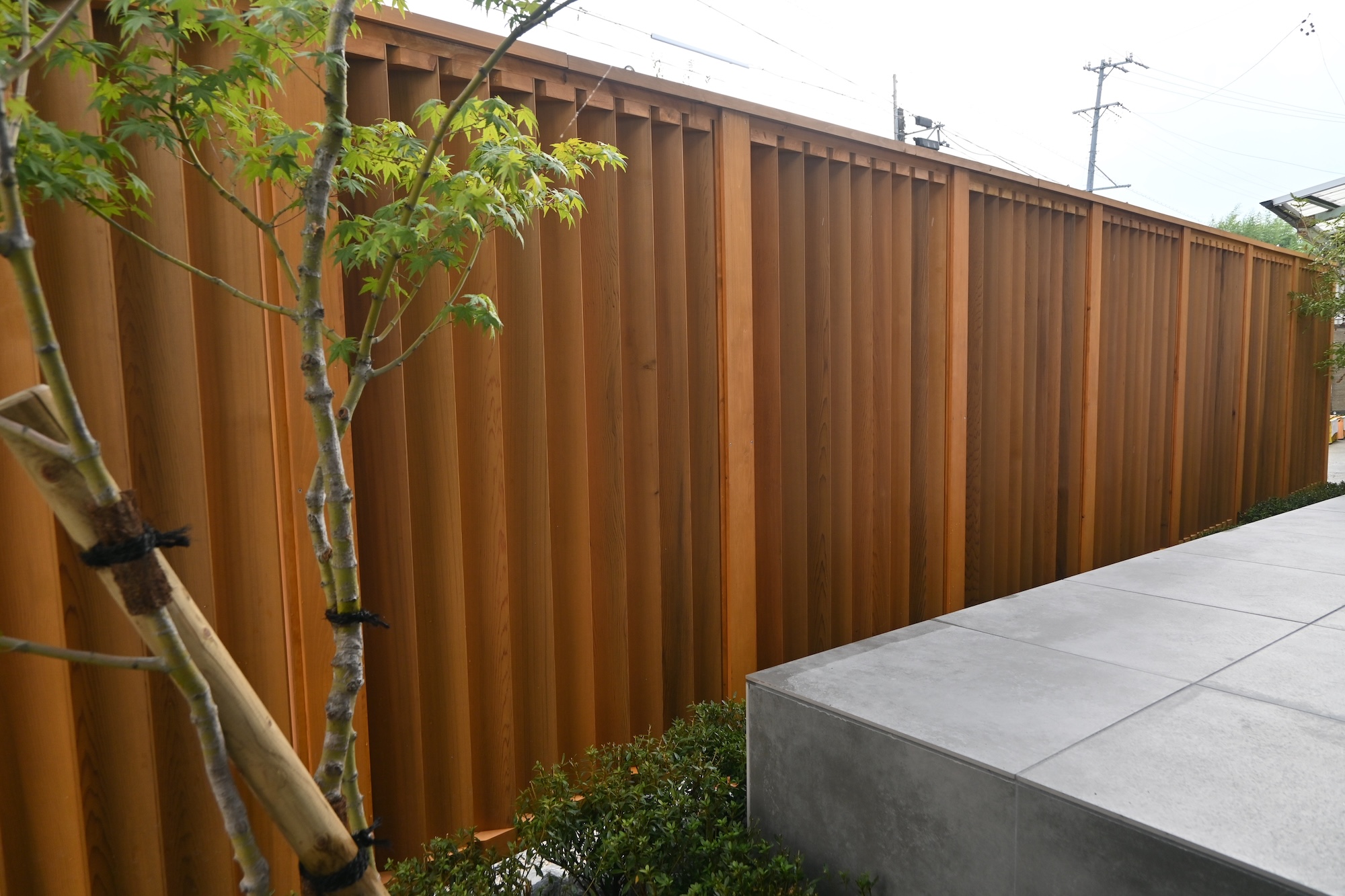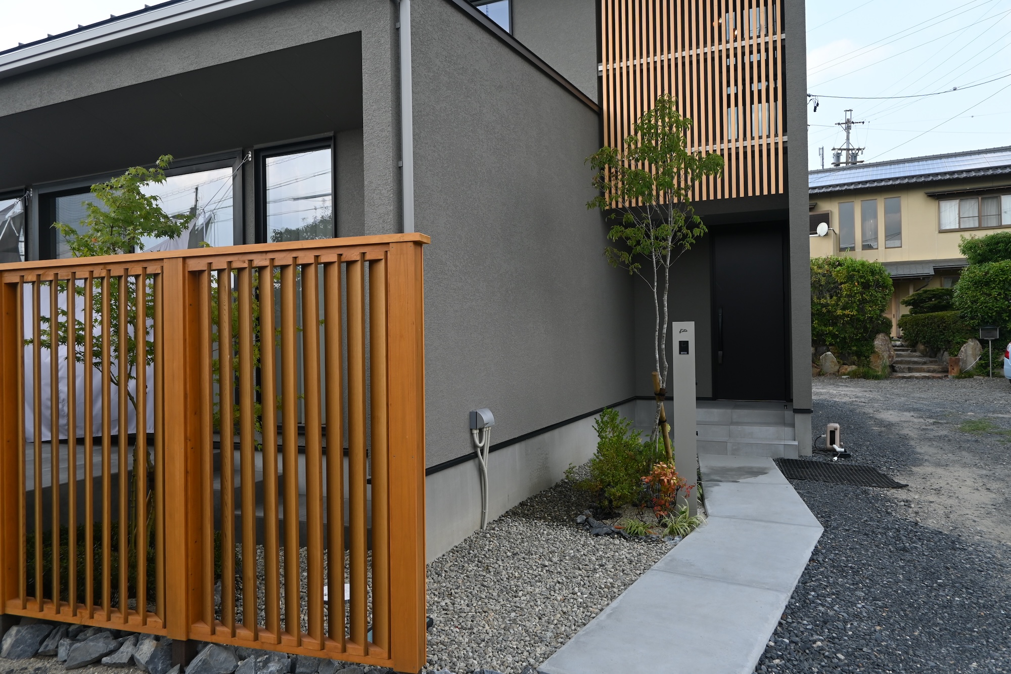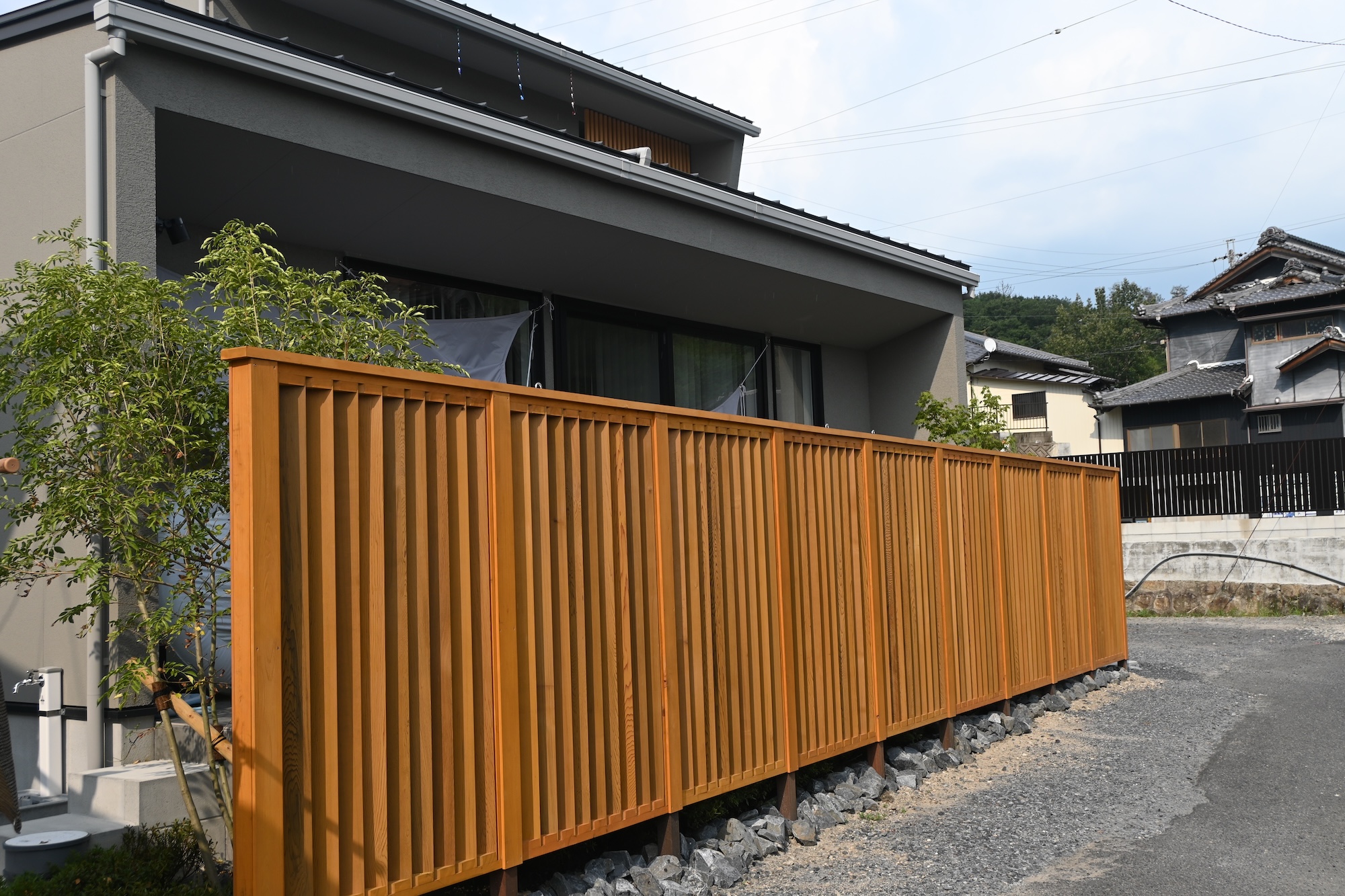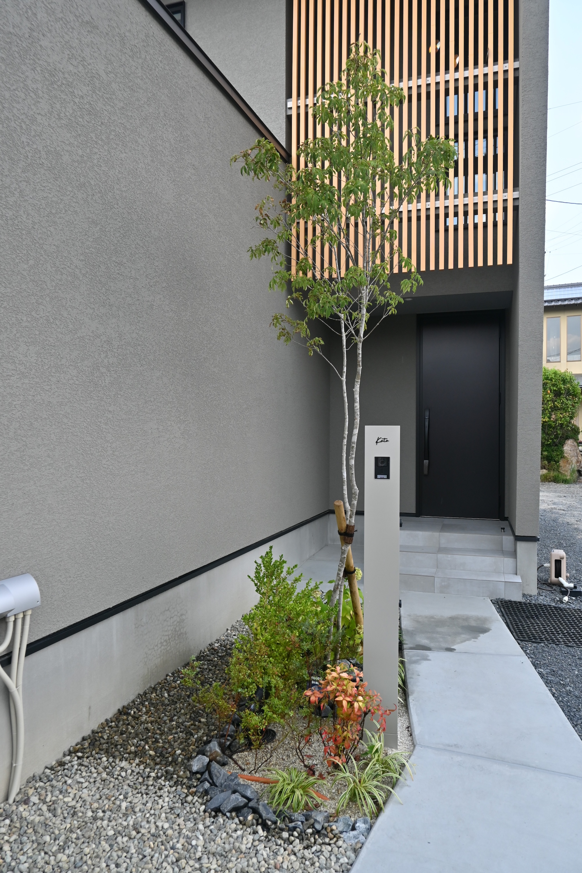 縦格子のフェンス/タイルデッキ/門柱/植栽植え込み